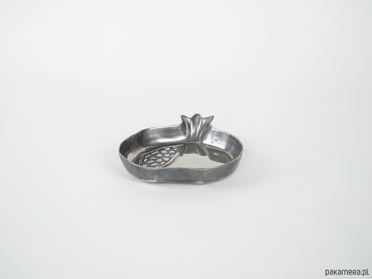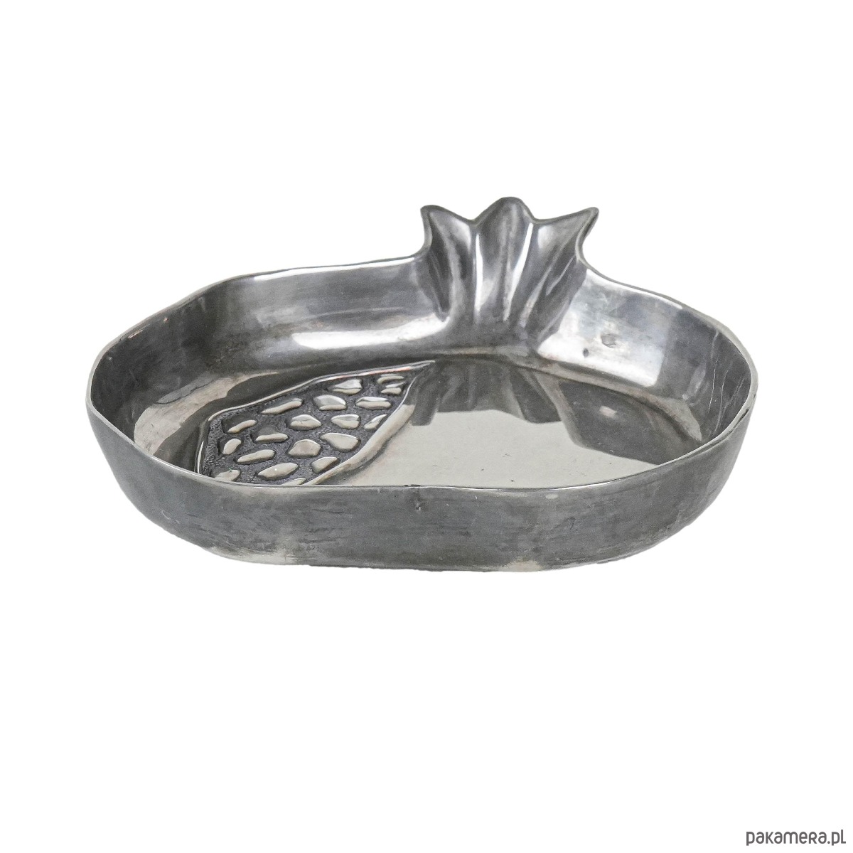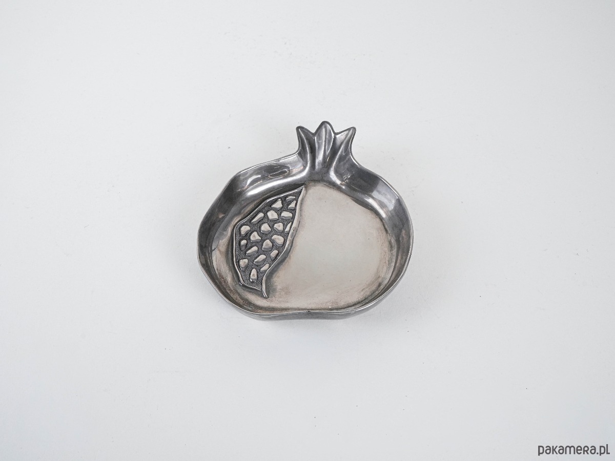 Dekoracyjna paterka Silea w formie owocu granatu, wykonana z metalu posrebrzanego. Ręczne tłoczenie wewnątrz misy nadaje jej charakteru i unikatowości, a symbolika granatu – owocu obfitości i życia – czyni z niej nie tylko praktyczny, ale i symboliczny element dekoracyjny. Idealna do serwowania drobnych przekąsek lub jako ozdobny akcent wnętrza.