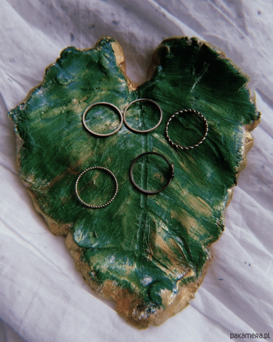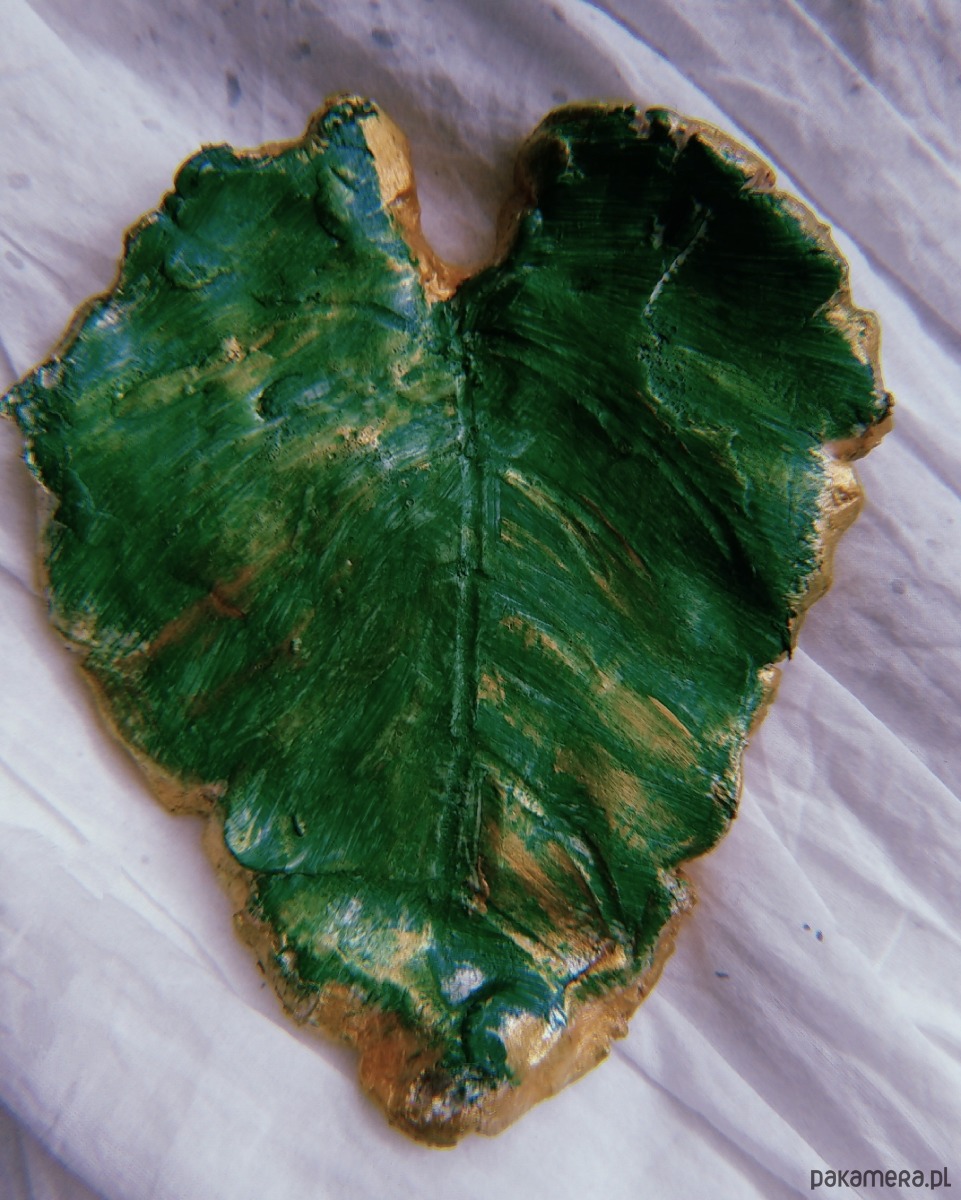 Gliniana podstawka na biżuterię, w kolorze zieleni oraz złota, w kształcie liścia (ale też serca), niezwykle trwała i uniwersalna. Niech żyje natura!