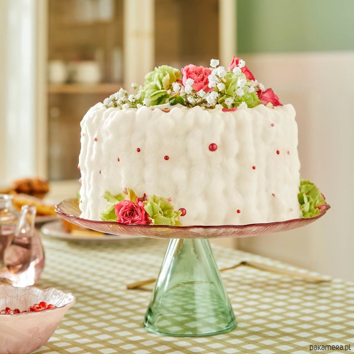 Patera na ciasto, szklana, różowo-zielona, Fleur de rose, 28 cm