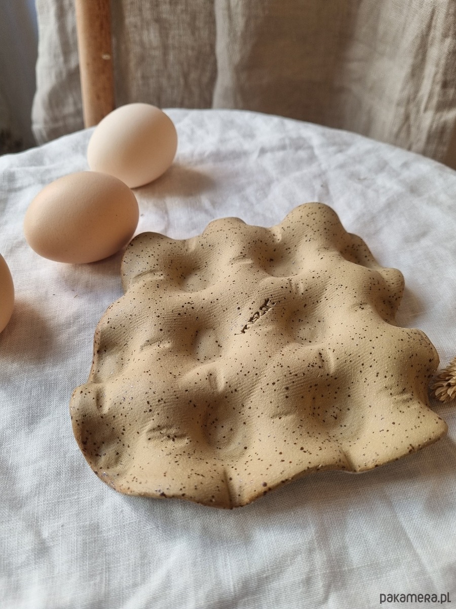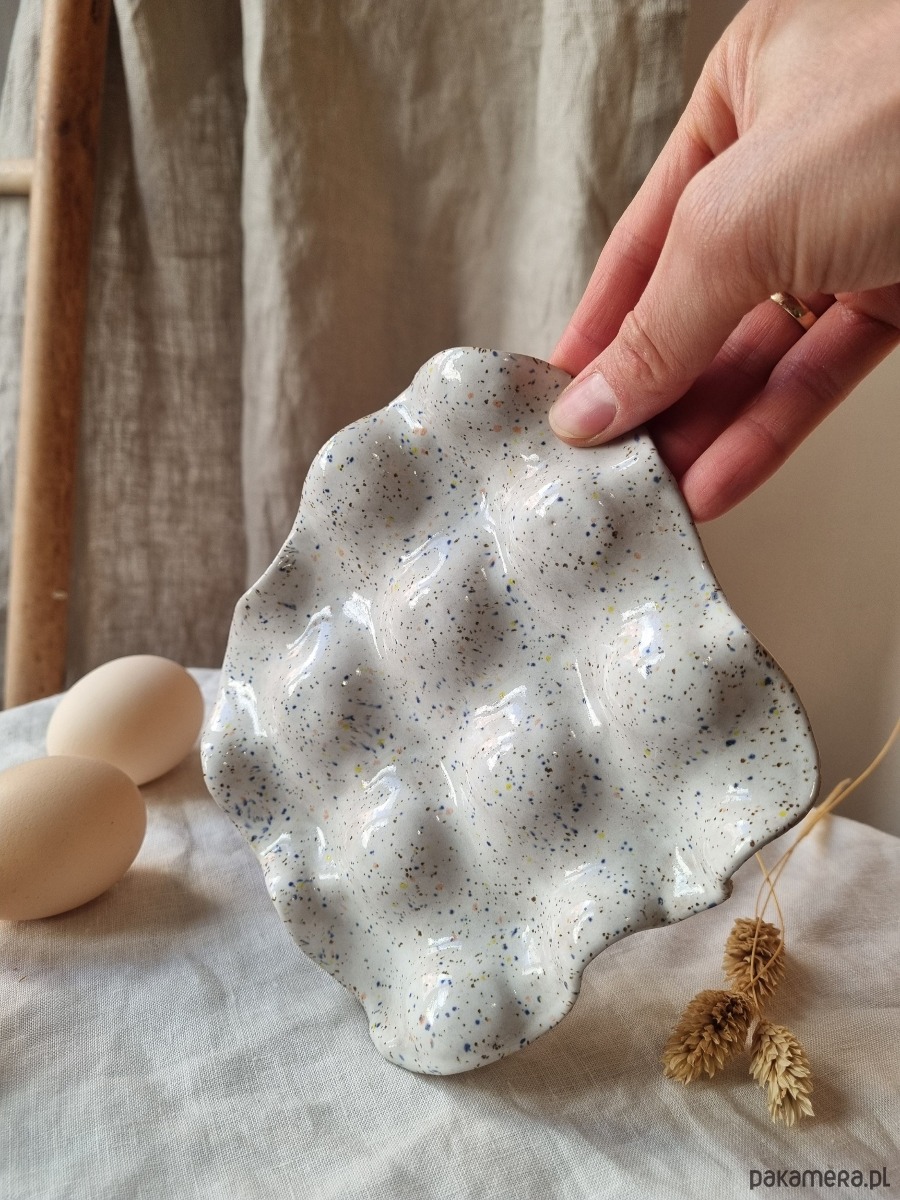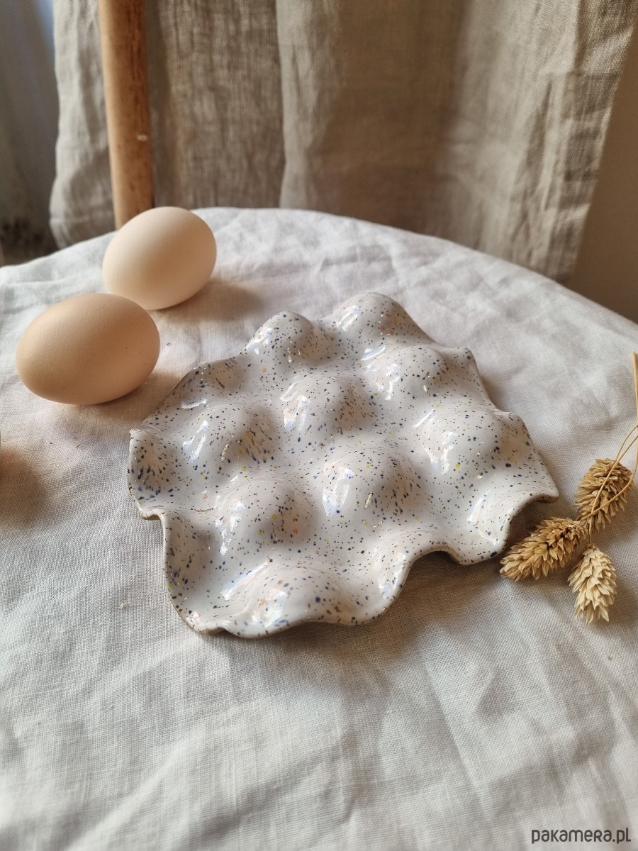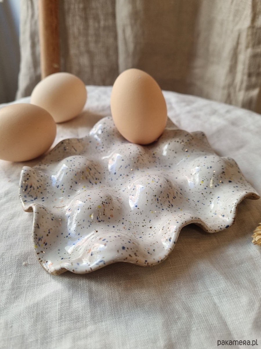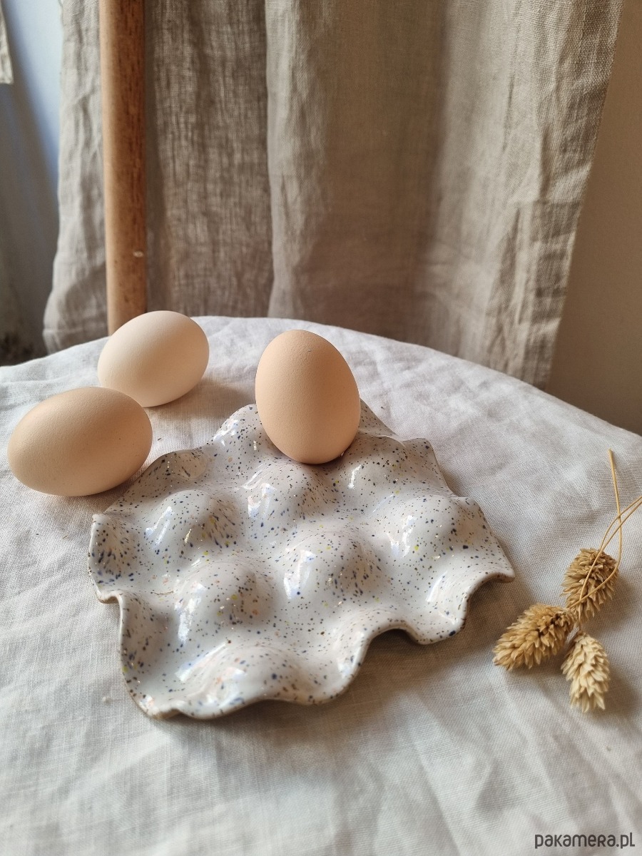 Wyjątkowa, ręcznie wykonaną paterę do serwowania jajek, idealną na wielkanocny stół. Każdy egzemplarz jest unikalny, lepiony i malowany ręcznie. Naczynie pokryte jest bezbarwnym szkliwem, które jest bezpieczne do kontaktu z żywnością, co gwarantuje jego funkcjonalność i estetykę.