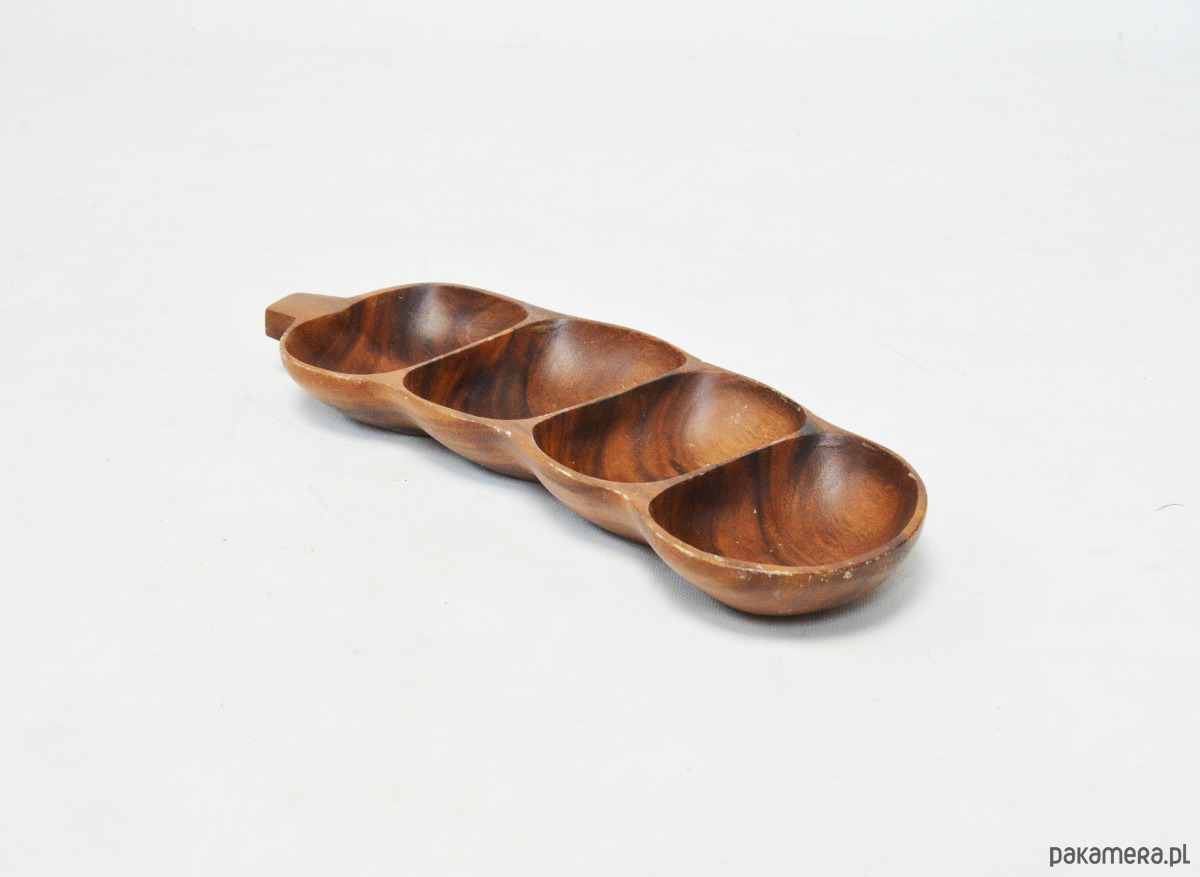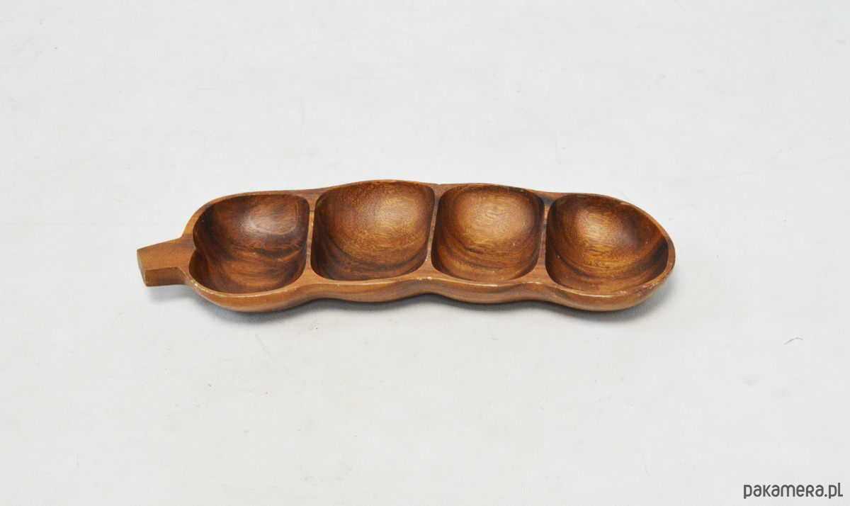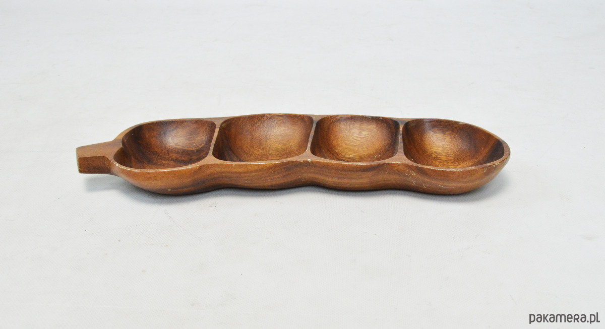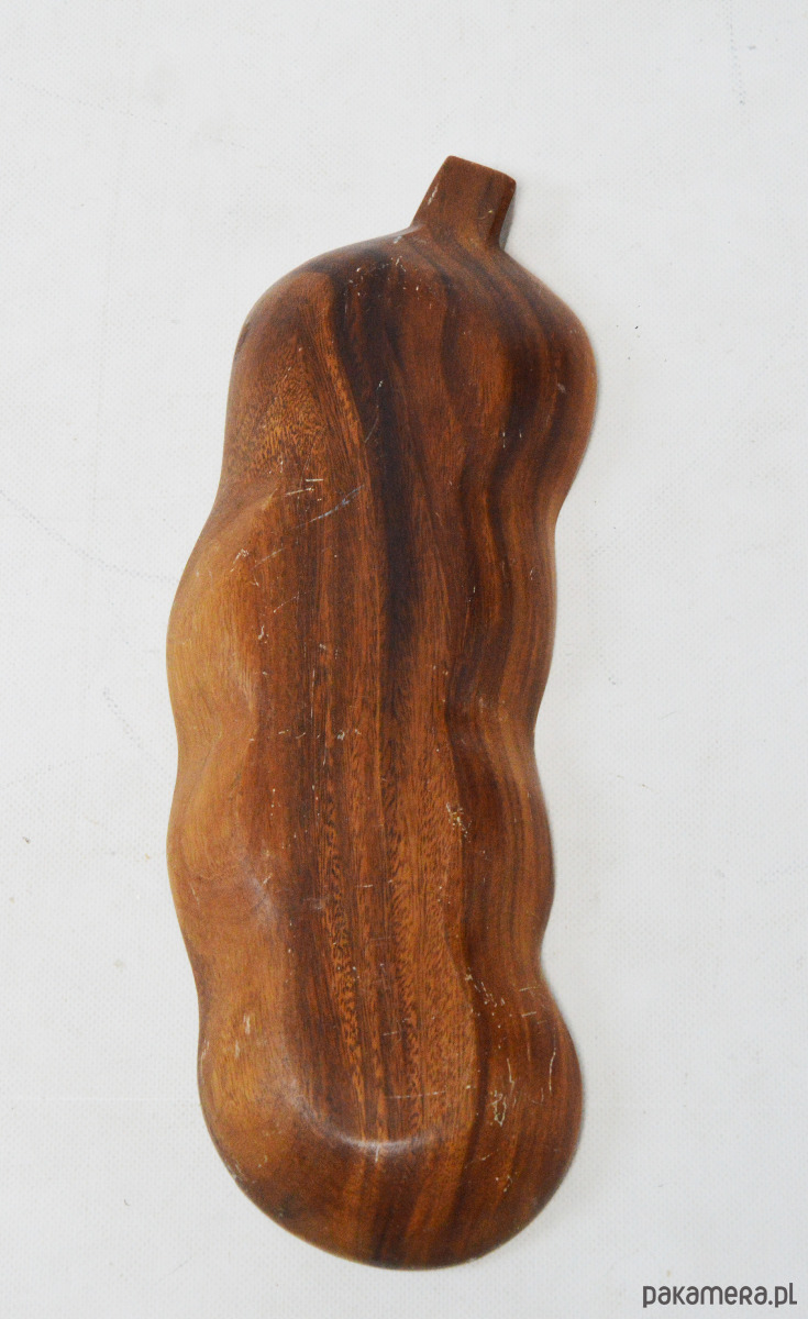 Duża patera tekowa w kształcie połowy fasoli szparagowej, z lat 70. Stan zachowania dobry, widoczne na zdjęciach ślady użytkowania.