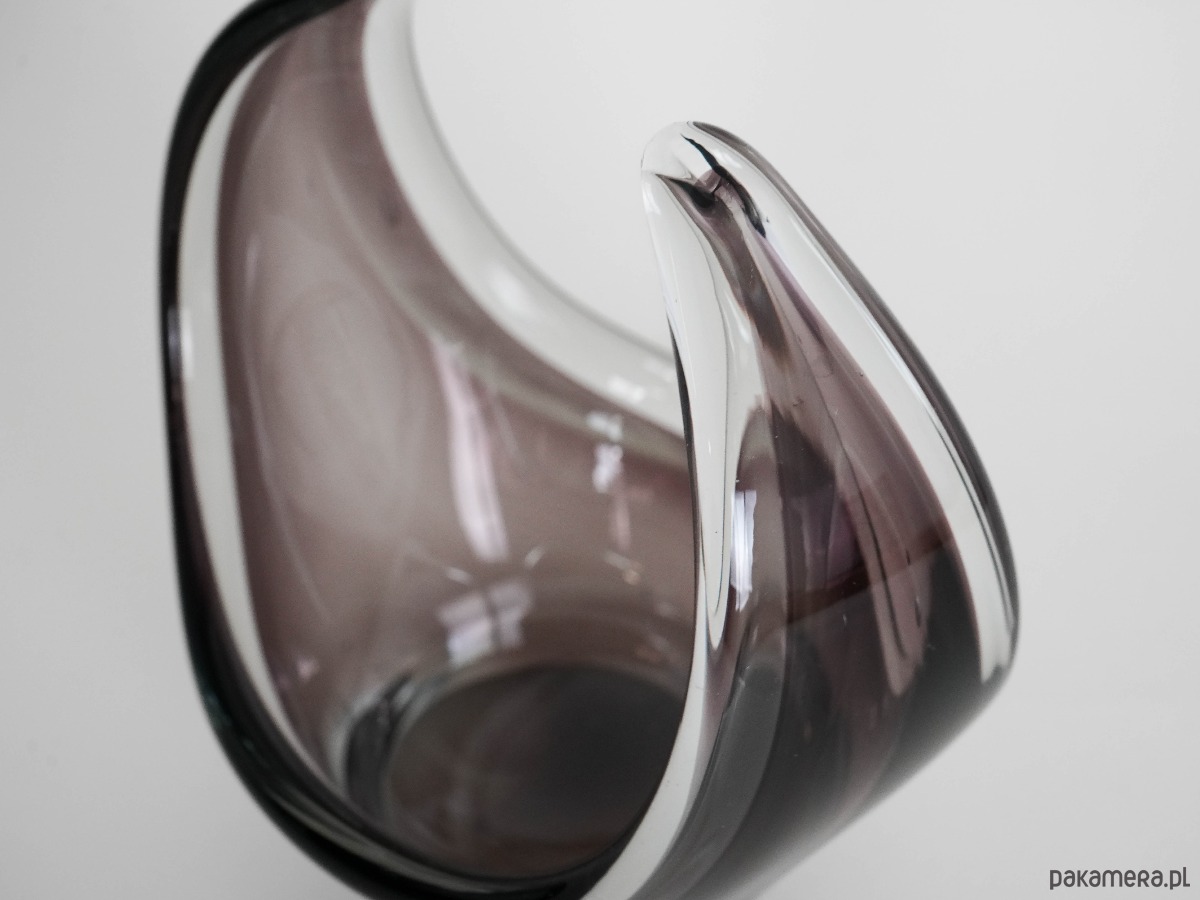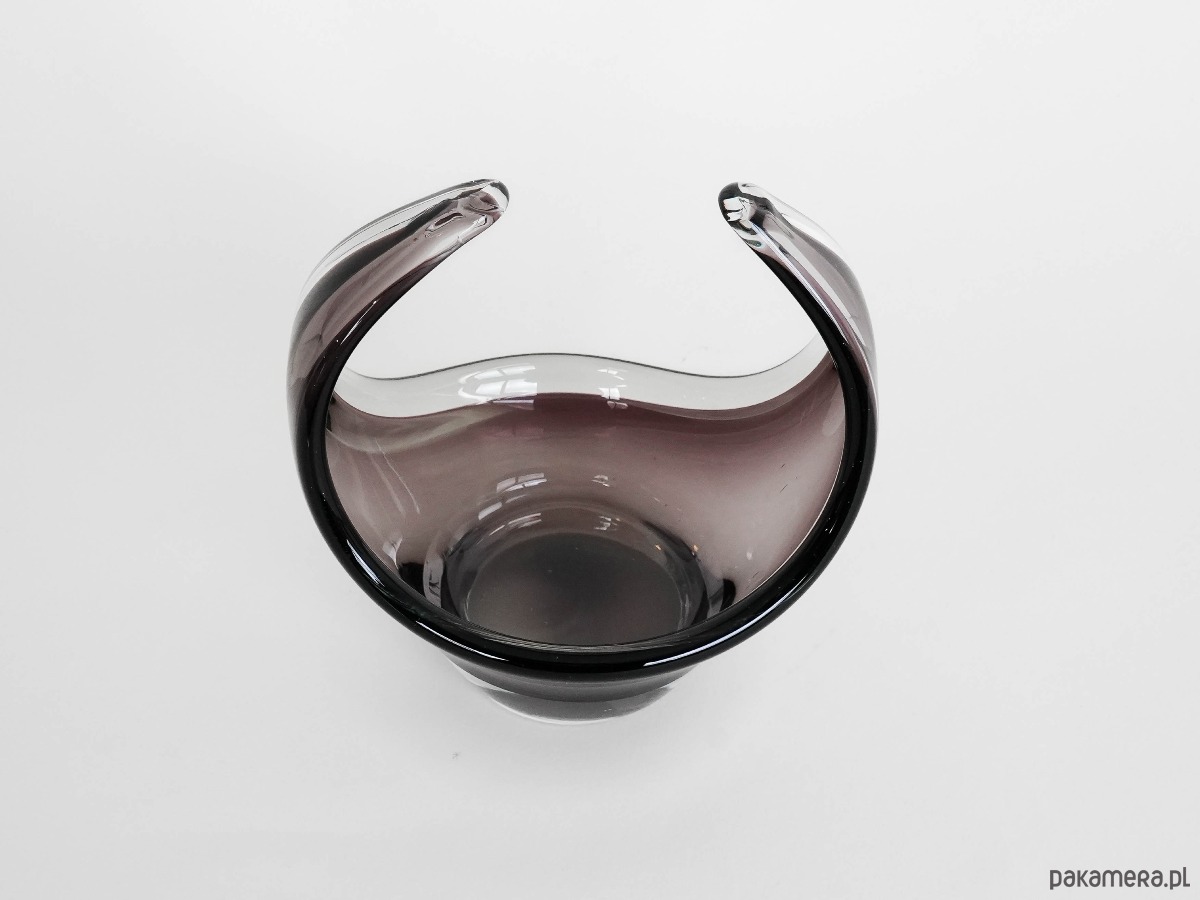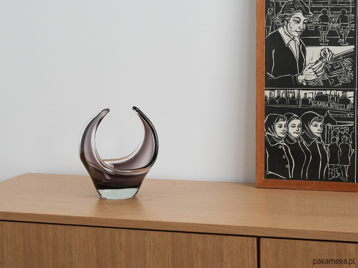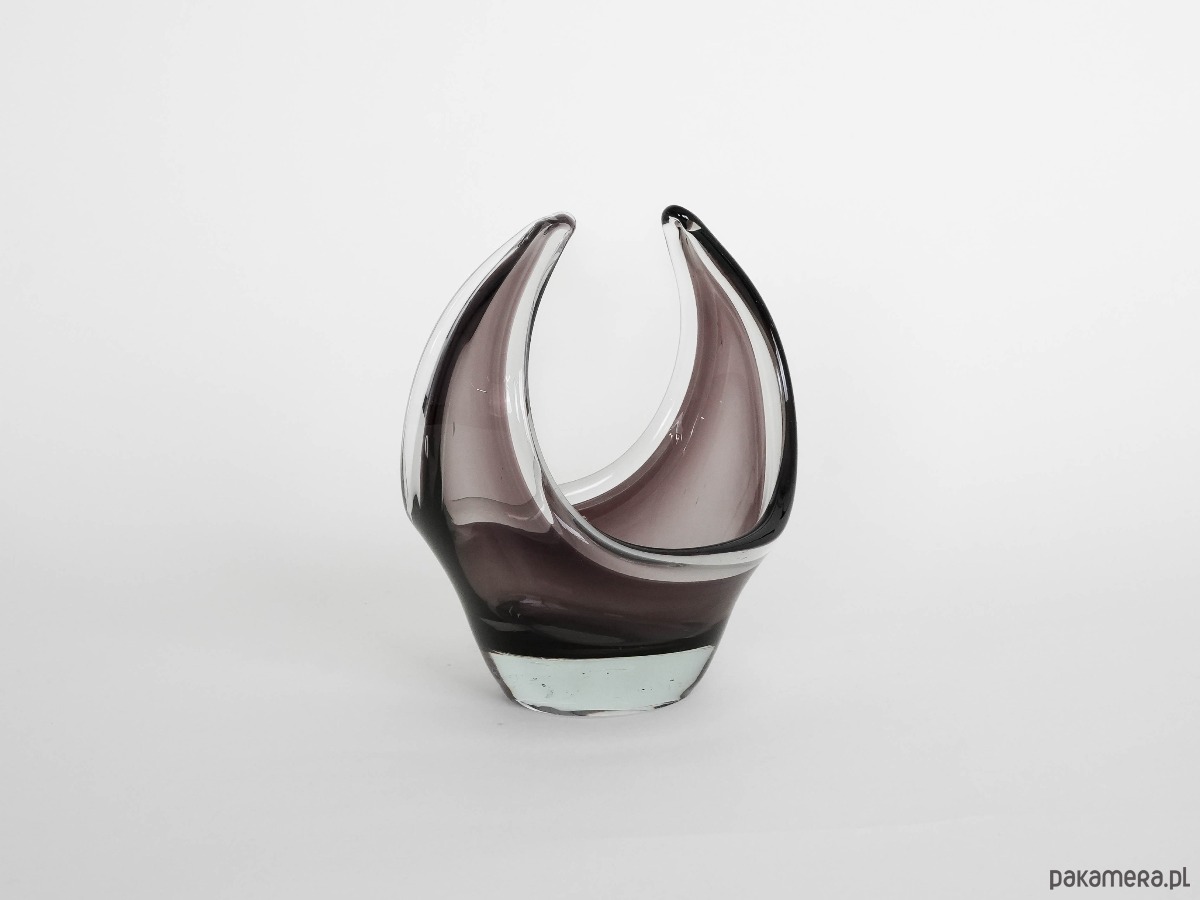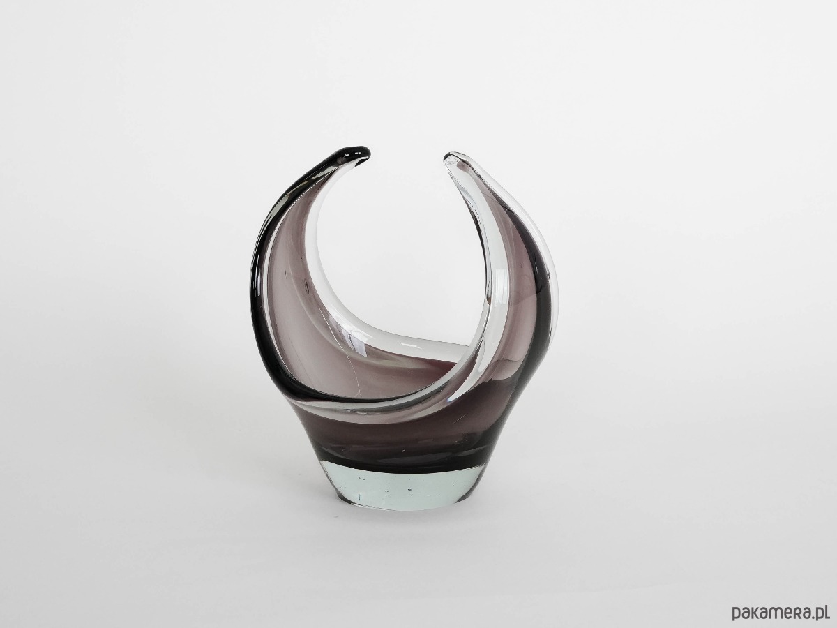 Imponująca rzeźbiarska forma ze szkła warstwowego, utrzymana w odcieniach przydymionego fioletu i bezbarwnego kryształu. Subtelne linie i dynamiczny kształt o wznoszących się ramionach tworzą elegancką, niemal architektoniczną sylwetkę. Ręcznie wykonana techniką sommerso, charakterystyczną dla włoskiego szkła z wyspy Murano, lecz popularną także w czeskich i skandynawskich hutach art glass z epoki mid-century. Idealna jako patera na owoce lub centralna dekoracja stołu – łączy funkcjonalność z artystycznym kunsztem. Wspaniały przykład szkła artystycznego z połowy XX wieku.