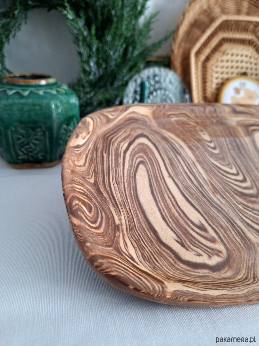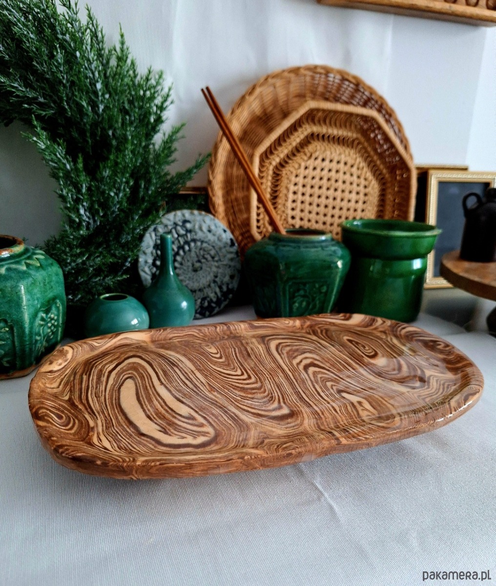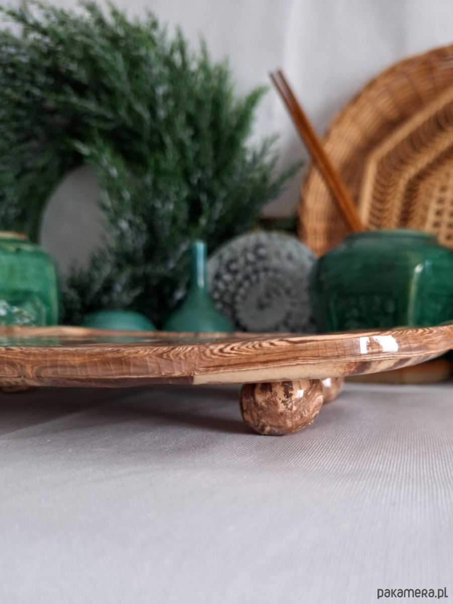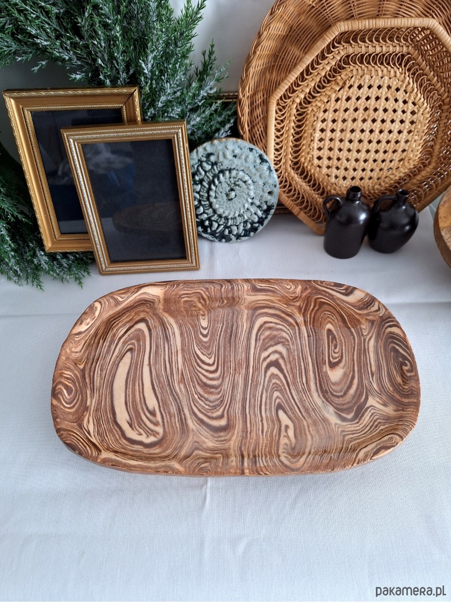 Ceramiczny dekor o wielorakim zastosowaniu - ozdoba może posłużyć jako podstawka na biżuterię, świece, klucze, okulary, kadzidła i palo santo. Może również pełnić rolę kuchennej patery lub tacy do serwowania przekąsek. Ozdoba ręcznie formowana i szkliwiona, wykonana metodą łączenia kilku barw mas ceramicznych i układania ich w fantazyjne, abstrakcyjne kształty. Kolor beżowy i brązowy z połyskiem. Unikatowa i oryginalna dekoracja, co ciekawe nie ma możliwości wykonania identycznych egzemplarzy.