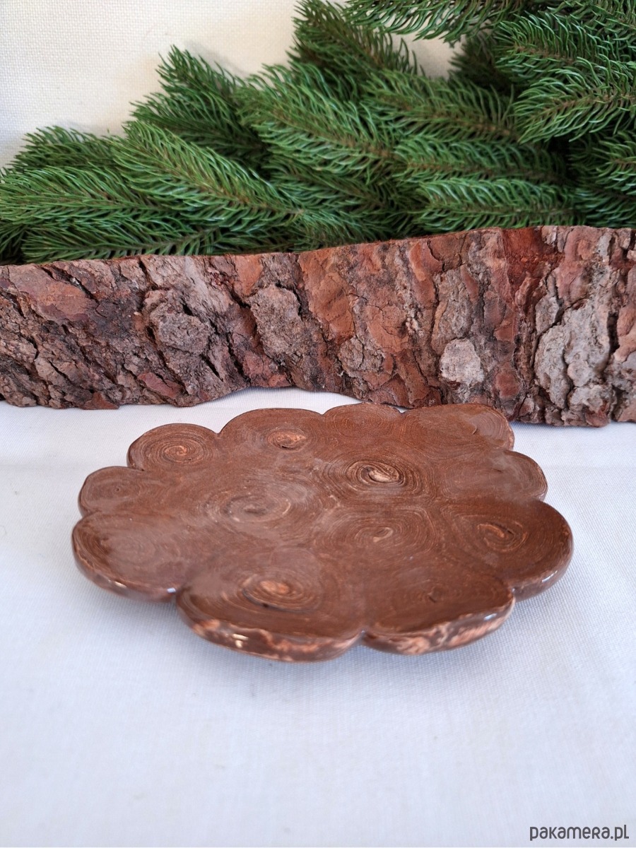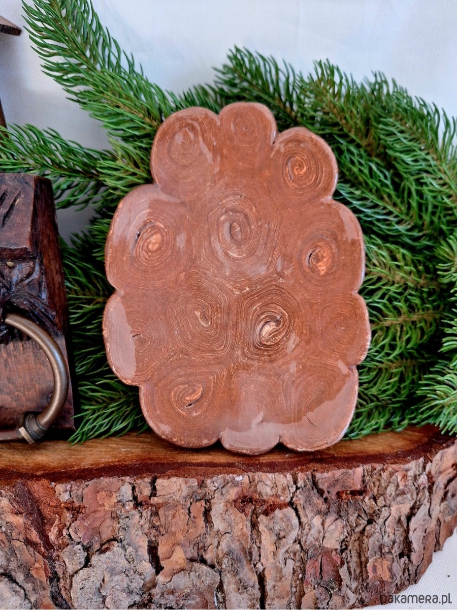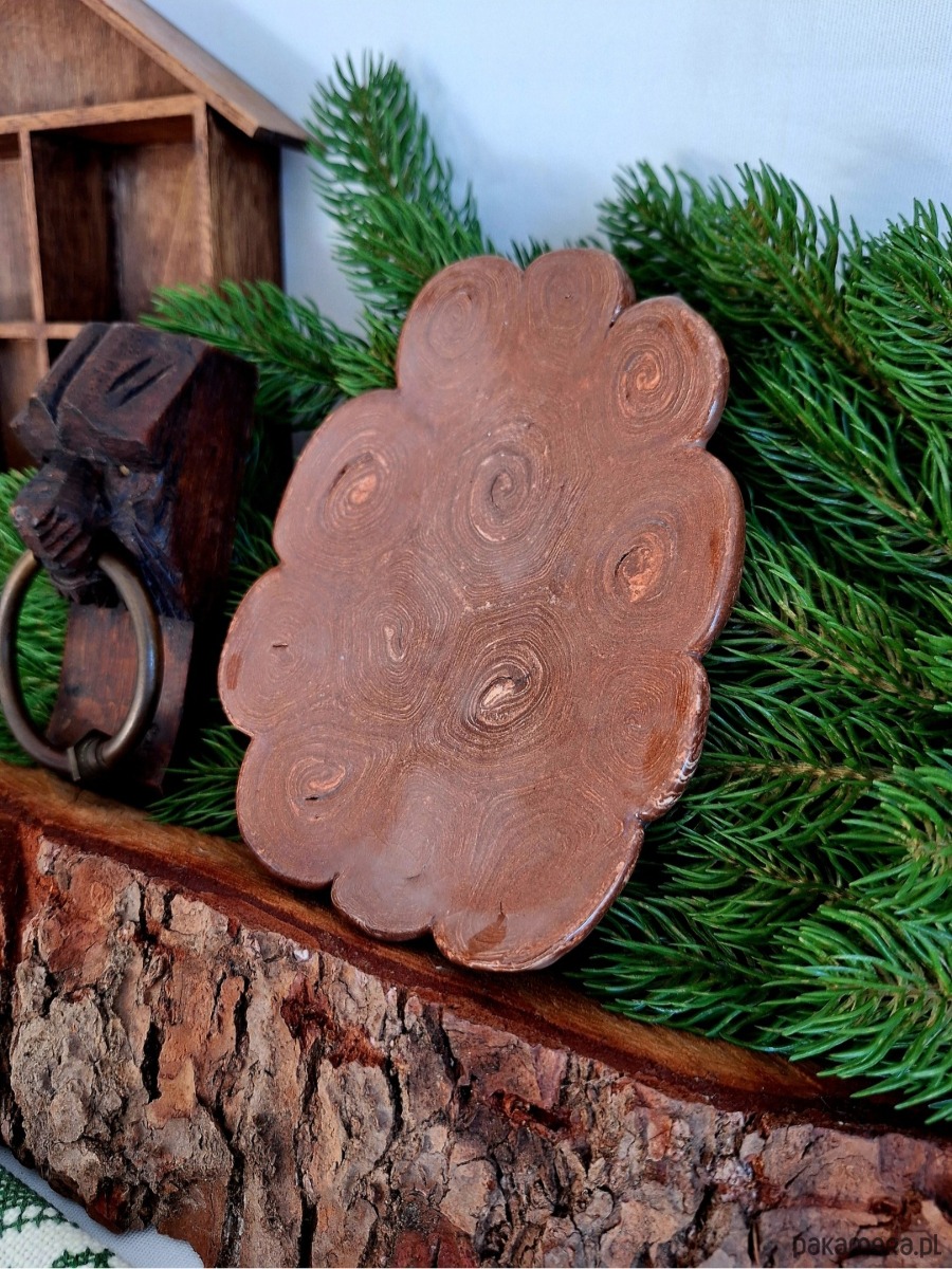 Ceramiczny dekor o wielorakim zastosowaniu - ozdoba może posłużyć jako podstawka na biżuterię, świece, klucze, okulary, kadzidła i palo santo. Ozdoba ręcznie formowana i szkliwiona, wykonana metodą łączenia kilku barw mas ceramicznych i układania ich w fantazyjne, abstrakcyjne kształty, przypominające w tym wypadku słoje drzewne. Kolor brązowy z połyskiem. Unikatowa i oryginalna dekoracja, co ciekawe nie ma możliwości wykonania identycznych egzemplarzy.