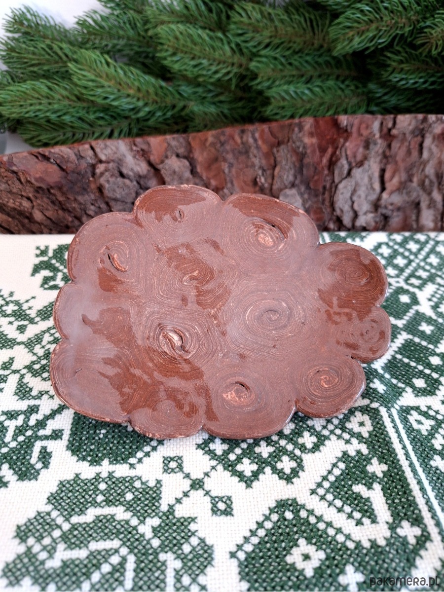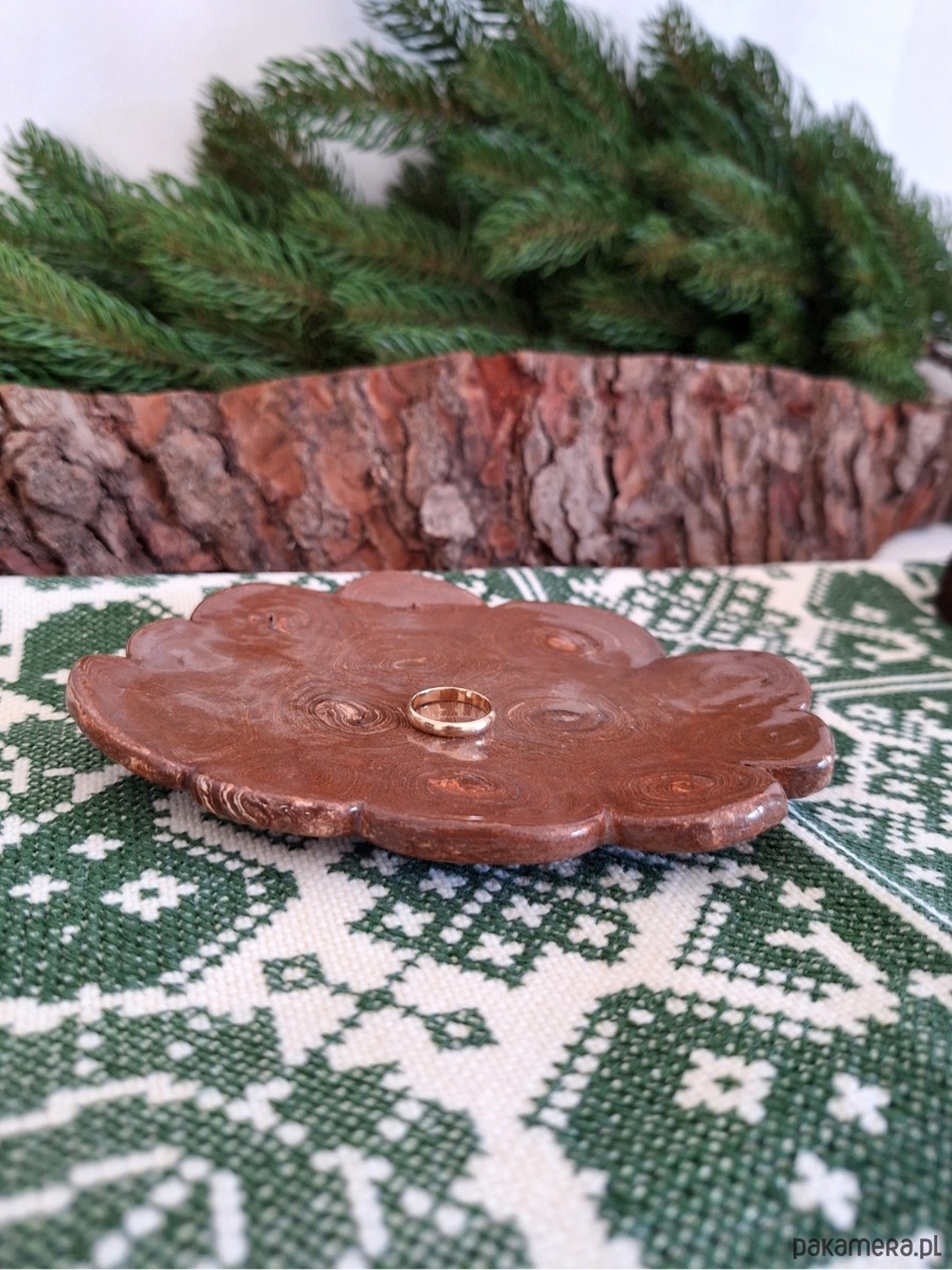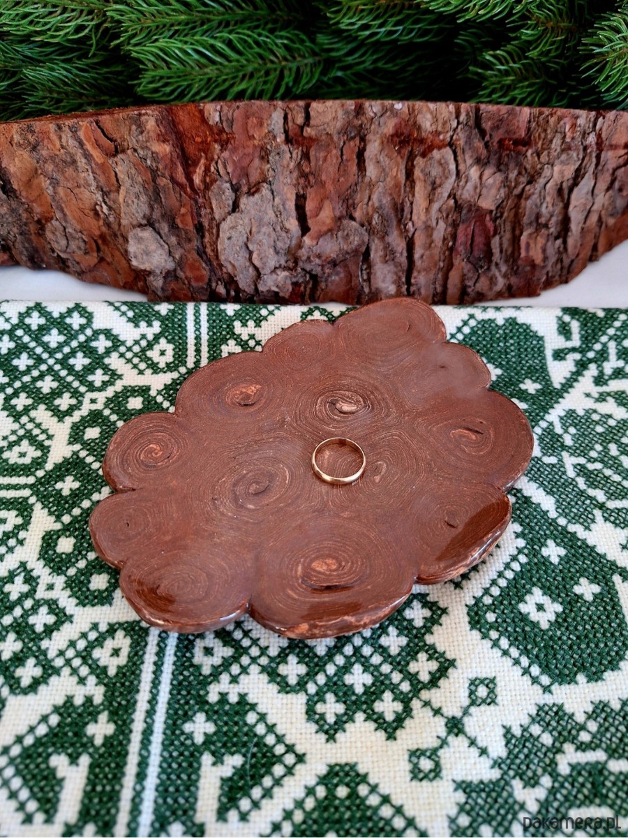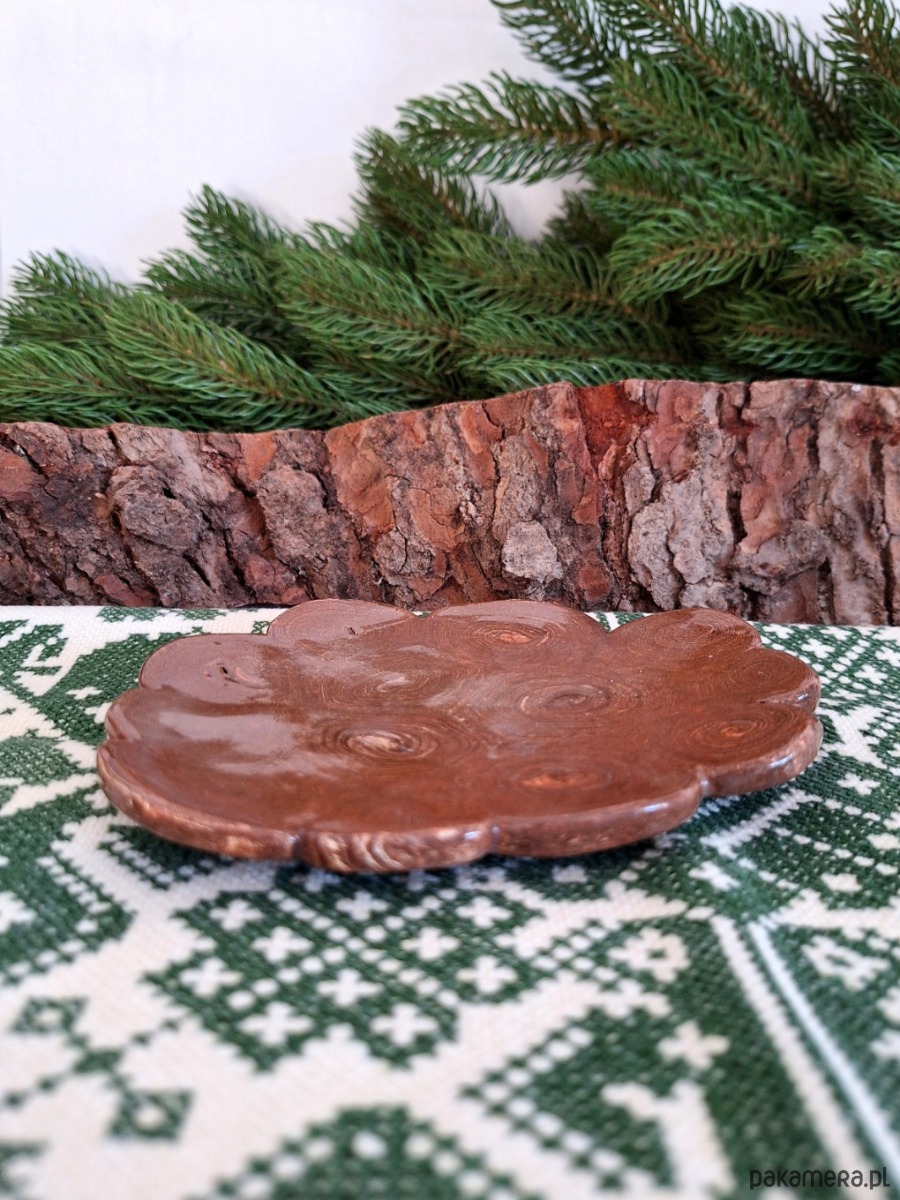 Ceramiczny dekor o wielorakim zastosowaniu - ozdoba może posłużyć jako podstawka na biżuterię, świece, klucze, okulary, kadzidła i palo santo. Ozdoba ręcznie formowana i szkliwiona, wykonana metodą łączenia kilku barw mas ceramicznych i układania ich w fantazyjne, abstrakcyjne kształty, przypominające w tym wypadku słoje drzewne. Kolor brązowy z połyskiem. Unikatowa i oryginalna dekoracja, co ciekawe nie ma możliwości wykonania identycznych egzemplarzy.
