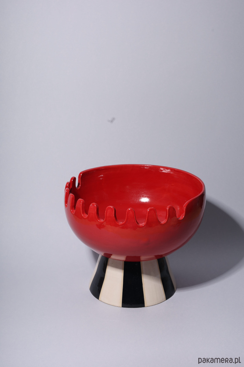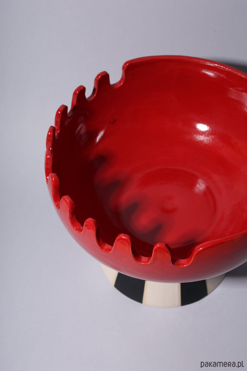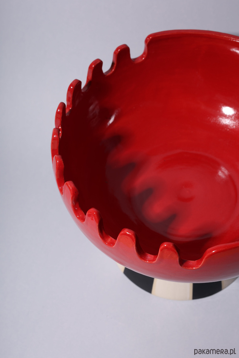 Ręcznie wykonana w 100% z kamionki, przykuwa spojrzenie falującą krawędzią w kolorze głębokiej czerwieni oraz graficzną, czarno-białą podstawą, przypominającą kontrastowe pasy na muszli.