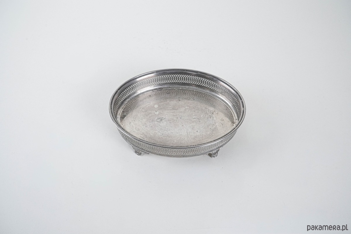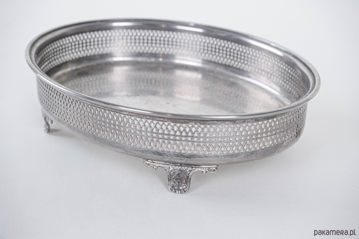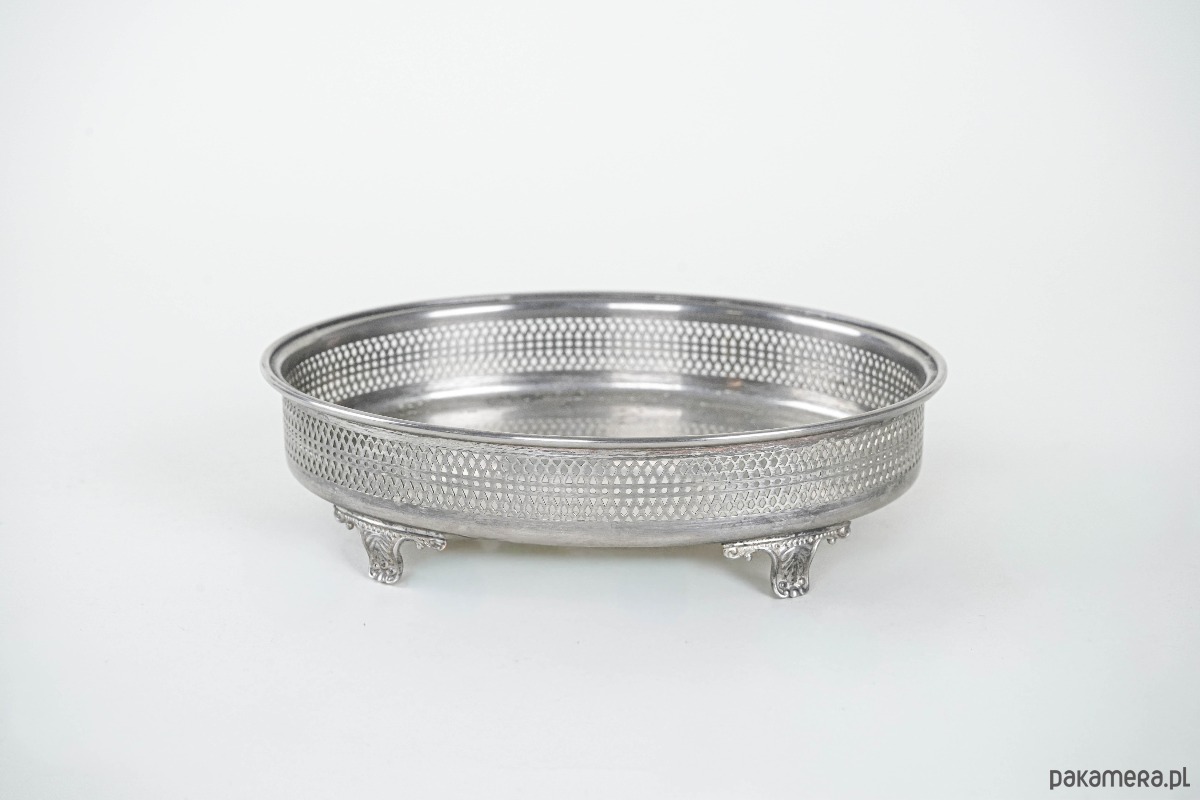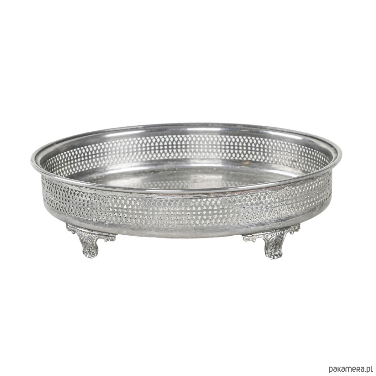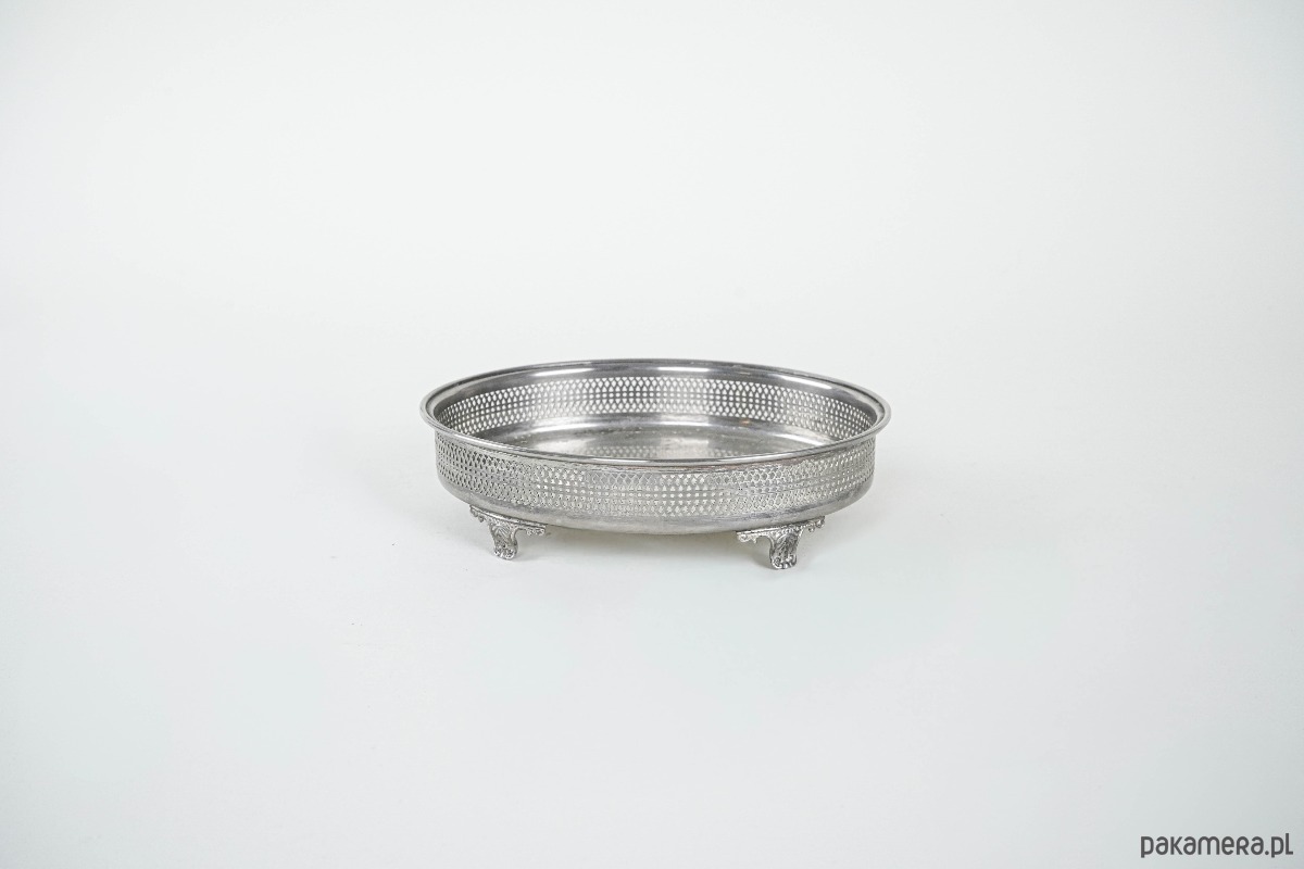 Okrągła patera posrebrzana na nóżkach z ażurowym brzegiem. Delikatny, perforowany wzór nadaje jej lekkości, a dekoracyjne nóżki podkreślają klasyczny charakter. Doskonała jako elegancka podstawka na ciastka, owoce, drobne przekąski lub jako element dekoracyjny.