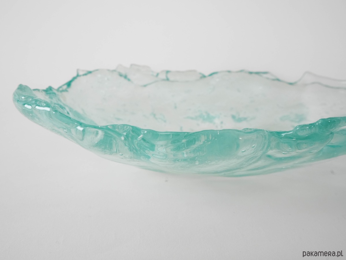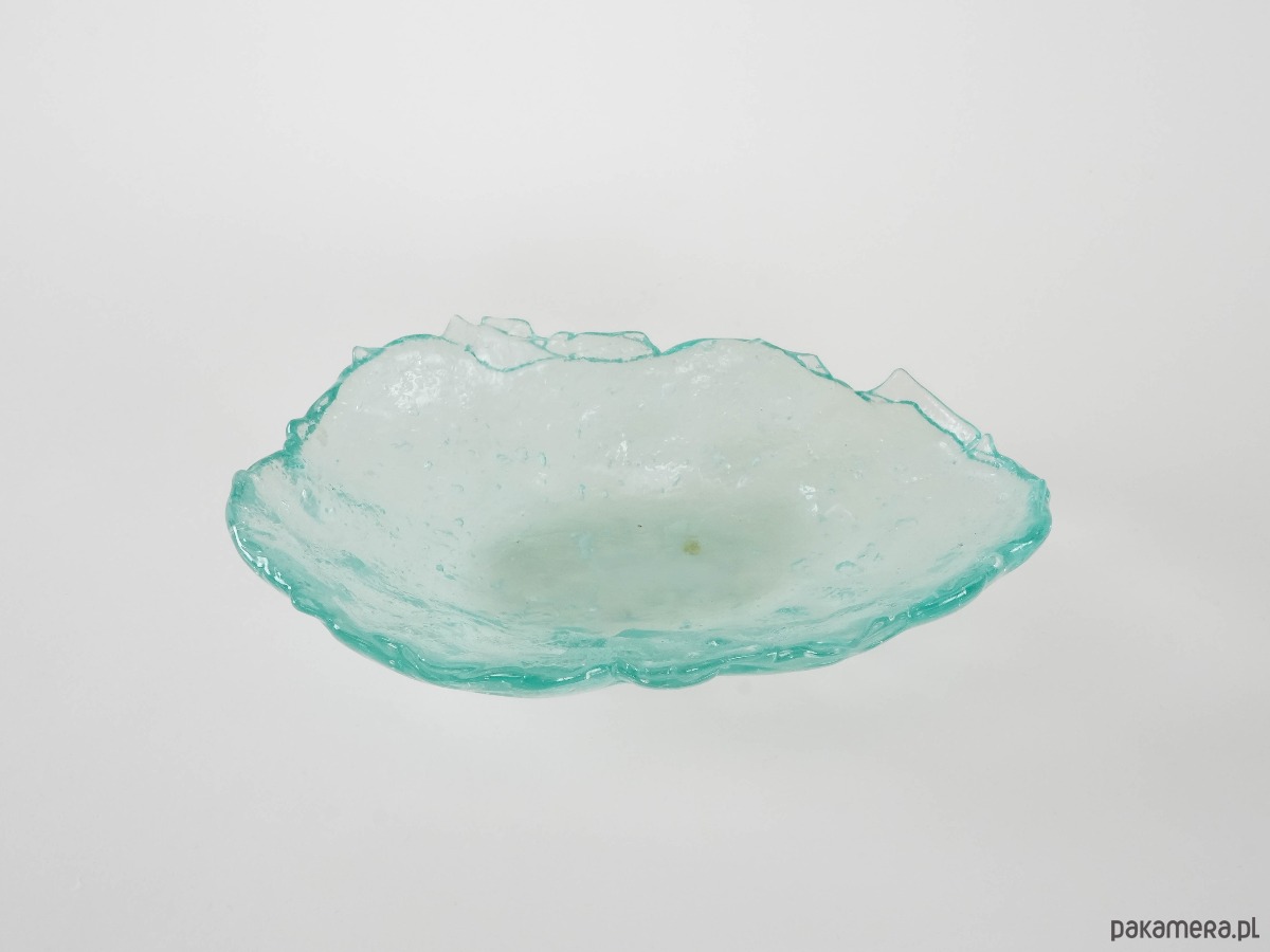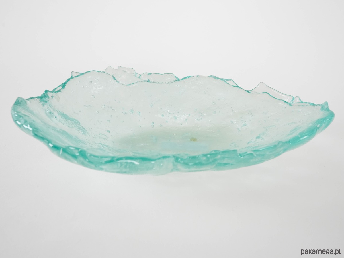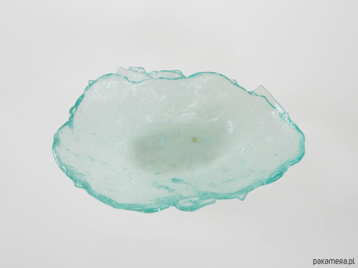 Rzeźbiarska patera artystyczna ze szkła lodowego wyprodukowana została w latach 70-tych, produkcja duńska.