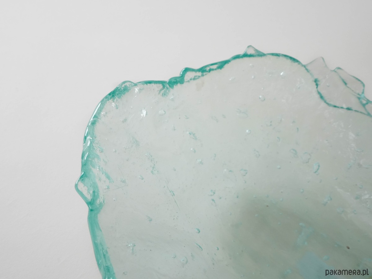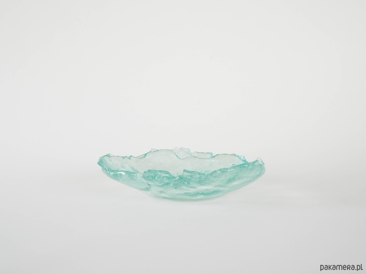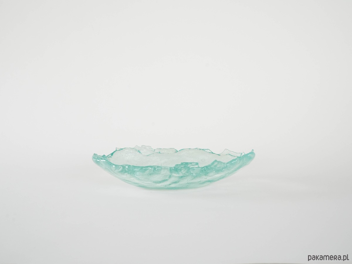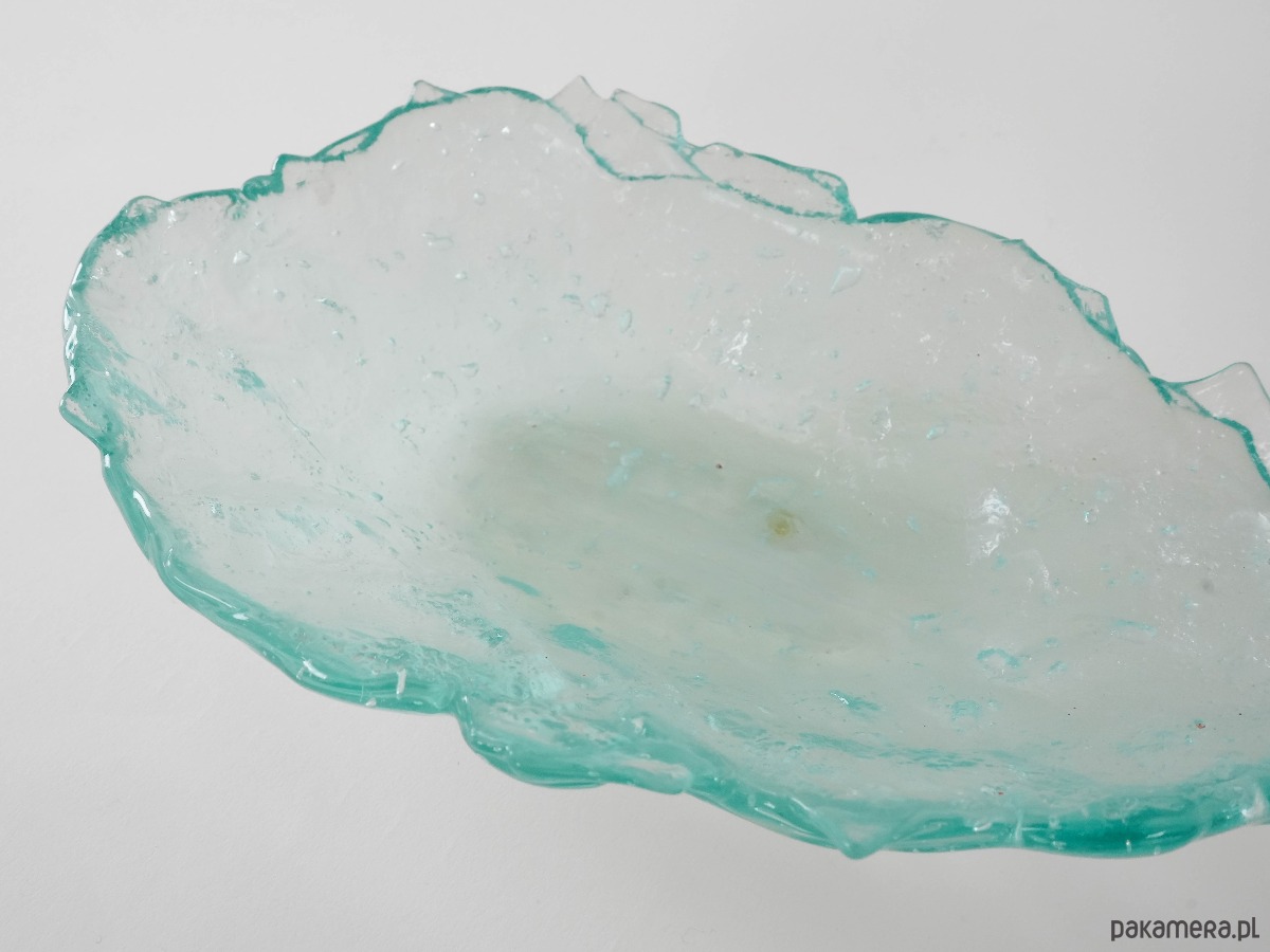 Rzeźbiarska patera artystyczna ze szkła lodowego wyprodukowana została w latach 70-tych, produkcja duńska.