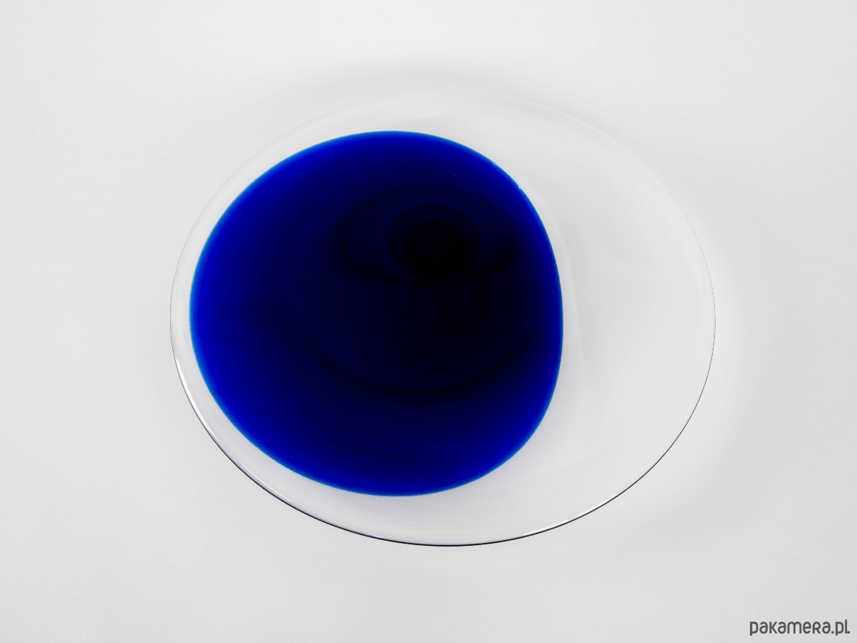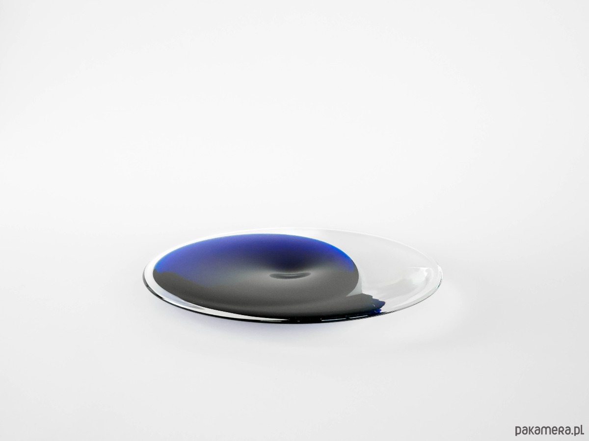 Imponująca patera wykonana ze szkła artystycznego, w technice sommerso – przezroczyste szkło kryje w sobie intensywną kobaltową barwę, która układa się w miękką, organiczną plamę wewnątrz formy. Minimalistyczny, nowoczesny design podkreśla duńską szkołę szkła artystycznego lat 60., cenioną za prostotę i elegancję. Rzadki i efektowny obiekt dekoracyjny, idealny do kolekcji skandynawskiego szkła vintage.