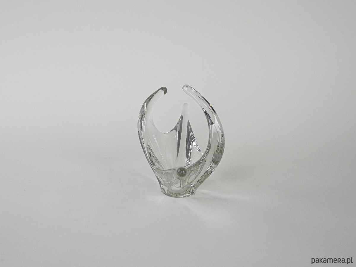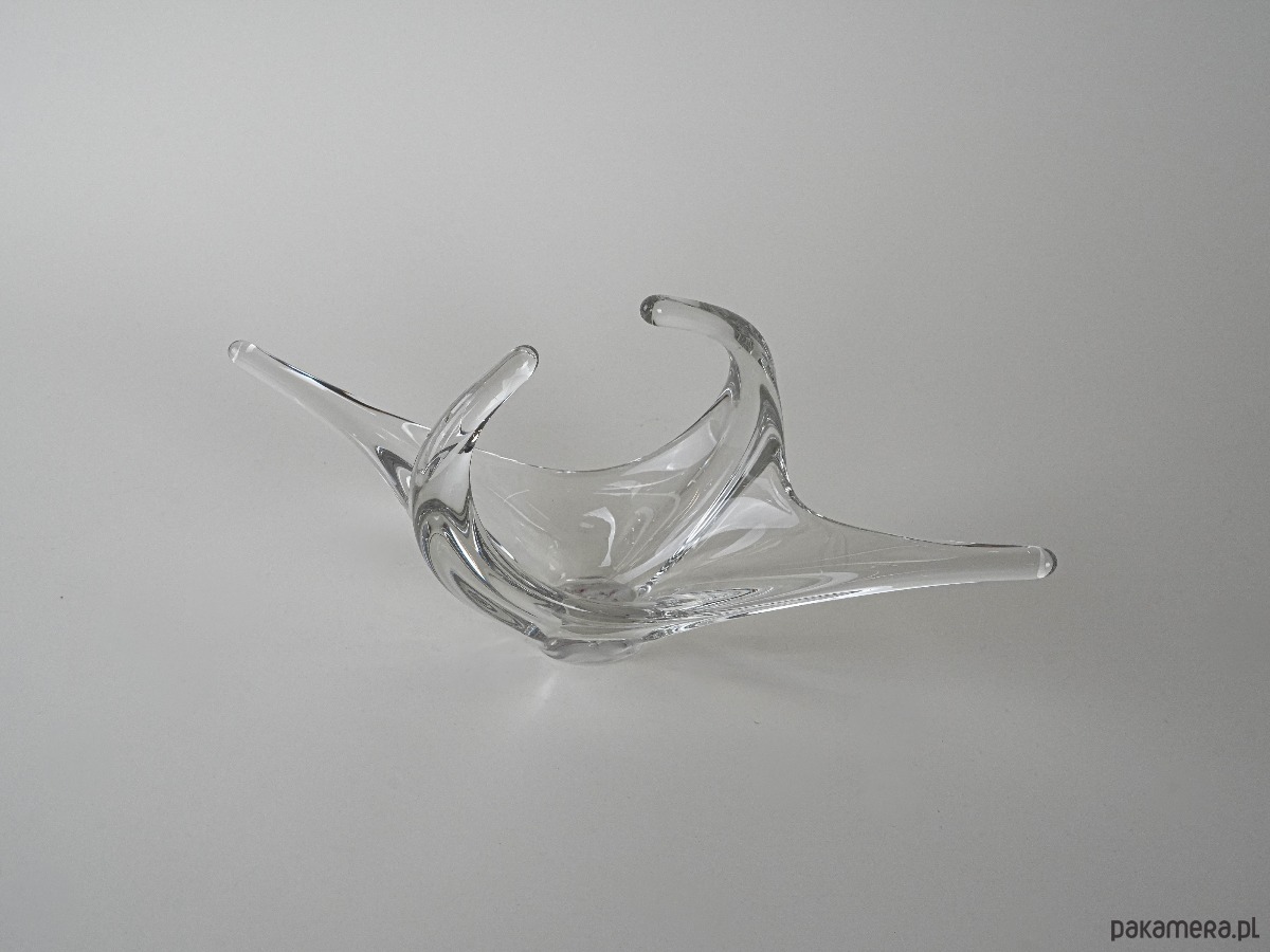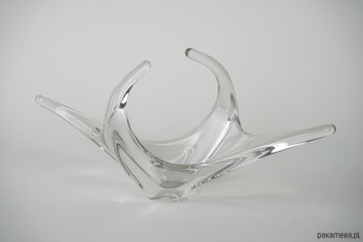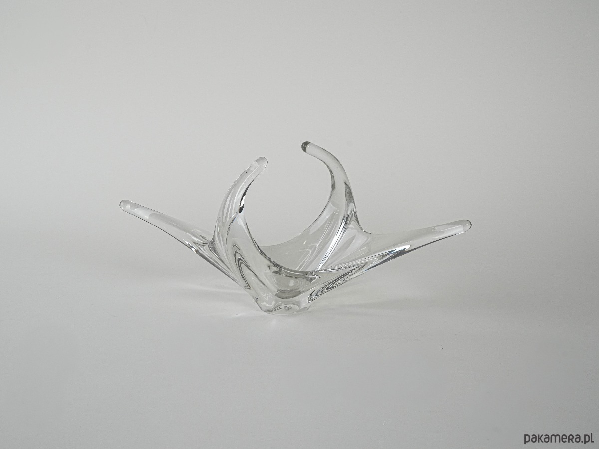 Efektowna, ręcznie formowana misa z transparentnego szkła o dynamicznej, asymetrycznej formie z trzema smukłymi, wyciągniętymi ramionami. Jej futurystyczny kształt wpisuje się w estetykę Space Age oraz nurt szkła artystycznego lat 60. i 70. XX wieku. Przedmiot może pełnić funkcję dekoracyjnej misy, patery lub samodzielnej rzeźby szklanej, pięknie załamującej i odbijającej światło.