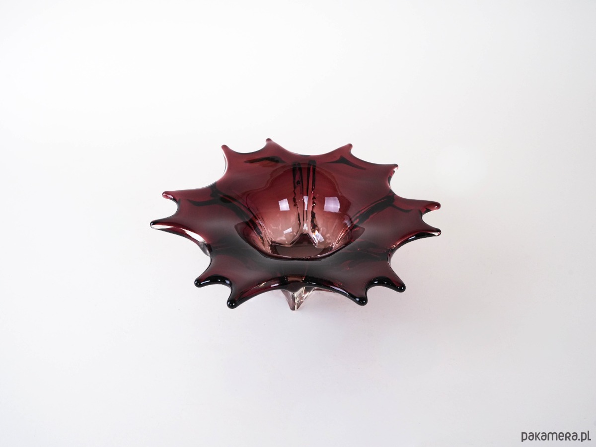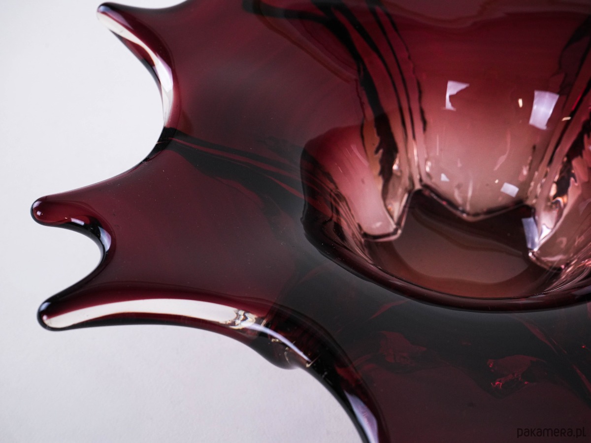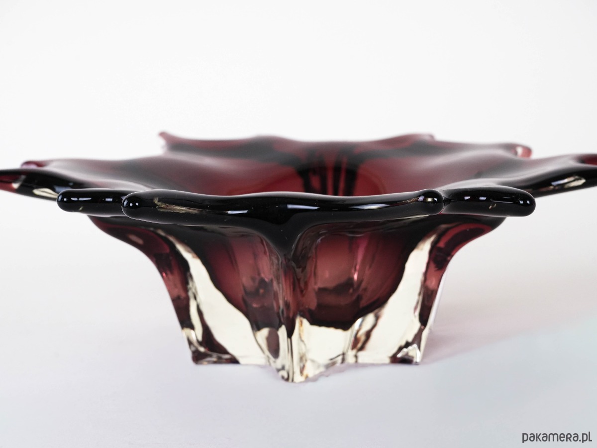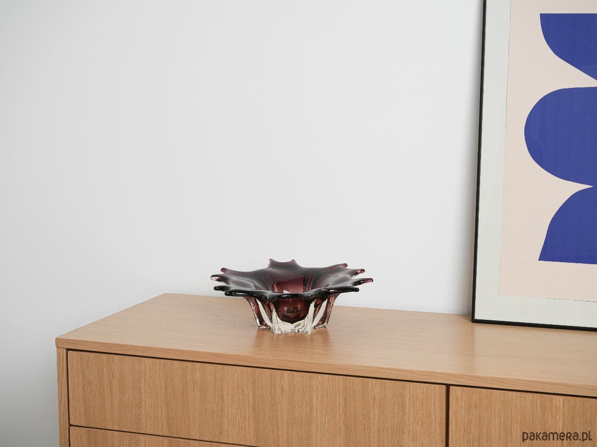 Efektowna szklana patera o rzeźbiarskiej, organicznej formie, wykonana w technice szkła artystycznego. Głęboki, elegancki odcień bordo z czernią przechodzi w transparentne, masywne krawędzie, które pięknie załamują światło i nadają obiektowi wyjątkową głębię. Falowana linia brzegu oraz miękkie „płynące” przejścia kolorystyczne tworzą kompozycję o wyraźnie kolekcjonerskim charakterze — to przedmiot, który działa jak dekoracja sama w sobie. Idealna jako patera na owoce, obiekt na stół kawowy lub elegancki akcent w gablocie.