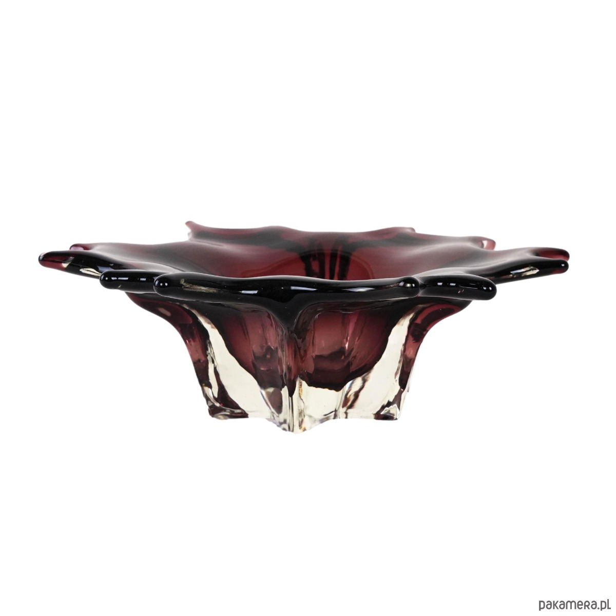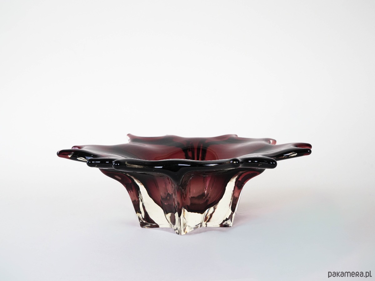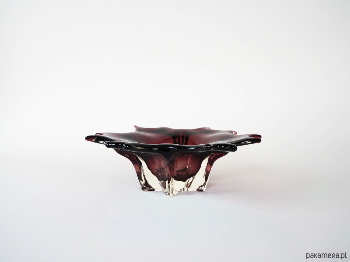Efektowna szklana patera o rzeźbiarskiej, organicznej formie, wykonana w technice szkła artystycznego. Głęboki, elegancki odcień bordo z czernią przechodzi w transparentne, masywne krawędzie, które pięknie załamują światło i nadają obiektowi wyjątkową głębię. Falowana linia brzegu oraz miękkie „płynące” przejścia kolorystyczne tworzą kompozycję o wyraźnie kolekcjonerskim charakterze — to przedmiot, który działa jak dekoracja sama w sobie. Idealna jako patera na owoce, obiekt na stół kawowy lub elegancki akcent w gablocie.