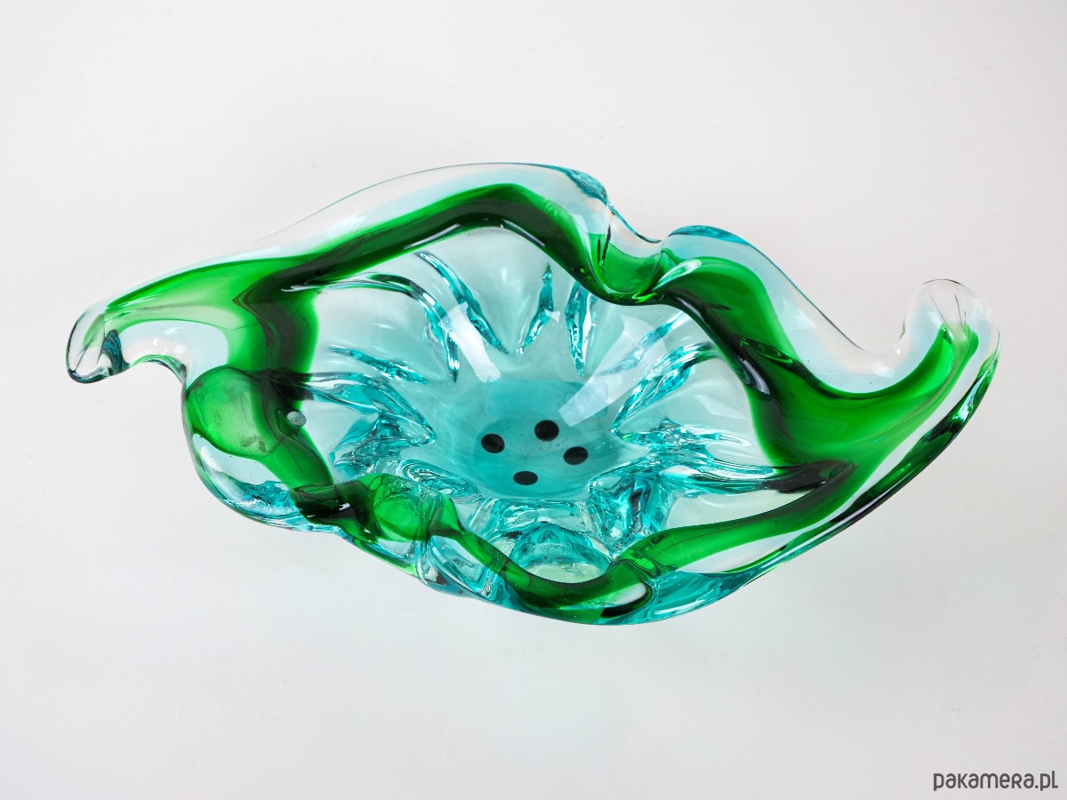 Okazała szklana patera Murano z lat 60.–70., wykonana w technice sommerso. Dynamiczna, falująca forma o asymetrycznych liniach podkreśla ręczne wykonanie i unikatowość obiektu. Przenikające się tony zieleni i turkusu tworzą efekt głębi i świetlistości, charakterystyczny dla mistrzów szkła z wyspy Murano. Autentyczny egzemplarz vintage, łączący funkcję dekoracyjną z kolekcjonerską – wyjątkowy akcent w duchu mid-century modern i włoskiego designu artystycznego.