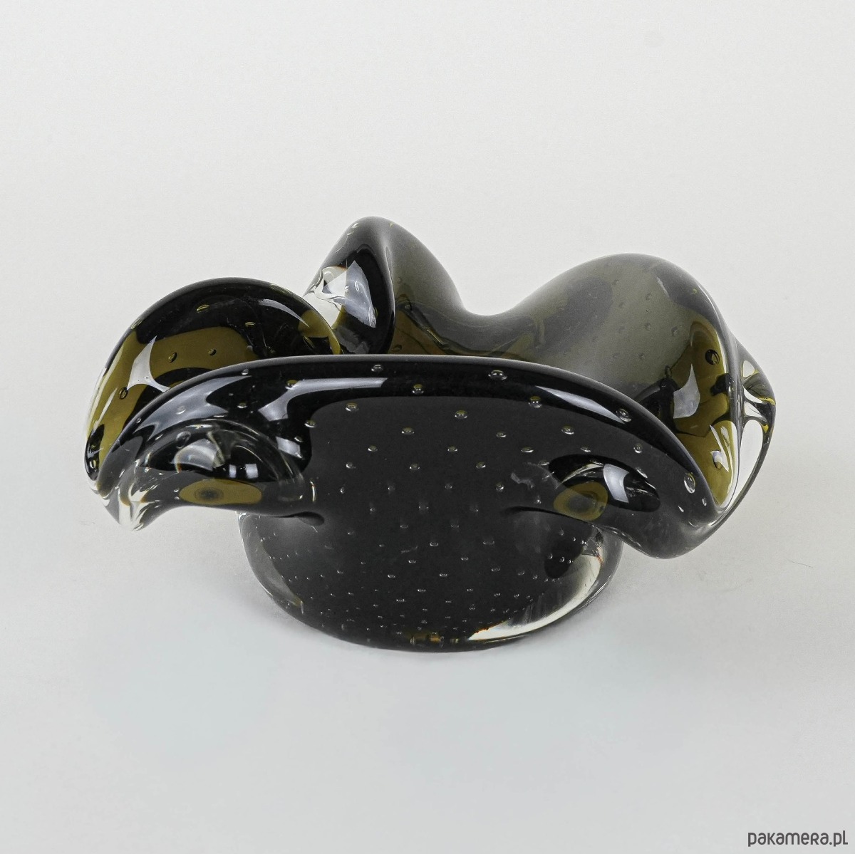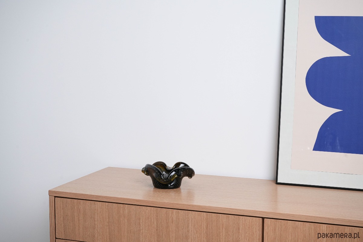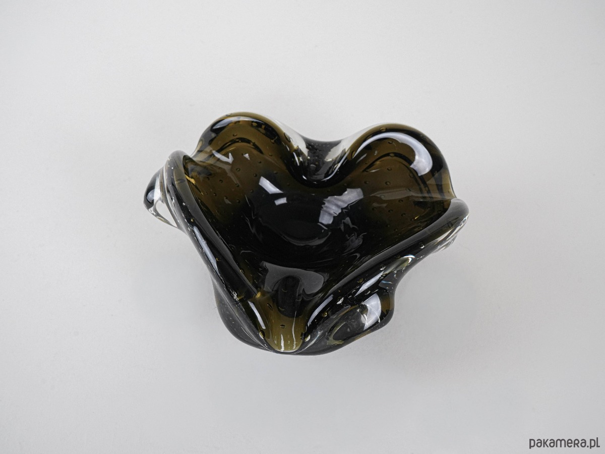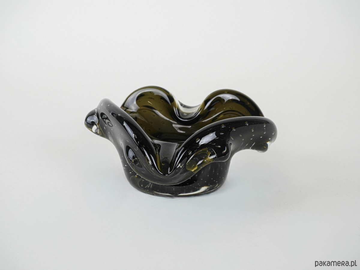 Elegancka patera artystyczna Murano, lata 60./70. XX w., wykonana w technice ręcznego formowania szkła. Charakterystyczna organiczna forma o falujących krawędziach przypomina kształt rozchylonego kwiatu, a głęboki odcień oliwkowej zieleni zamknięty w transparentnej masie szklanej tworzy efekt subtelnej głębi i świetlistości. Patera doskonale reprezentuje włoski modernizm i unikalny styl Murano, w którym rzemieślnicza perfekcja spotyka się z naturalną lekkością i ekspresją formy. Idealna zarówno jako samodzielny obiekt kolekcjonerski, jak i dekoracyjny akcent na stole czy konsoli.