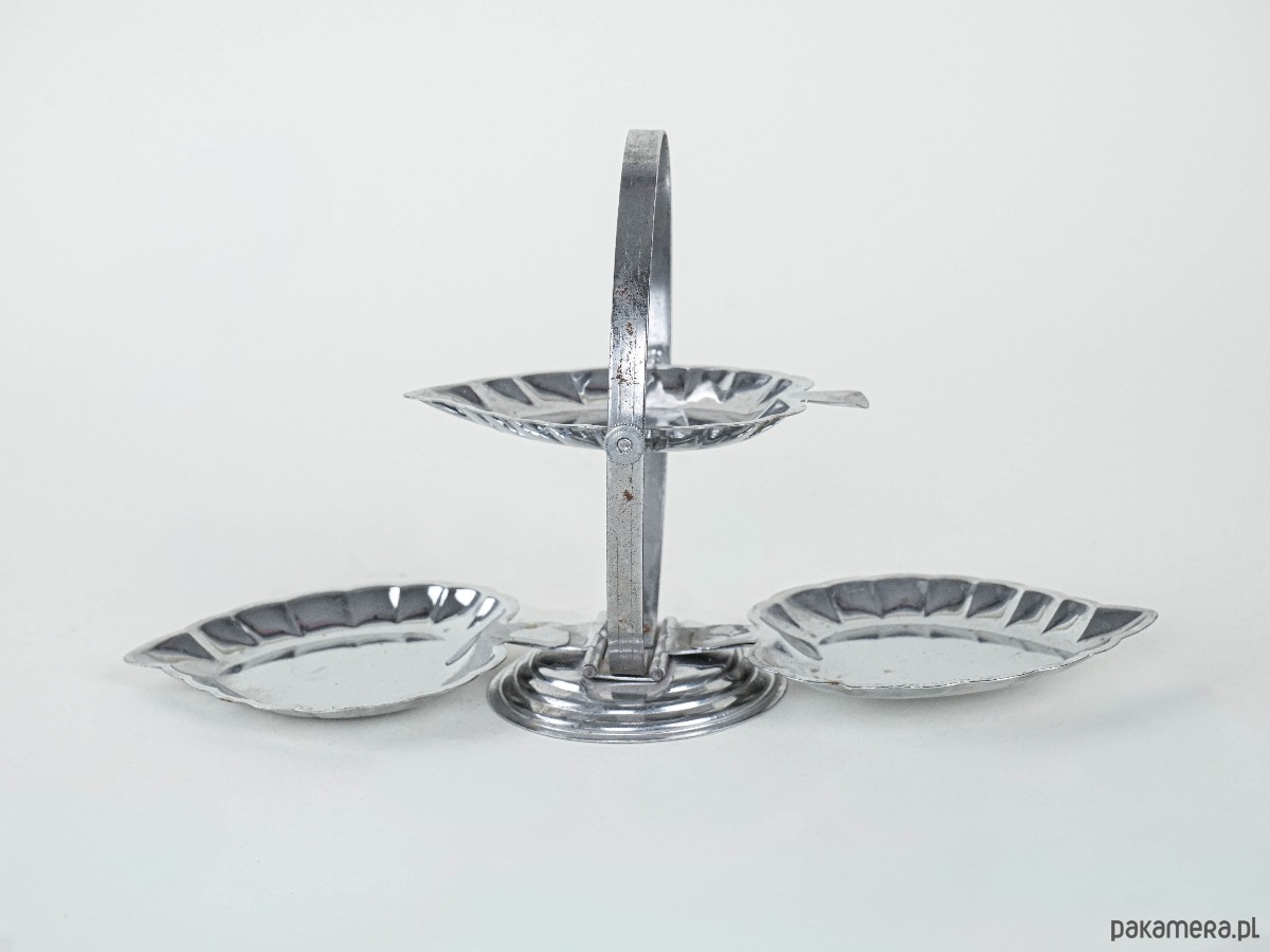 Metalowa patera z trzema talerzykami w kształcie liści, osadzonymi na podstawie z uchwytem. Chromowana powierzchnia z delikatną patyną podkreśla jej vintage’owy charakter. Idealna do serwowania przekąsek, orzechów czy słodyczy.
