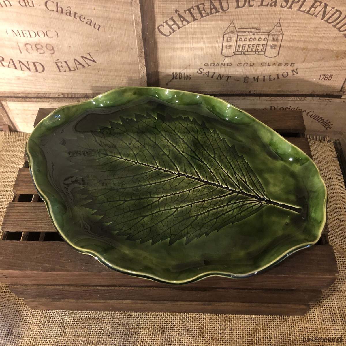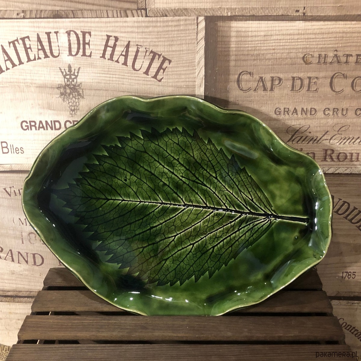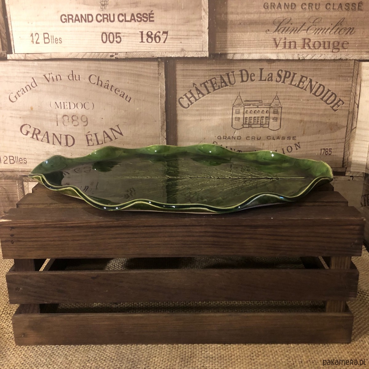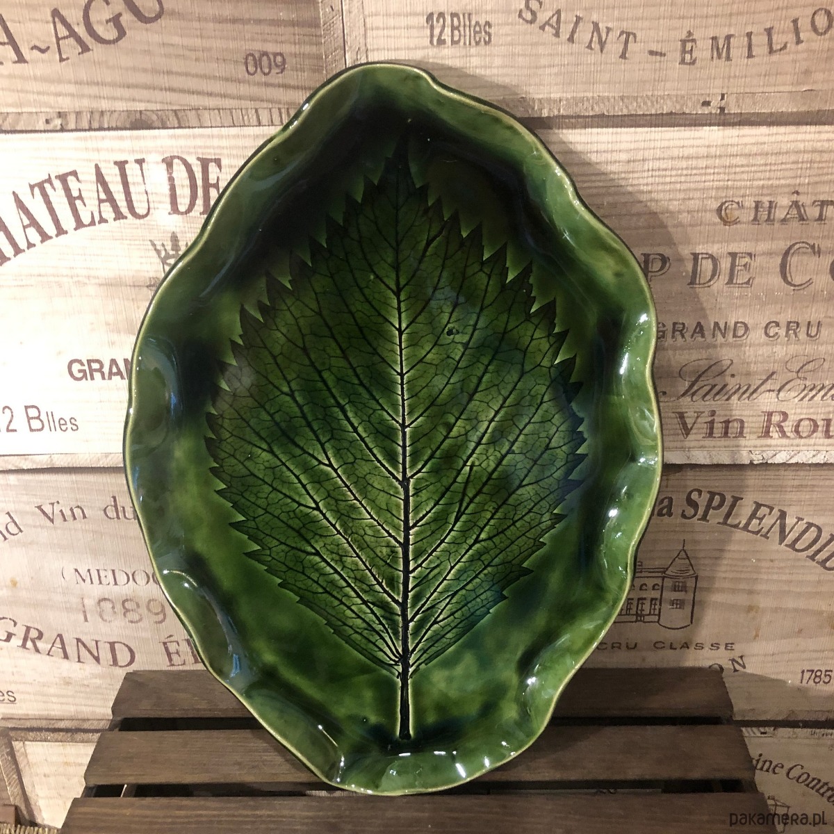 Patera ceramiczna w kolorze oliwkowej zieleni z odciśniętym wzorem naturalnego liścia.