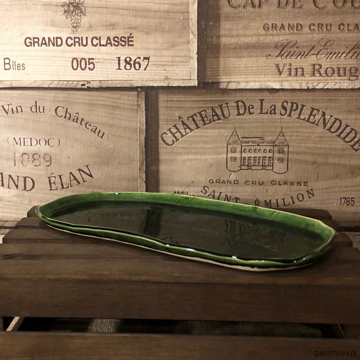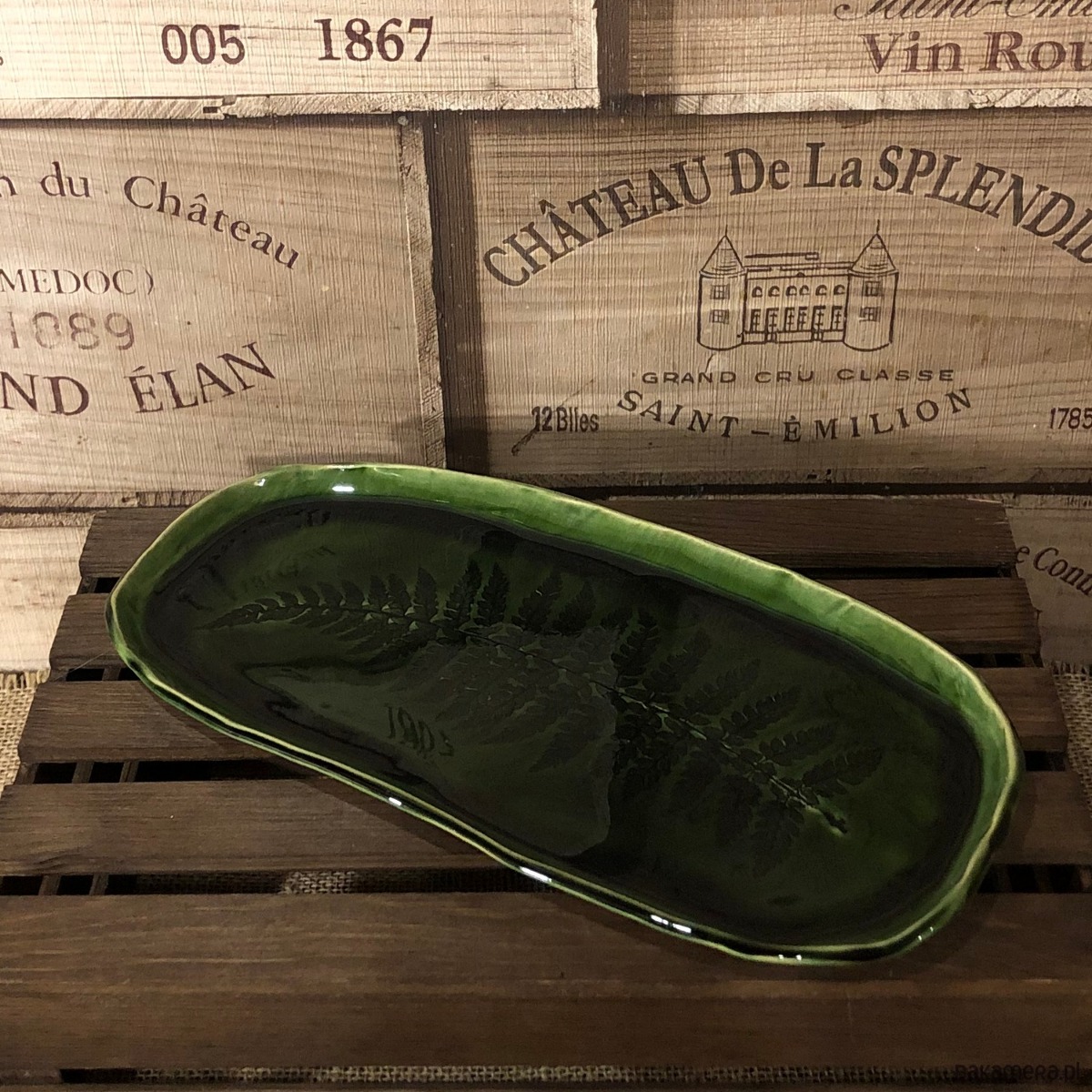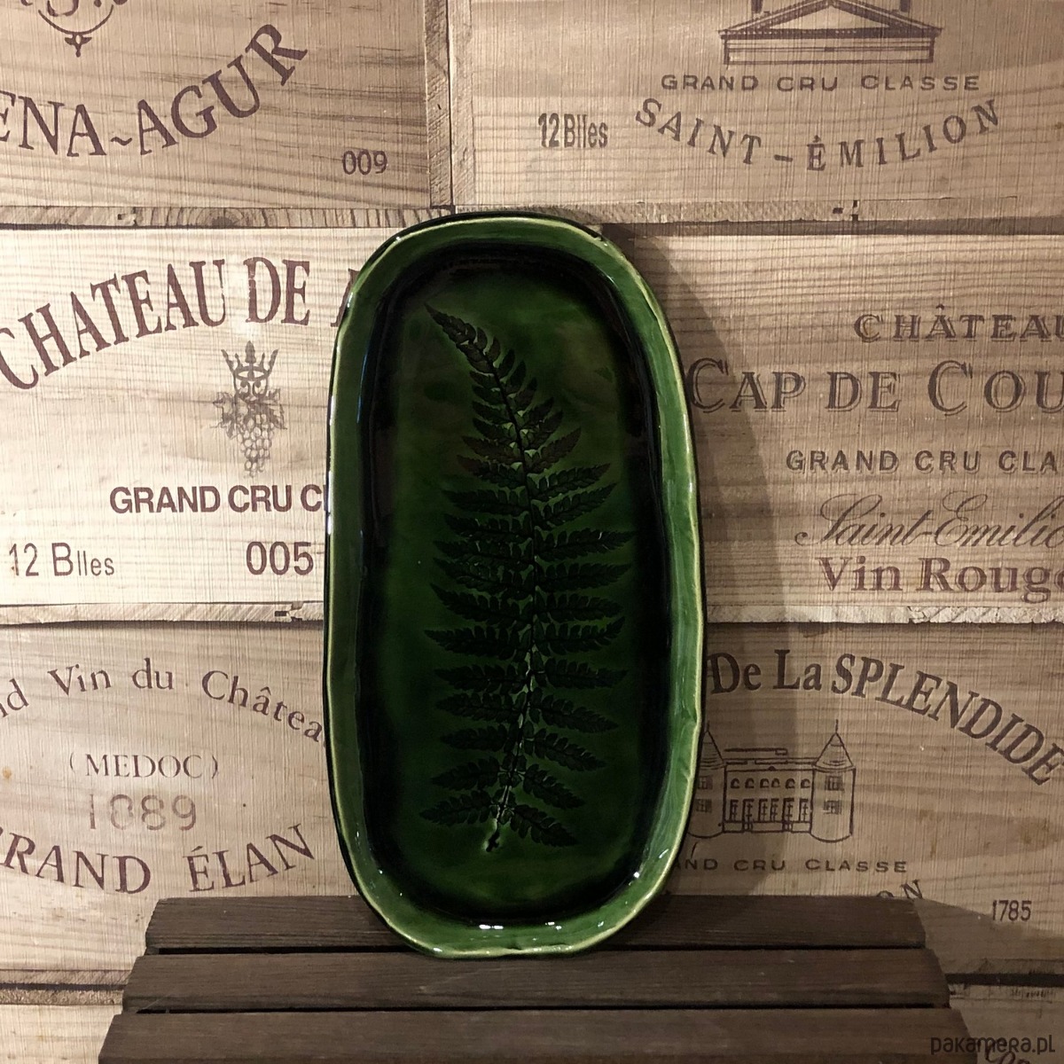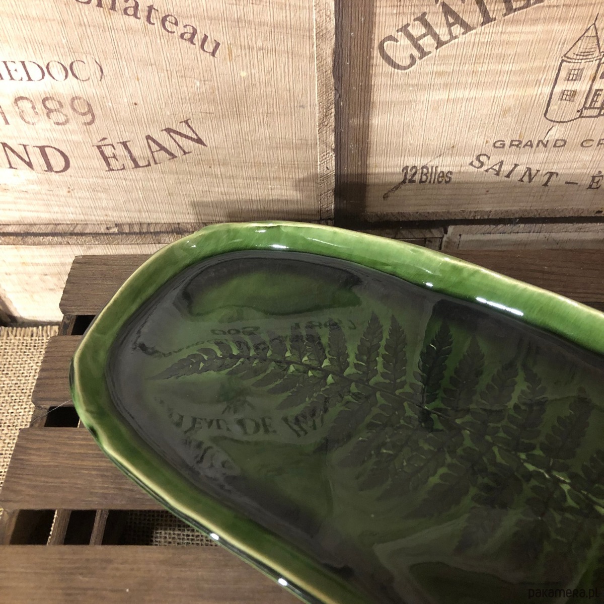 Patera ceramiczna w kolorze oliwkowej zieleni z odciśniętym wzorem naturalnego liścia paproci.
