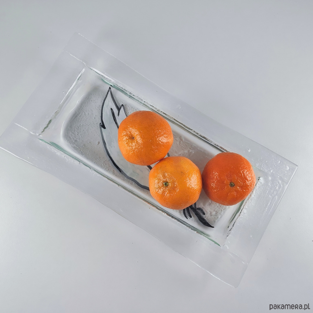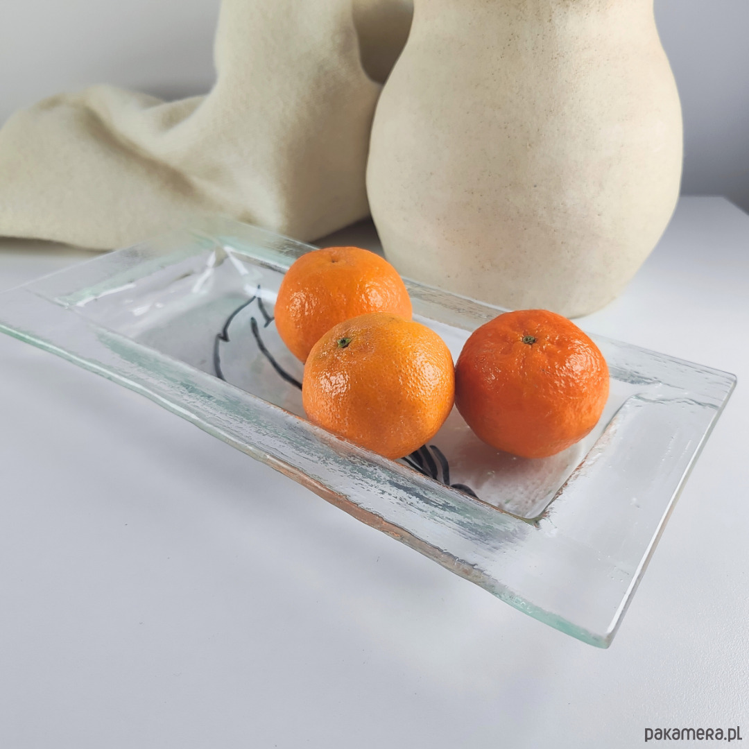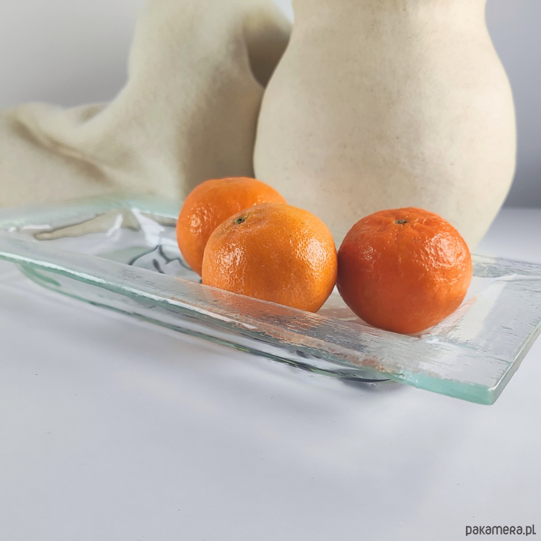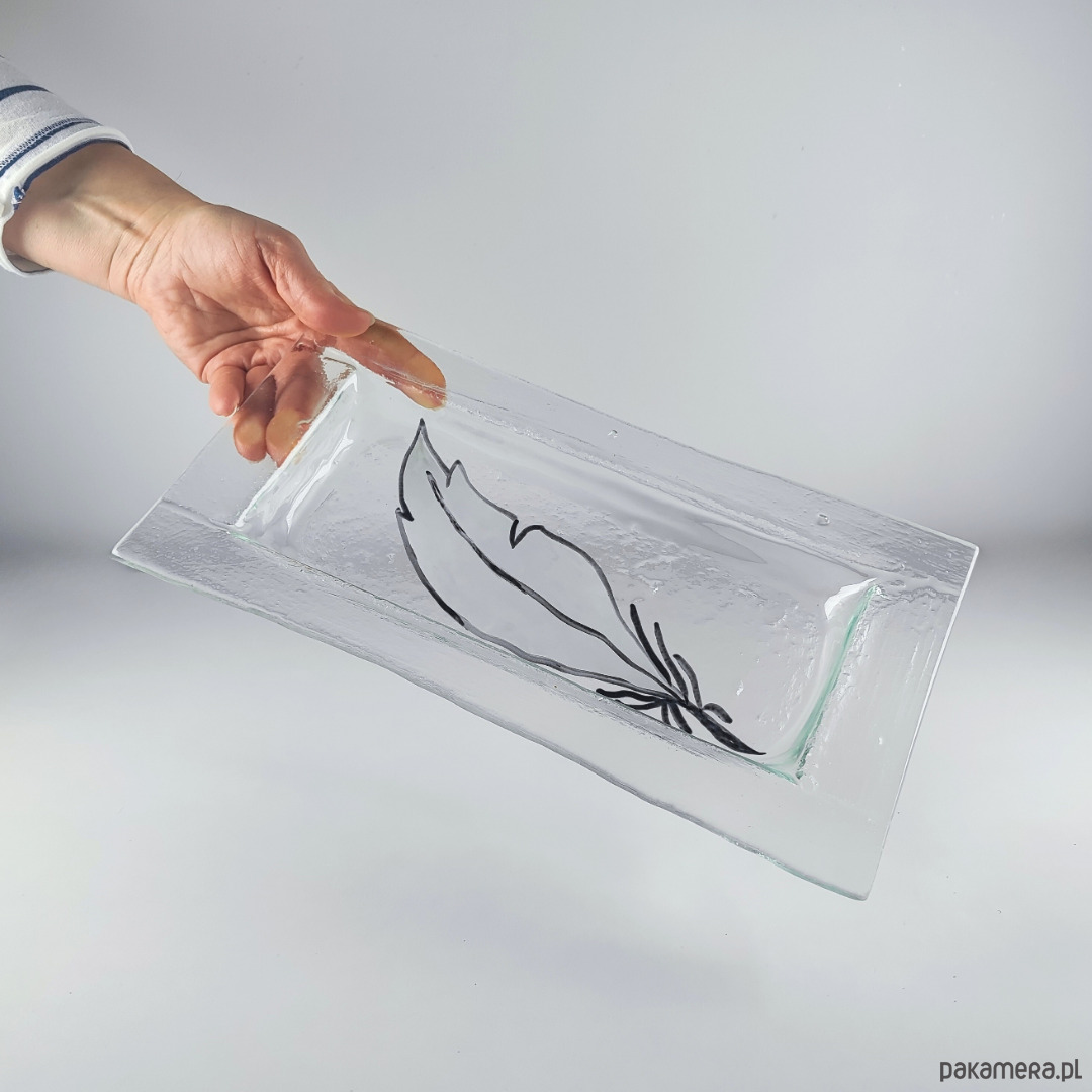 Szklana, prostokątna patera. Pióro malowane i wypalone w piecu.