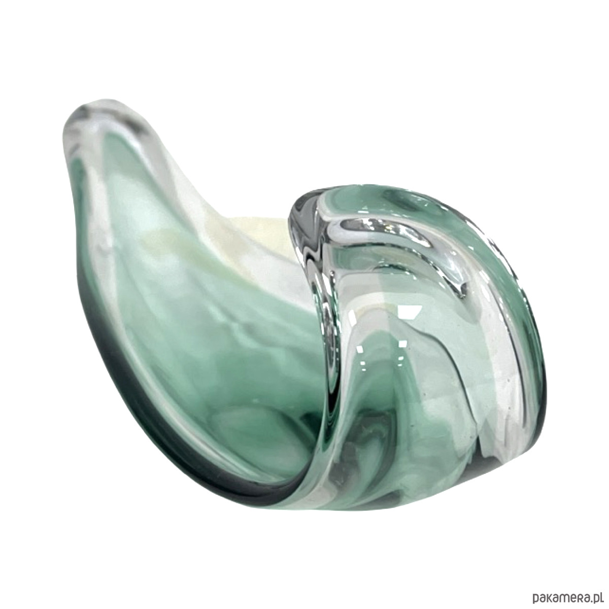 Dynamiczna, falująca forma z uniesionymi krawędziami oraz płynne przejścia kolorystyczne w odcieniach zieleni i transparentu są typowe dla włoskiego modernizmu okresu mid-century. Grube, ciężkie szkło o wysokiej klarowności i subtelnych refleksach światła podkreśla rzemieślniczy charakter przedmiotu.