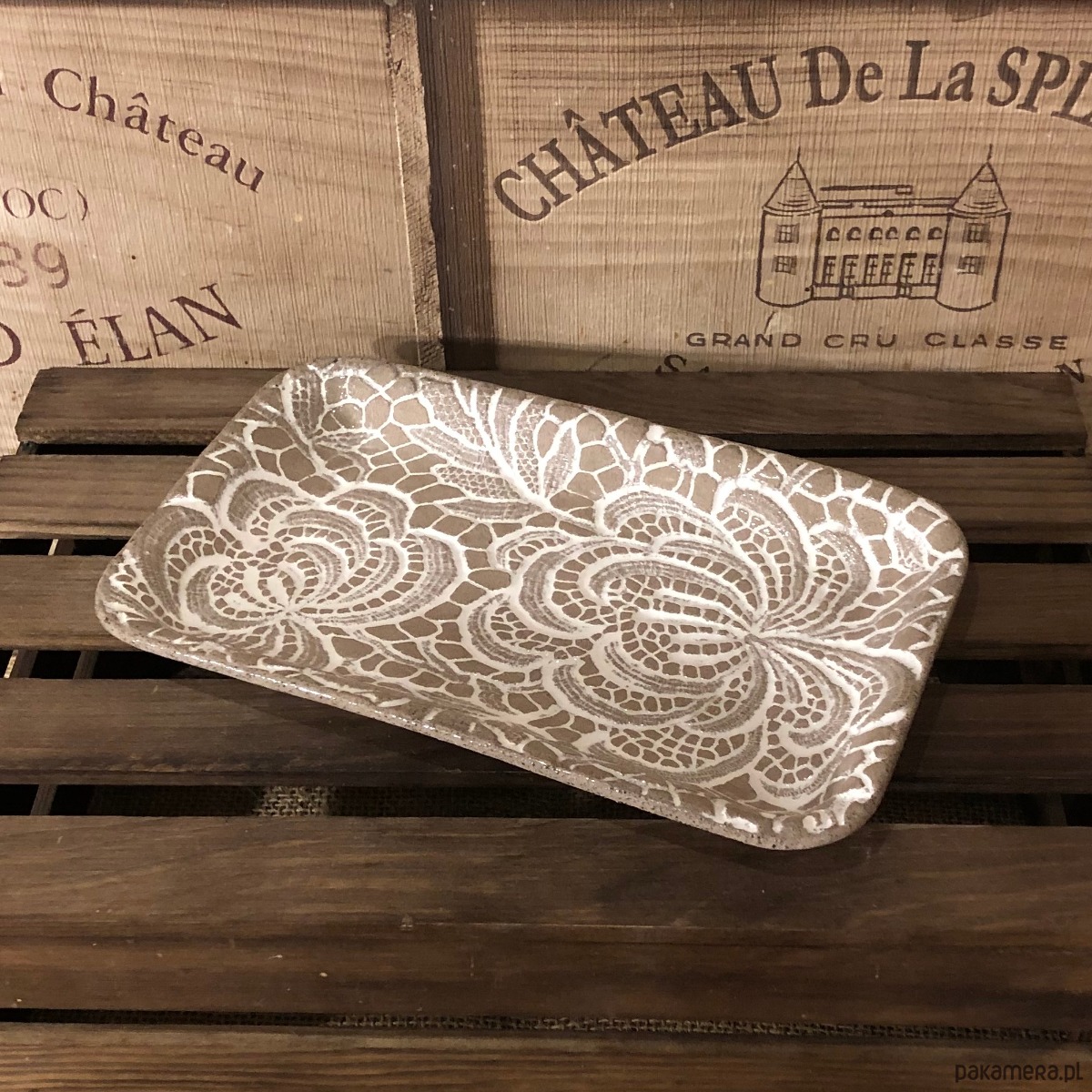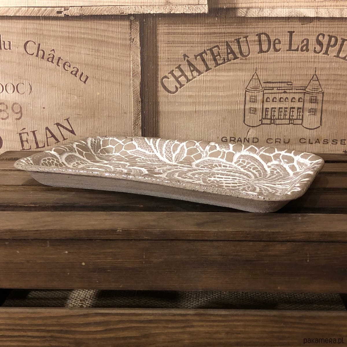 Paterka w kolorze beżowym z odciśniętym wzorem koronki. Wykonana ręcznie z beżowej gliny, pokryta szkliwem transparentnym spożywczym (szkliwo zostało nałożone na wierzchnią część paterki, spód z surowej gliny)