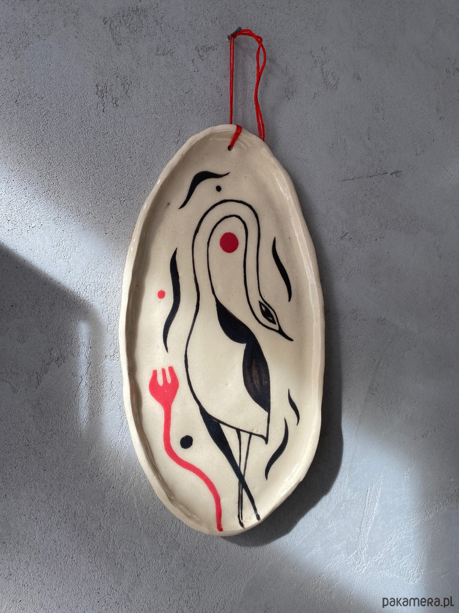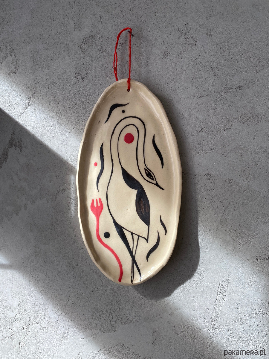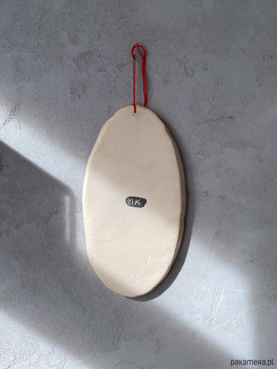 Mała patera z gliny, ręcznie robiona i malowana, wypalona w wysokiej temperaturze. Poprzez swoją formę oraz grafikę - ma bardzo organiczny charakter. Idealna na przekąski, biżuterię oraz dekorację ścienną. Świetnie sprawdzi się także na prezent :) Każdy talerz robiony jest ręcznie, więc nie ma dwóch identycznych, ale dzięki temu że jest "nieidealny", czyni go to unikatowym i niepowtarzalnym:) Talerzyk jest częścią większej kolekcji dostępnej na moim profilu (na 4 i 5 zdjęciu inne przedmioty z tej kolekcji) Paterka w zestawie z czerwonym sznureczkiem.