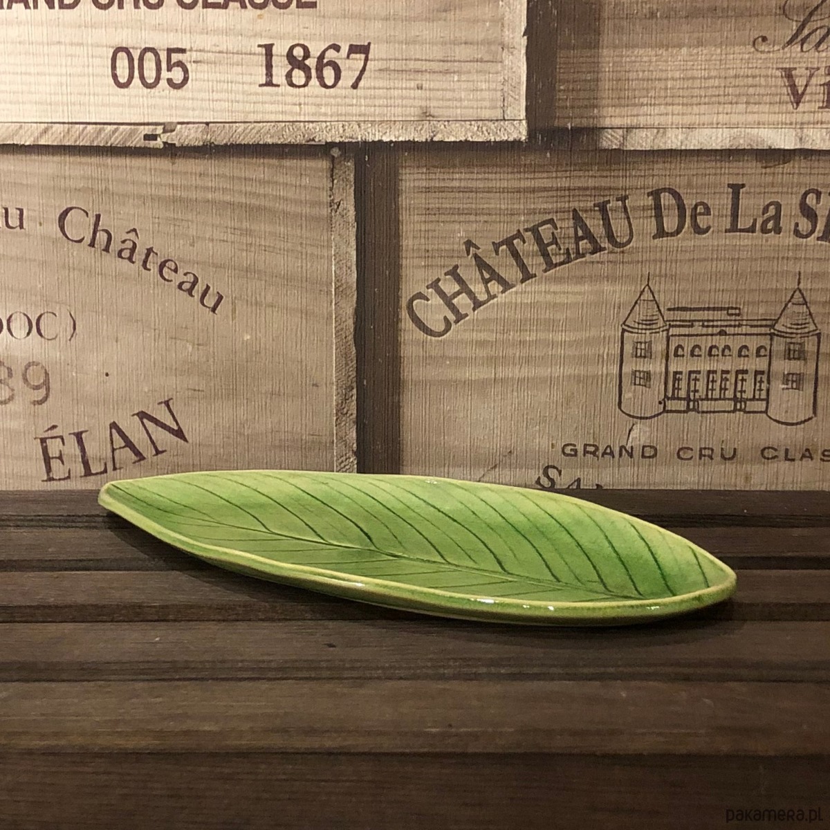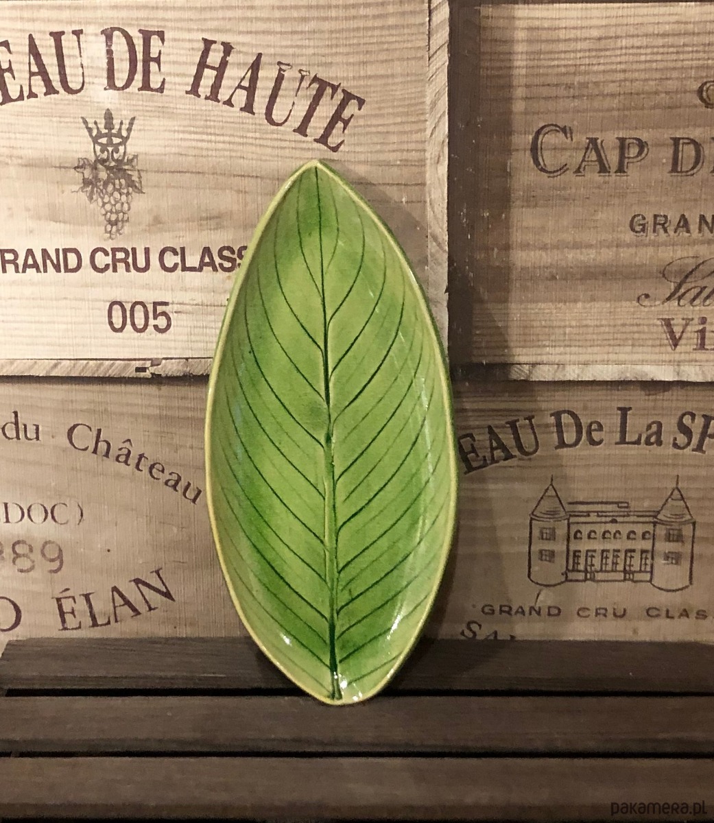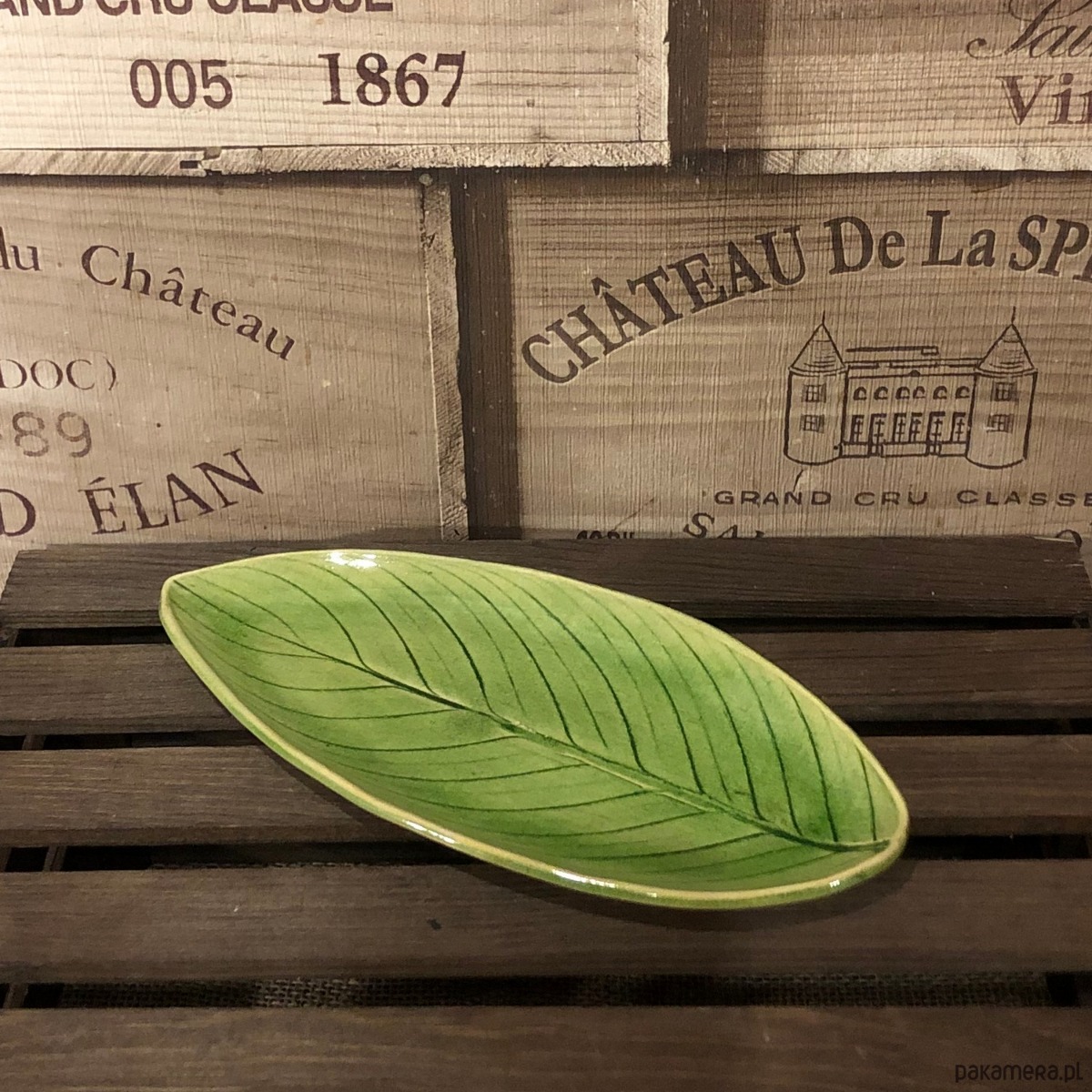 Patera ceramiczna w kolorze soczystej zieleni z odciśniętym wzorem naturalnego liścia skrzydłokwiatu.