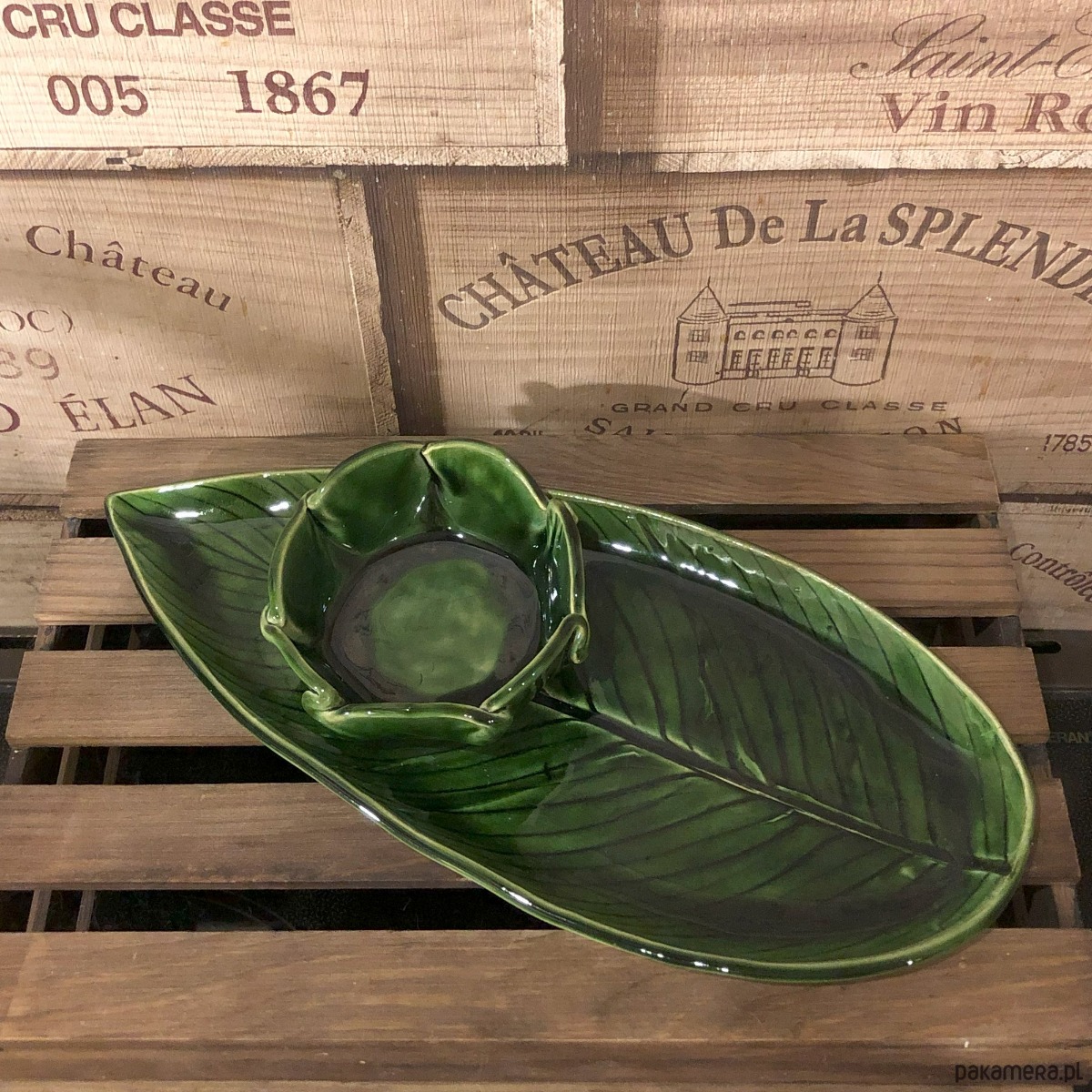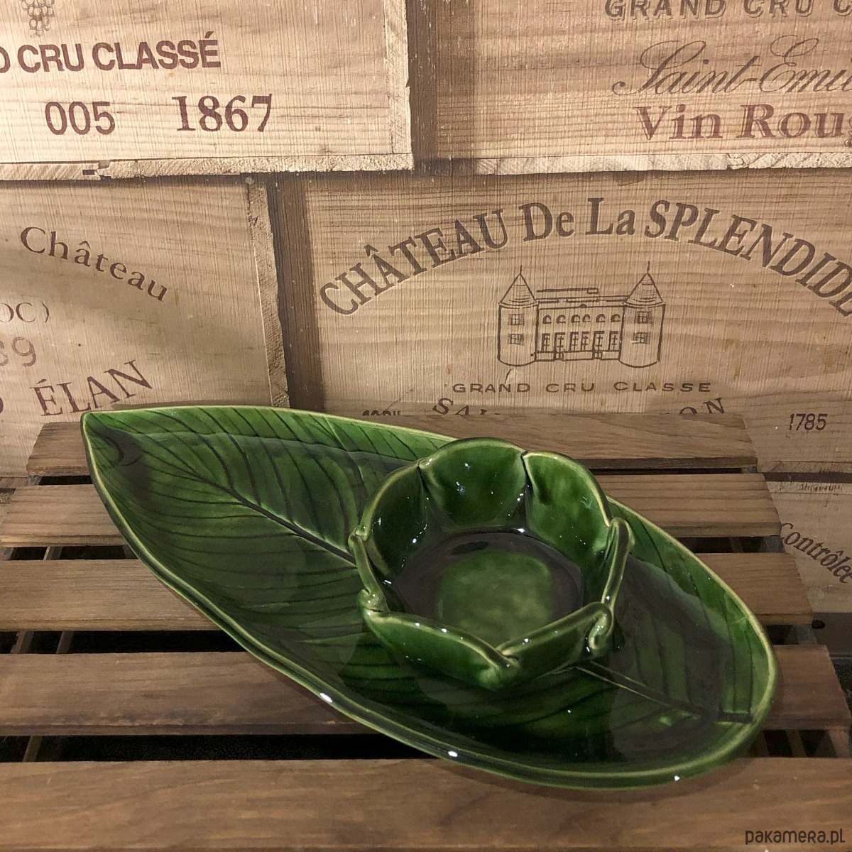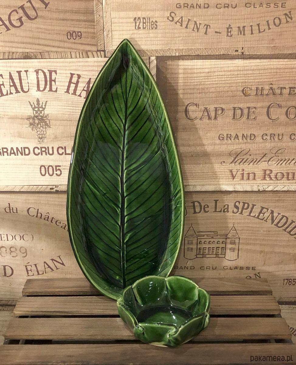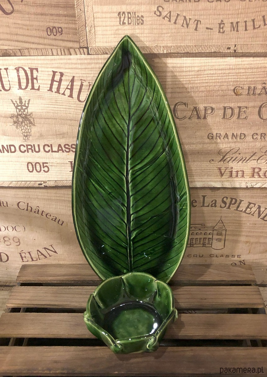 Zestaw ceramiczny w kolorze oliwkowej zieleni. Na paterce odciśnięty wzór naturalnego liścia skrzydłokwiatu.
