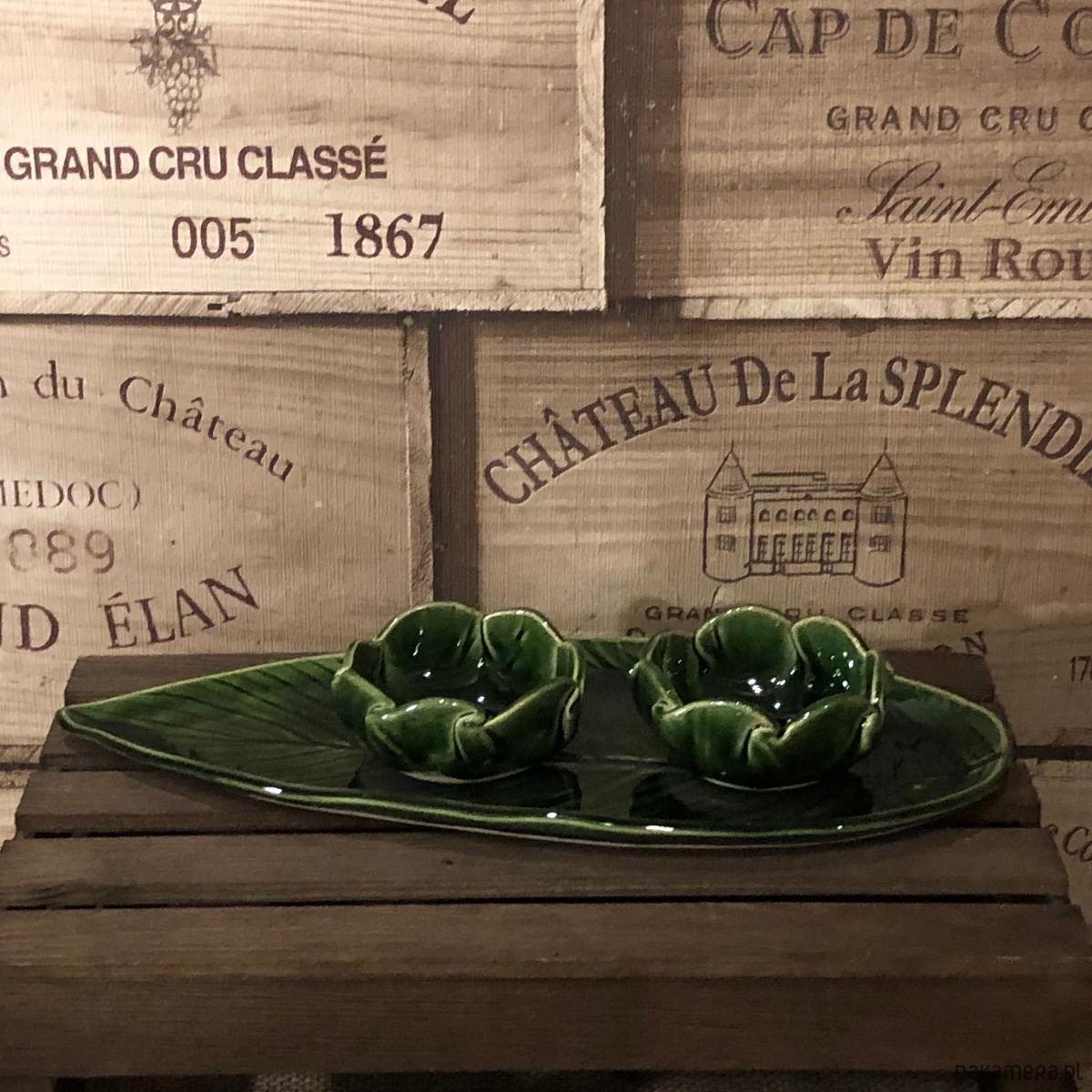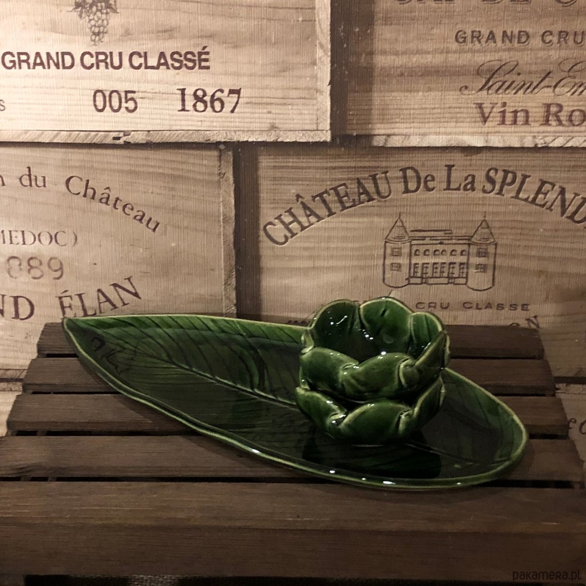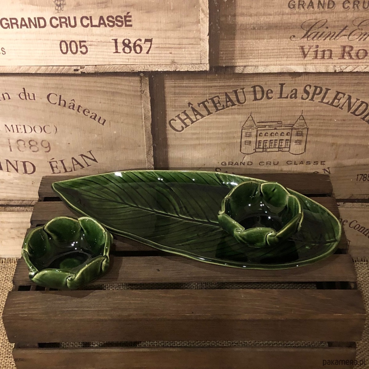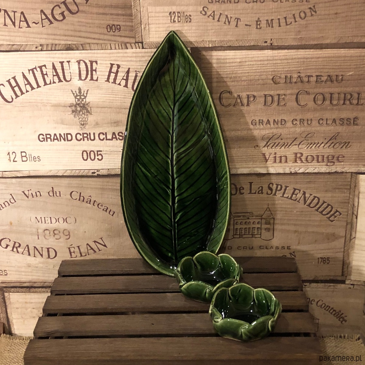 Zestaw ceramiczny w kolorze oliwkowej zieleni. Na paterce odciśnięty wzór naturalnego liścia skrzydłokwiatu.