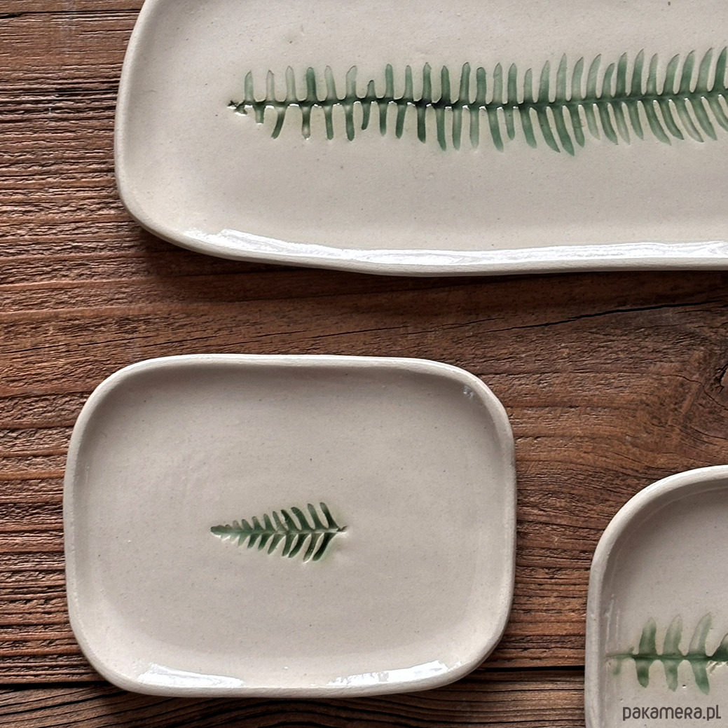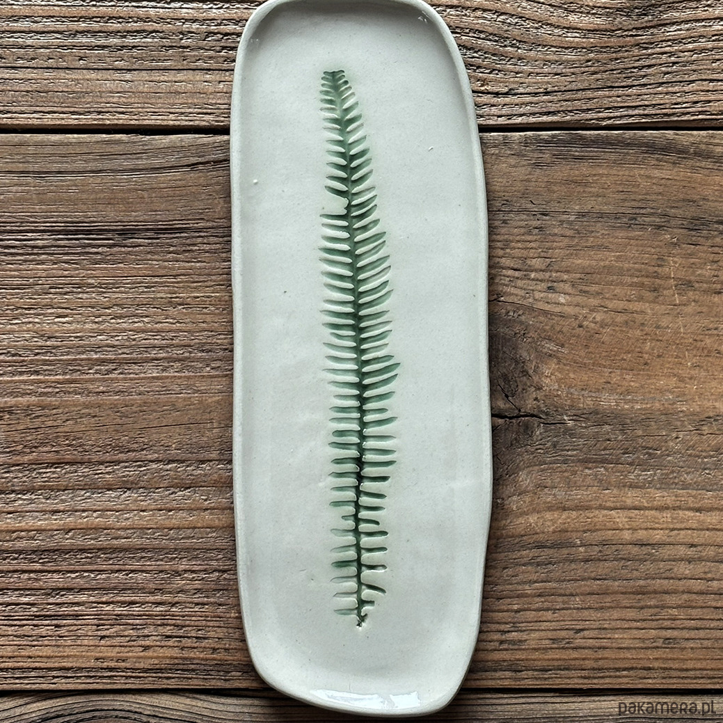Jasnokremowa paterka ze wzorem roślinnym paprotki przywiezionej z podróży.