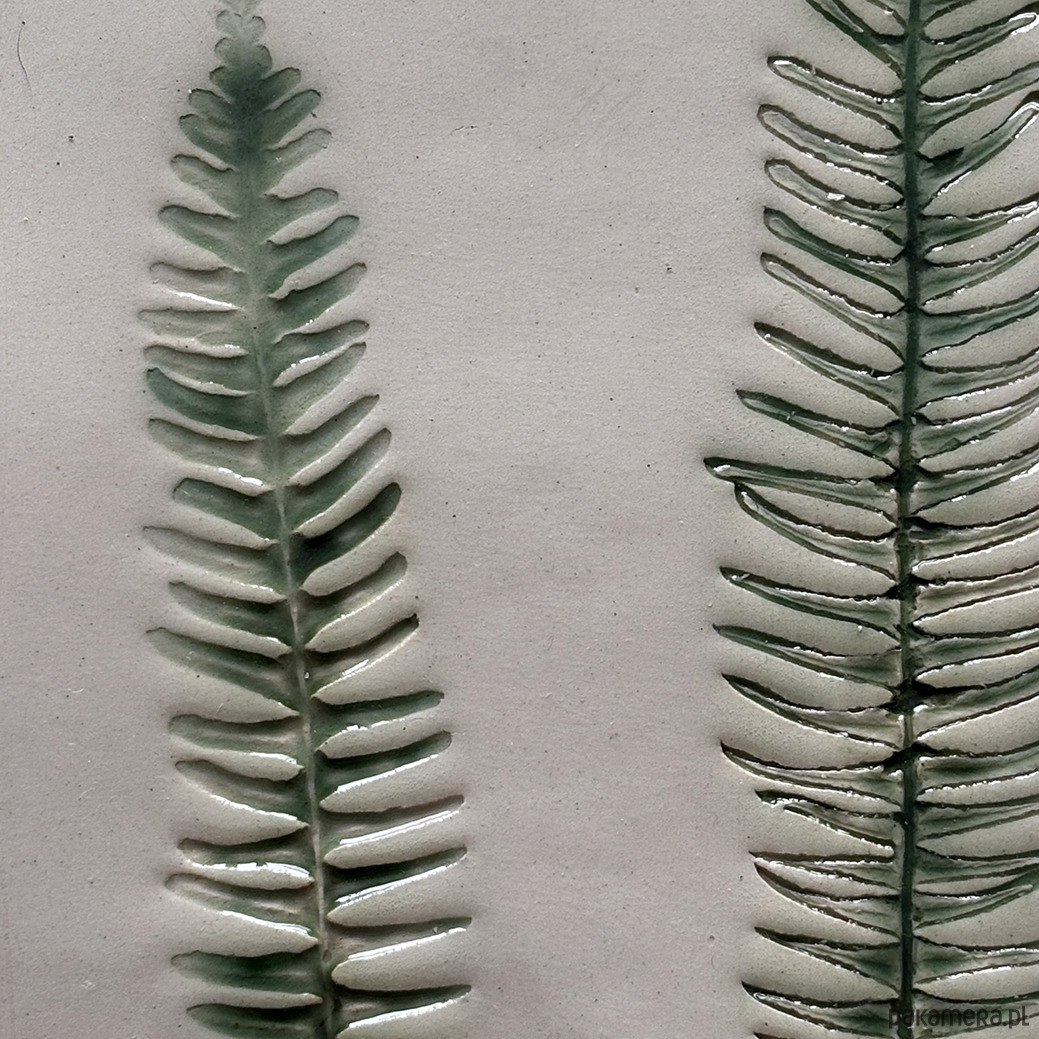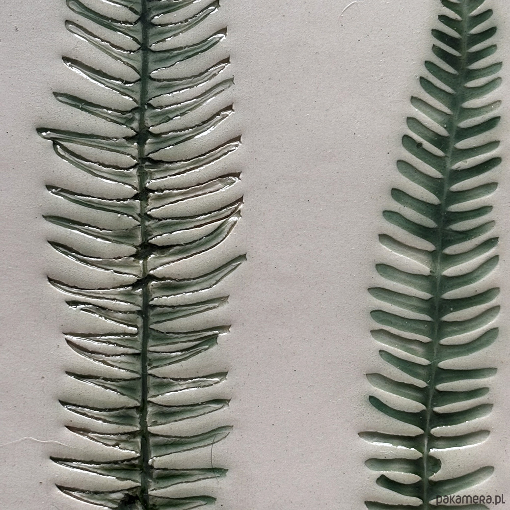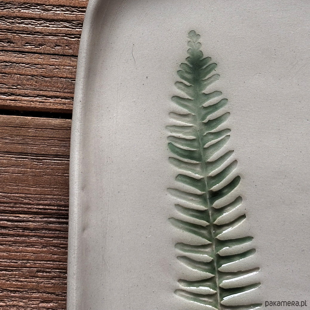 Jasnokremowa paterka ze wzorem roślinnym paprotki przywiezionej z podróży.