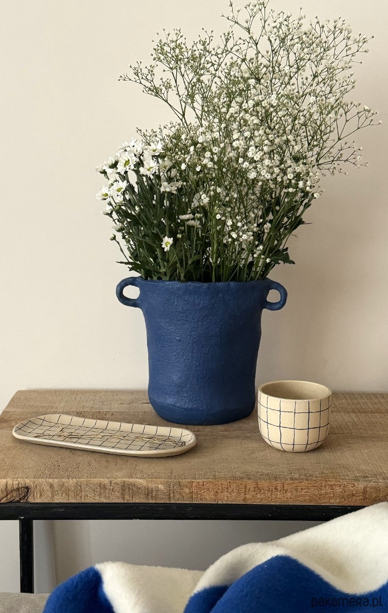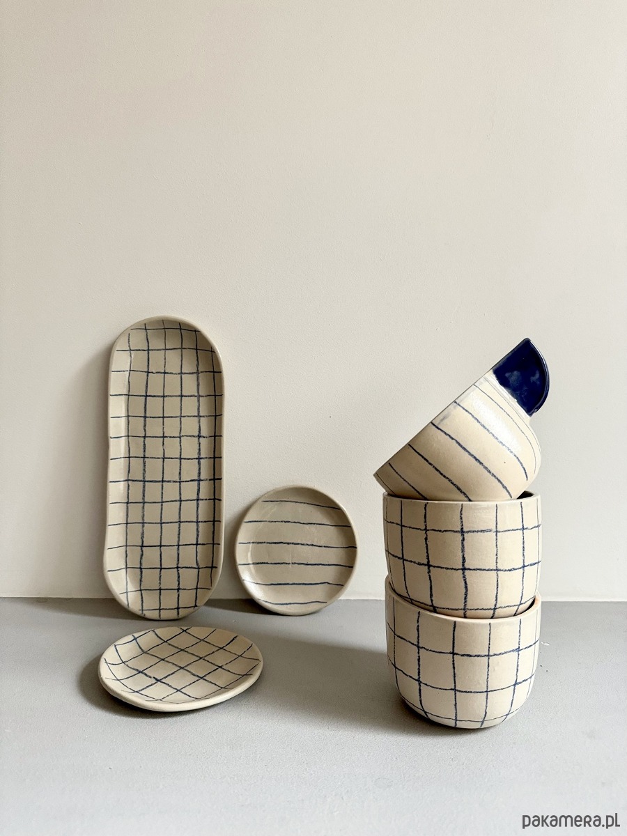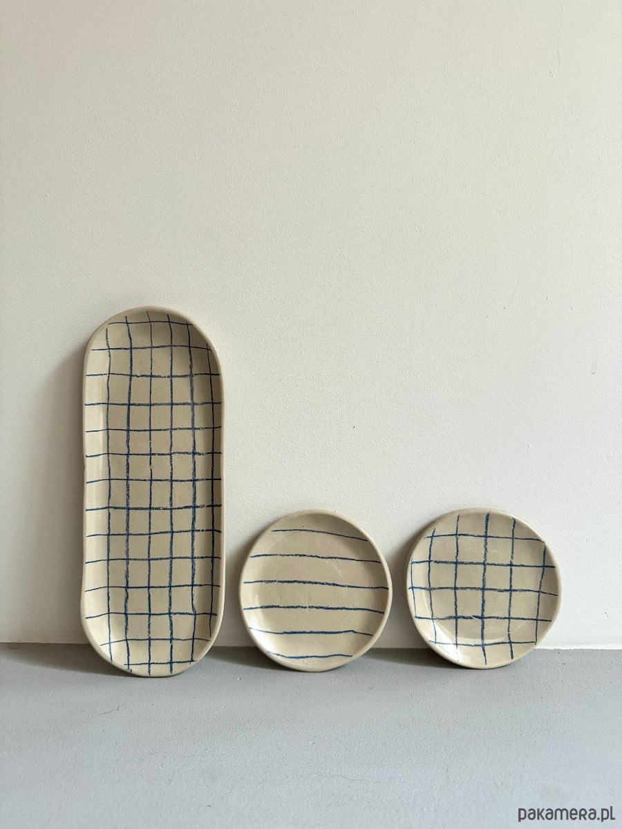 Ręcznie robiony i malowany kamionkowy talerz/patera na małe przekąski lub biżuterię w niebieską kratkę