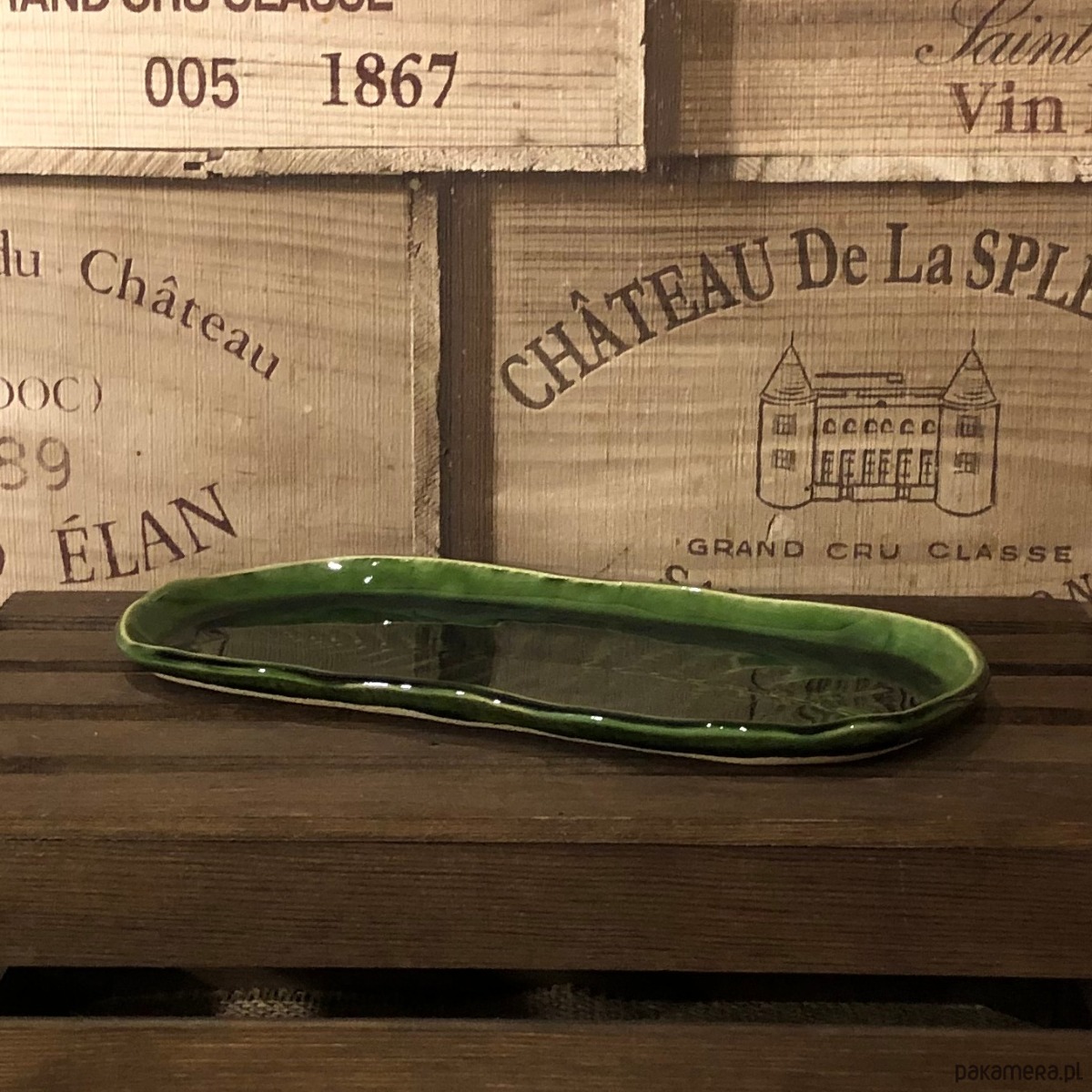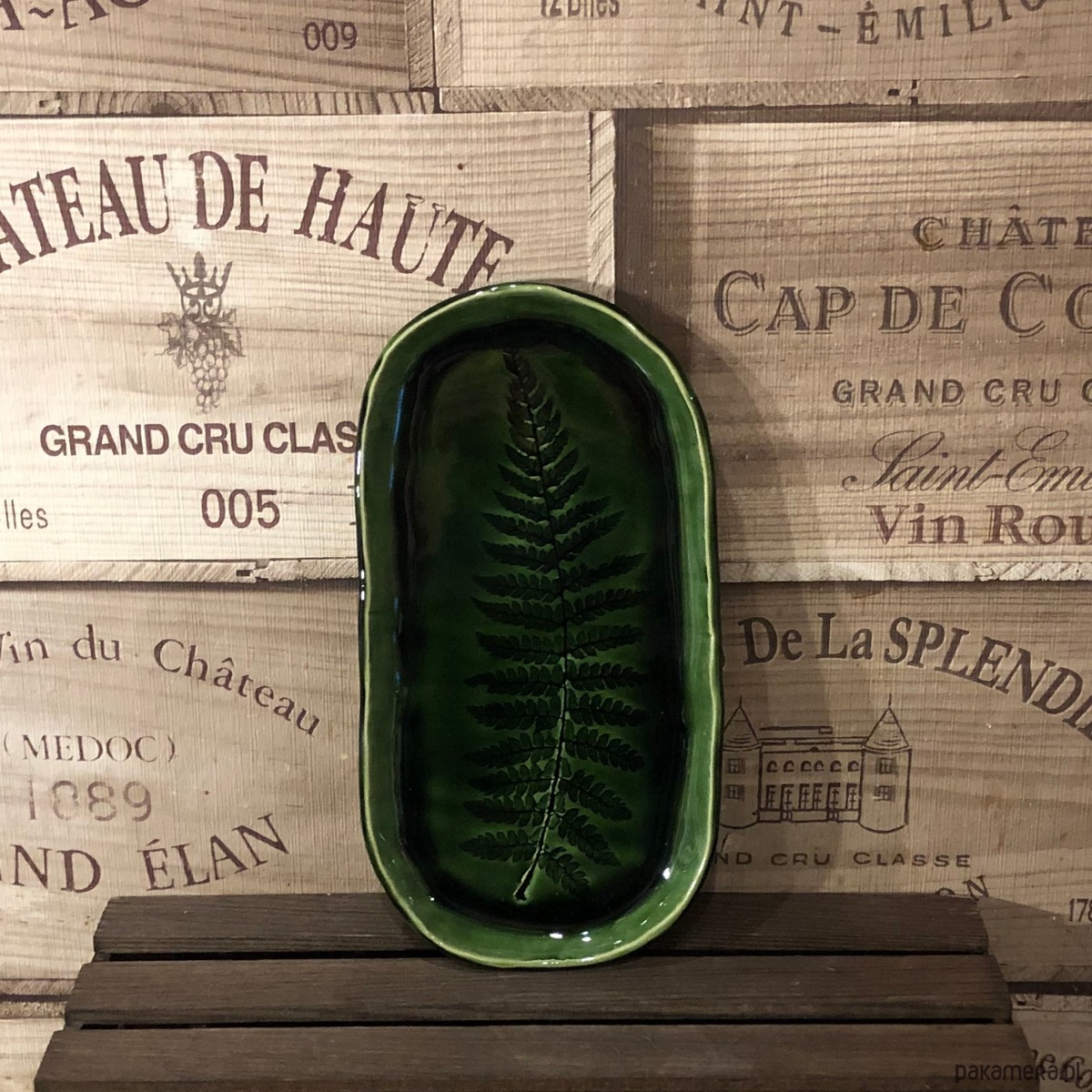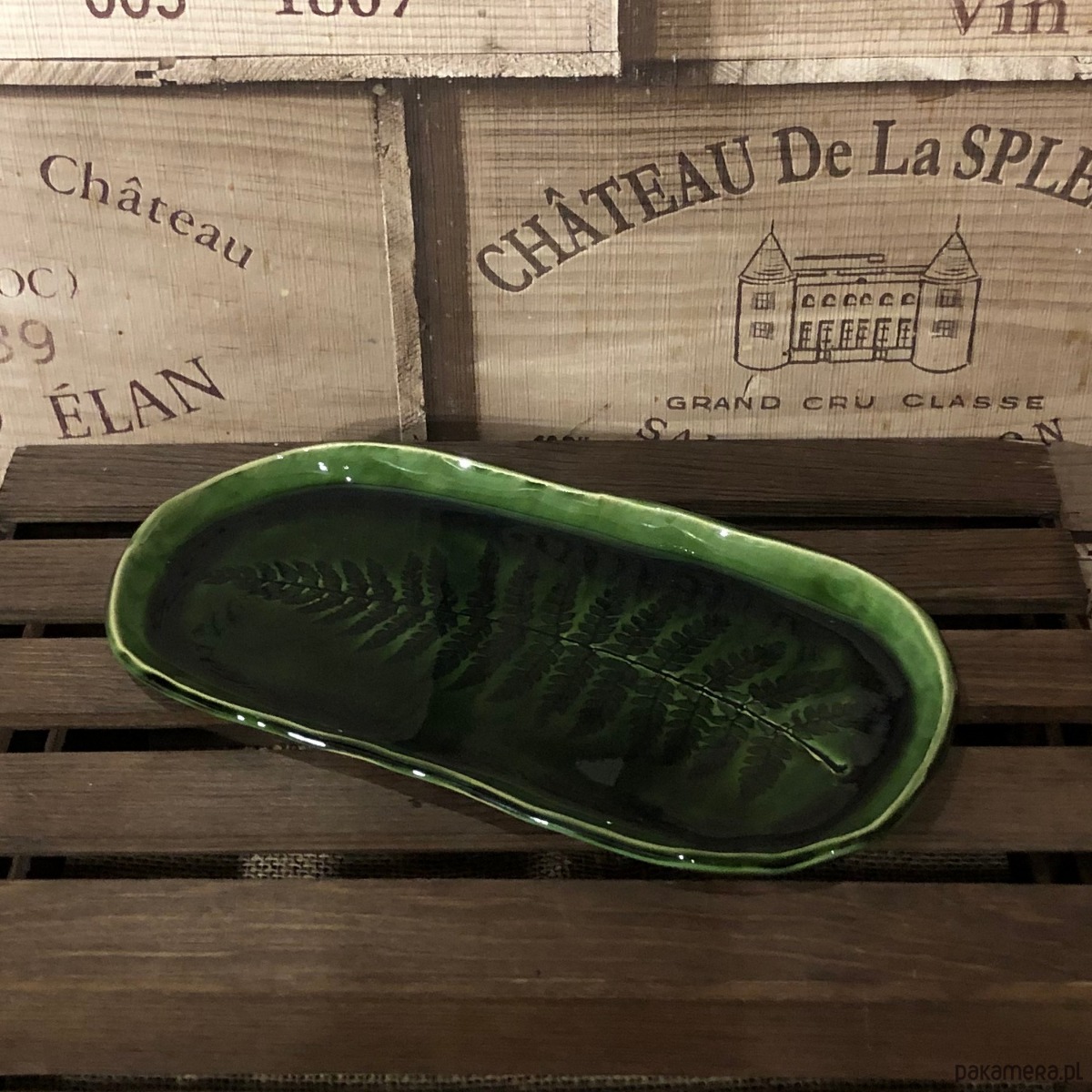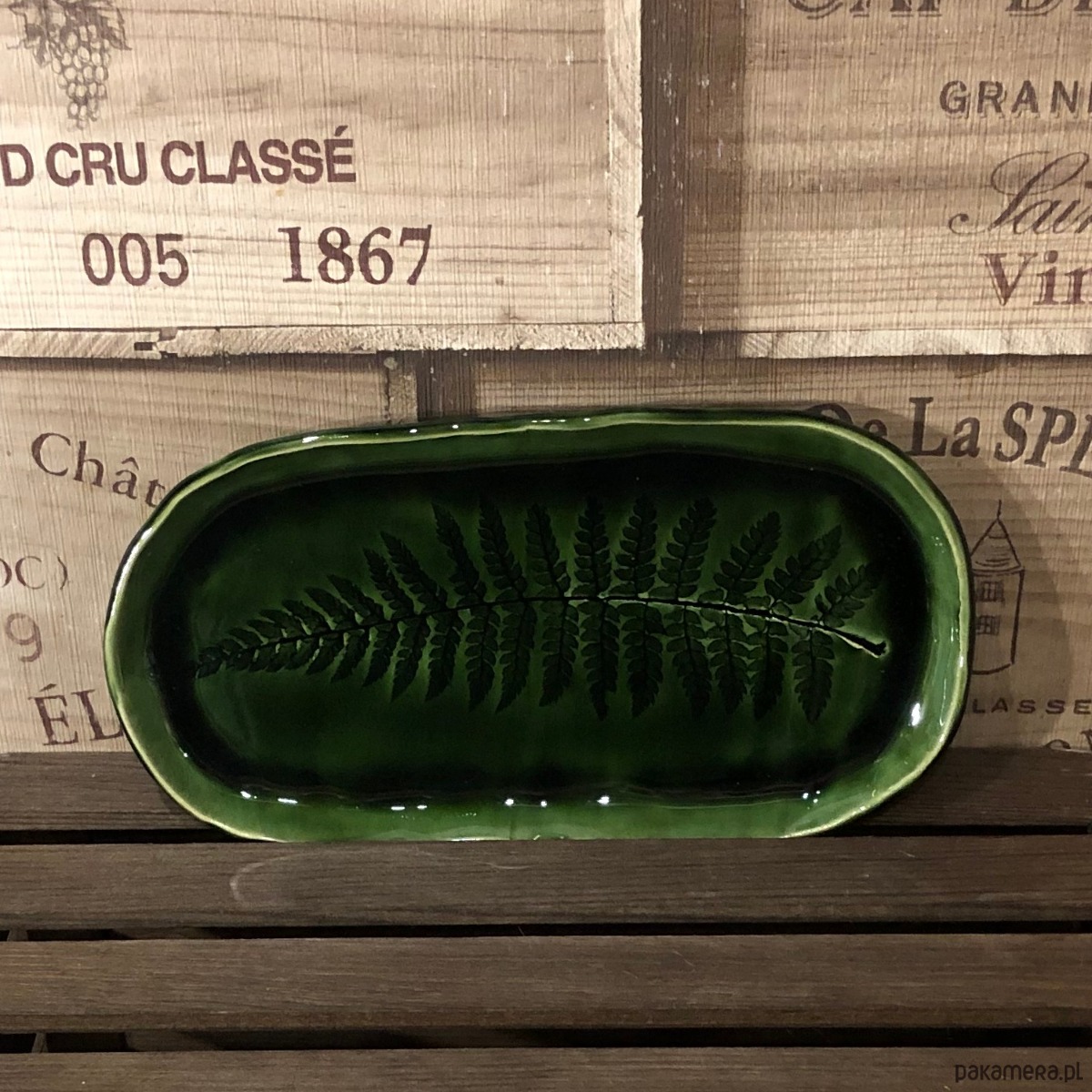 Patera ceramiczna w kolorze oliwkowej zieleni z odciśniętym wzorem naturalnego liścia paproci.