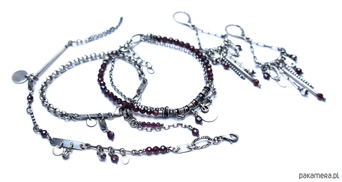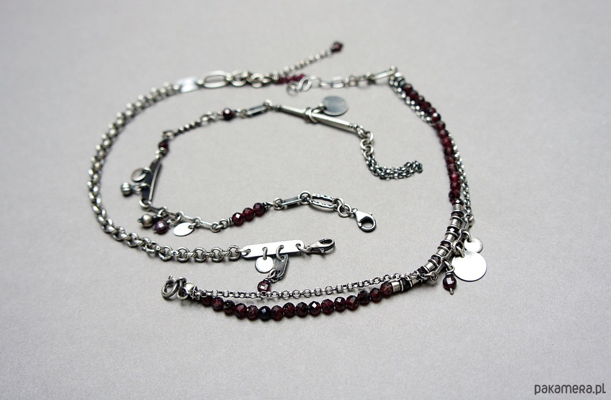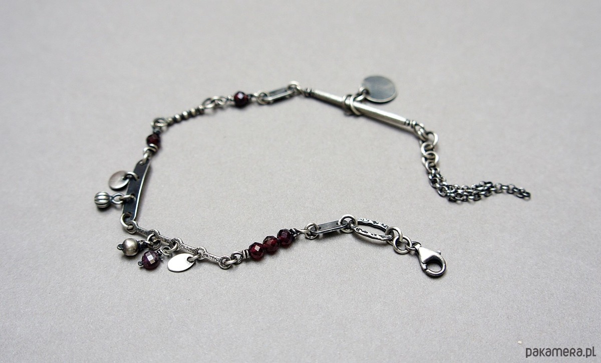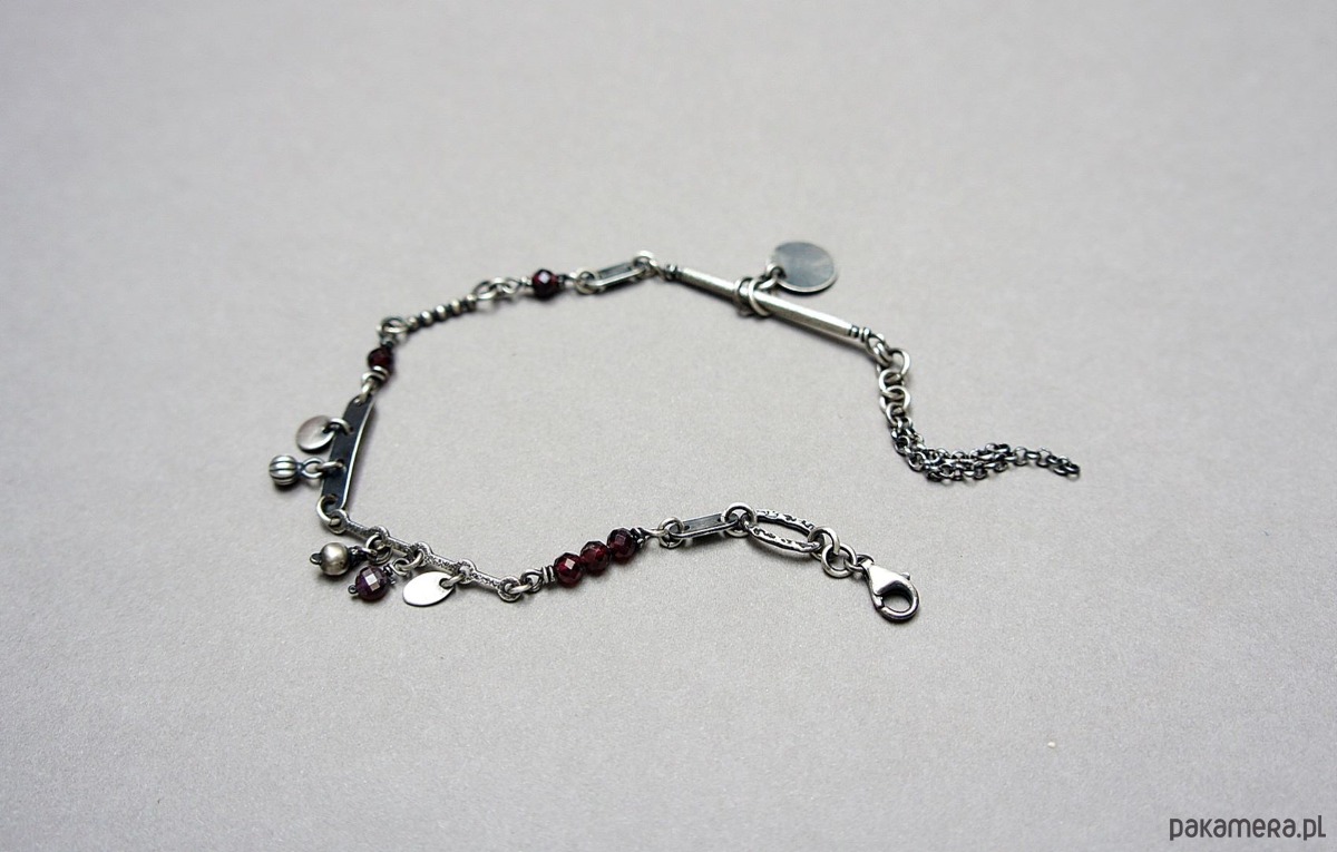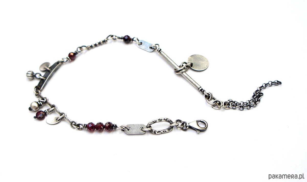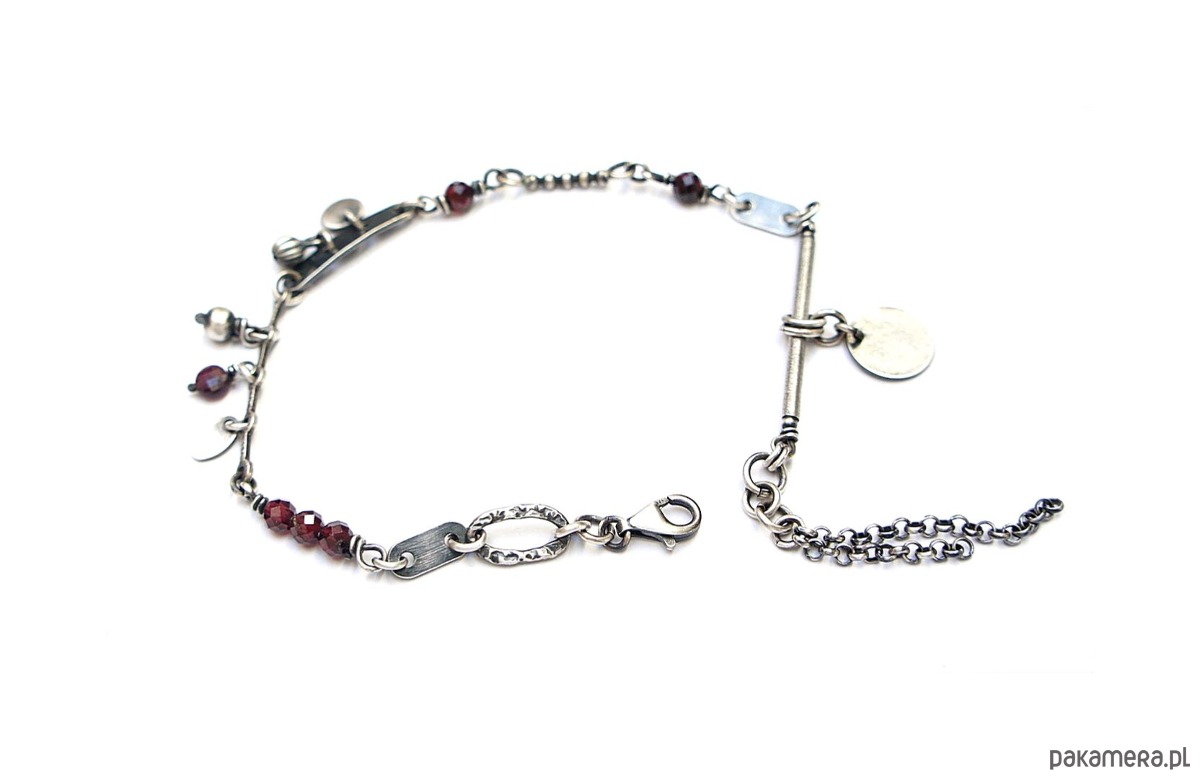 Bransoletka wykonana ze srebra pr. 925 w połączeniu z fasetowanymi kuleczkami granatów [4mm i 2mm] oraz srebrnymi blaszkami. Srebro oksydowane i przetarte. Całkowita długość bransoletki 19cm plus dodatkowe ogniwo i ozdobna przedłużka .
