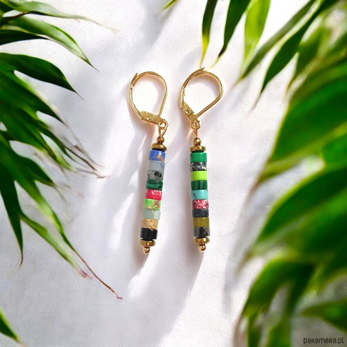 Urocze, wielobarwne kolczyki wykonane z plasterków mix kamieni 4mm i przekładek ze złotego hematytu.