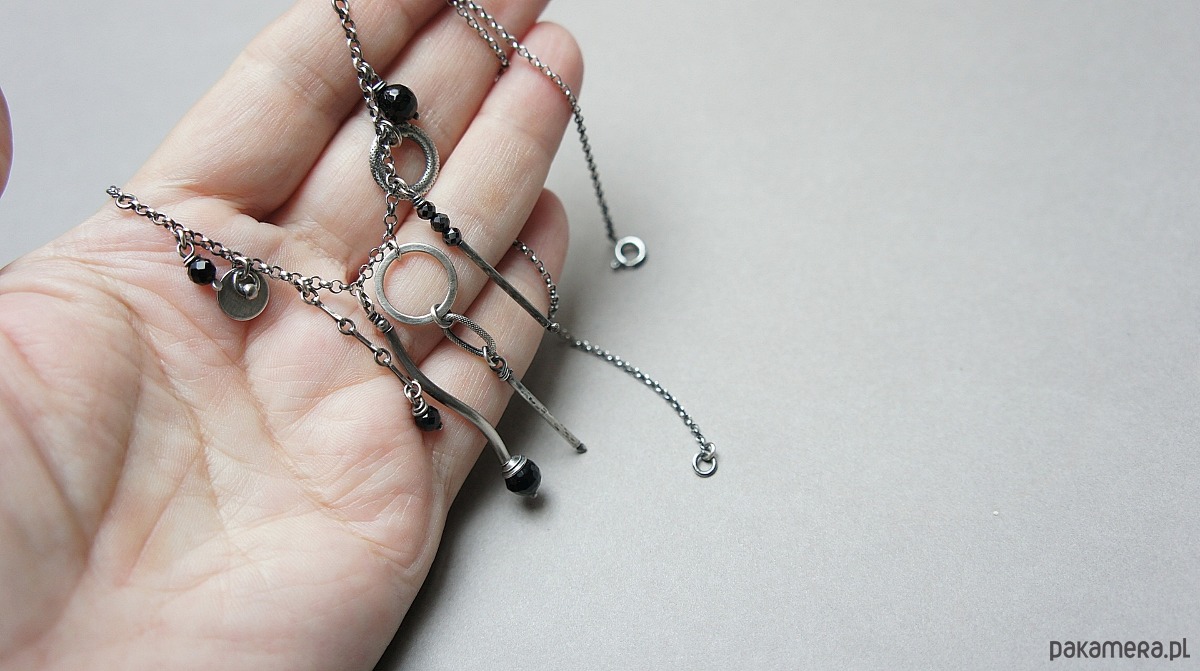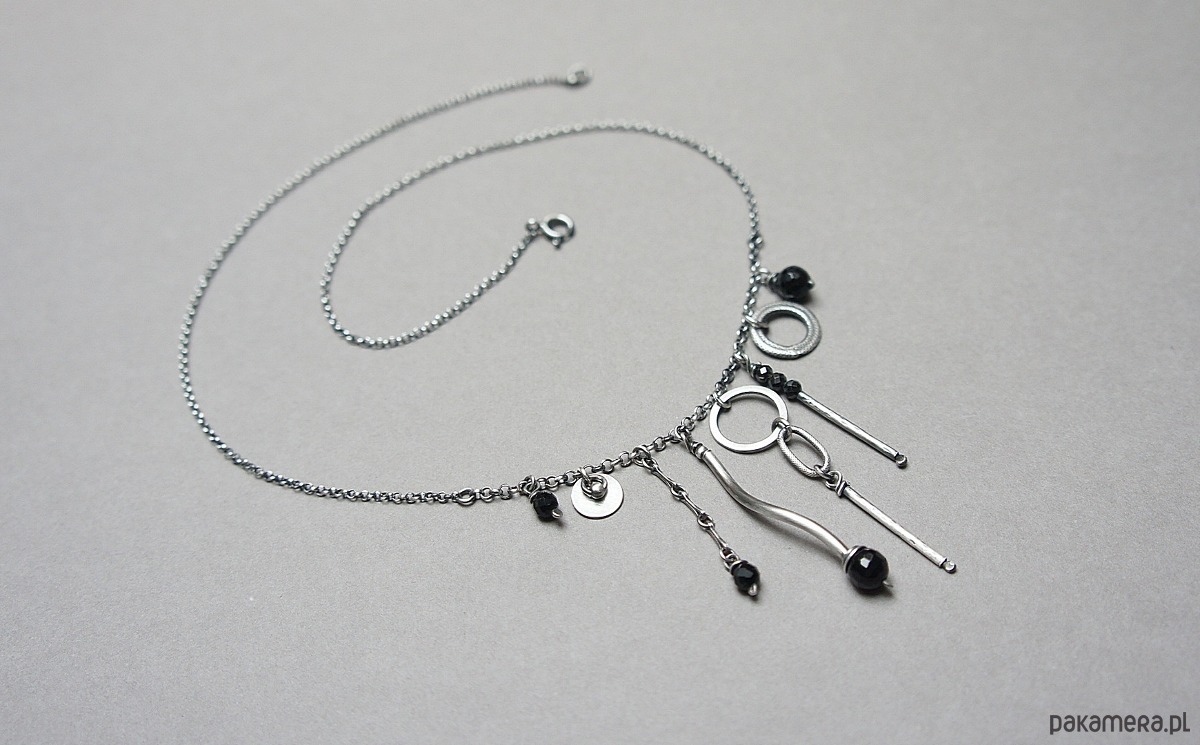 Naszyjnik wykonany ze srebra [pr. 925] w połączeniu z fasetowanymi kuleczkami onyksów [4mm i 6mm], fasetowanymi spinelami [3mm] oraz srebrnymi zawieszkami. Srebro oksydowane i przetarte. Całkowita długość naszyjnika 46cm. Biżuteria ozdobnie zapakowana.