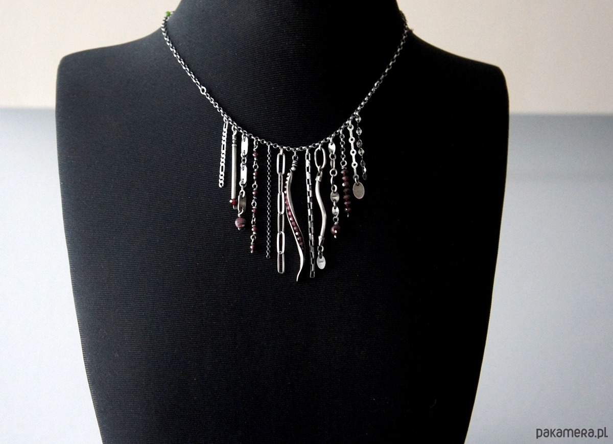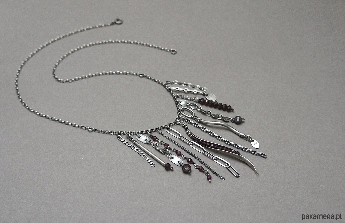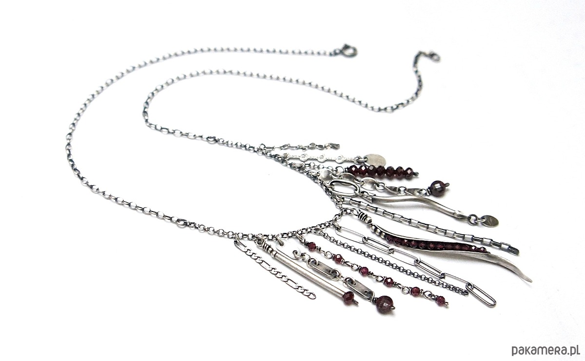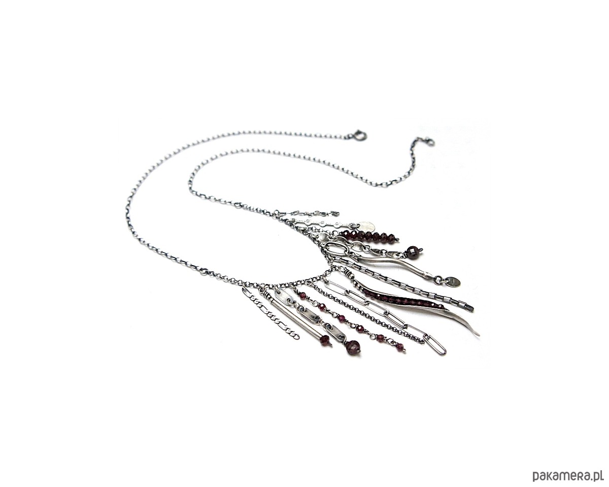 Naszyjnik wykonany ręcznie ze srebra [pr. 925] w połączeniu z fasetowaną pastylkami granatów [6mm], fasetowaną kuleczkami granatów [4mm i 2mm] oraz srebrnymi zawieszkami. Srebro oksydowane i przetarte. Całkowita długość naszyjnika 47cm. Biżuteria ozdobnie zapakowana.Modelka prezentuje bardzo podobny naszyjnik .