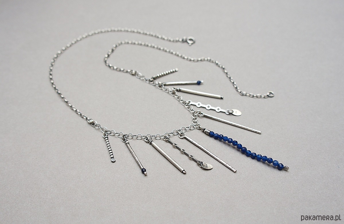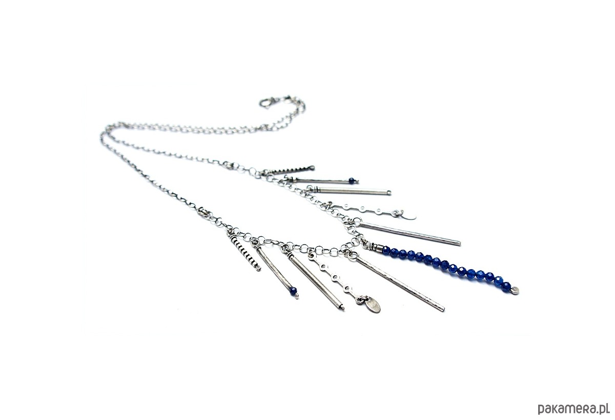 Naszyjnik wykonany ze srebra [pr. 925] w połączeniu z fasetowanymi kuleczkami szafirów [2mm ,syntetyczne] oraz srebrnymi zawieszkami [ 20mm -55m]. Srebro oksydowane i przetarte. Całkowita długość naszyjnika 50cm. Biżuteria ozdobnie zapakowana