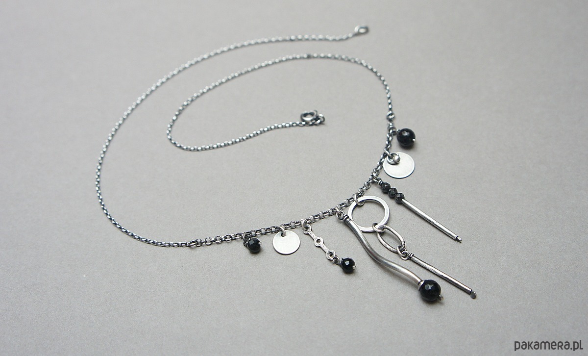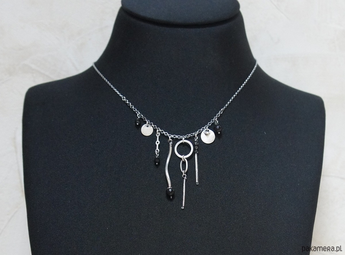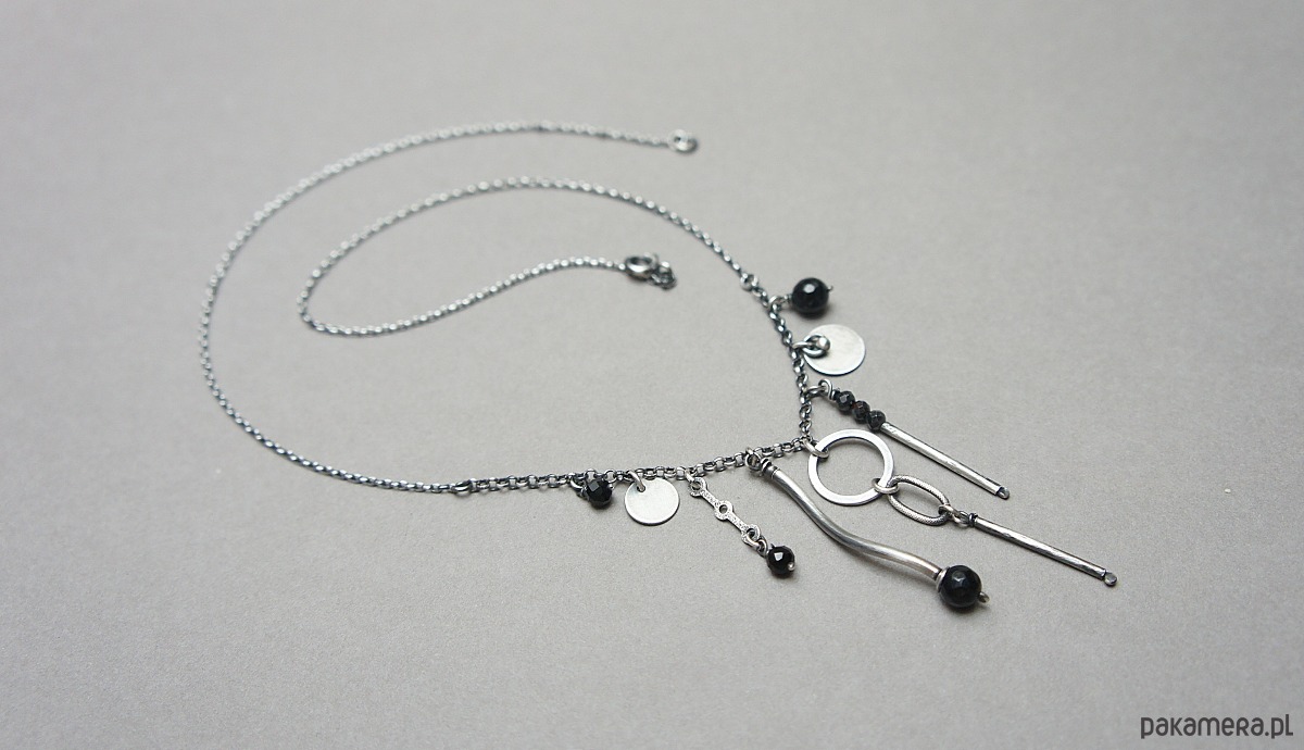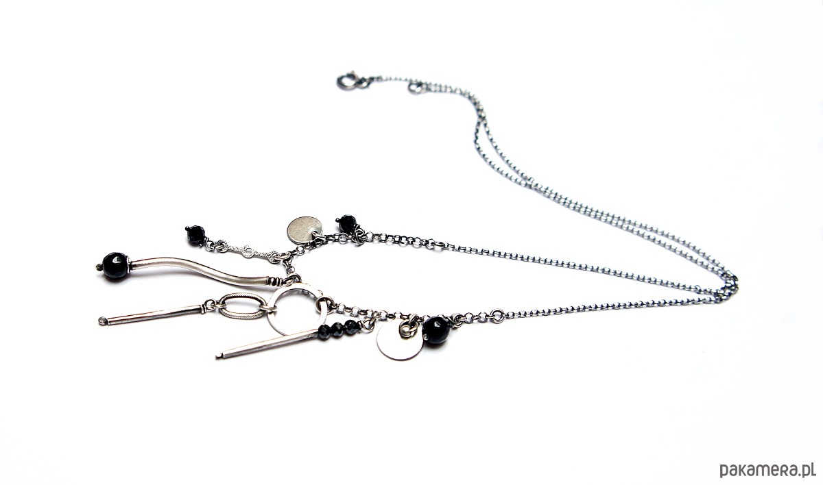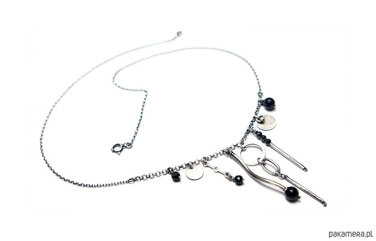 Naszyjnik wykonany ze srebra [pr. 925] w połączeniu z fasetowanymi kuleczkami onyksów [4mm i 6mm], fasetowanymi spinelami [3mm] oraz srebrnymi zawieszkami. Srebro oksydowane i przetarte. Całkowita długość naszyjnika 46cm. Biżuteria ozdobnie zapakowana.