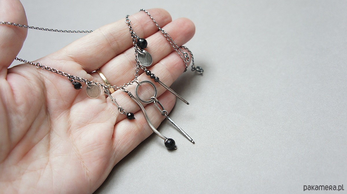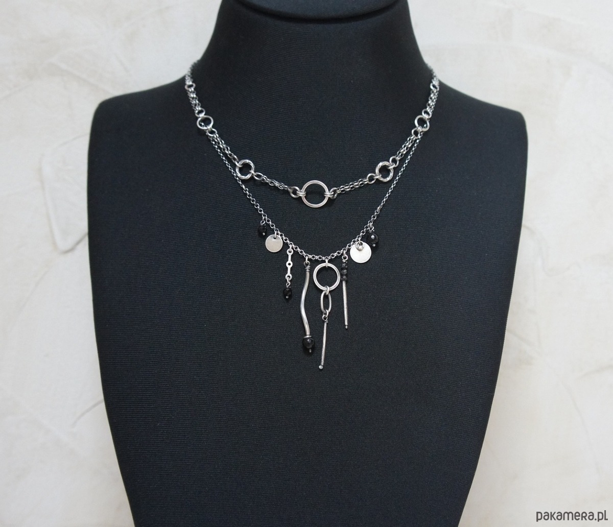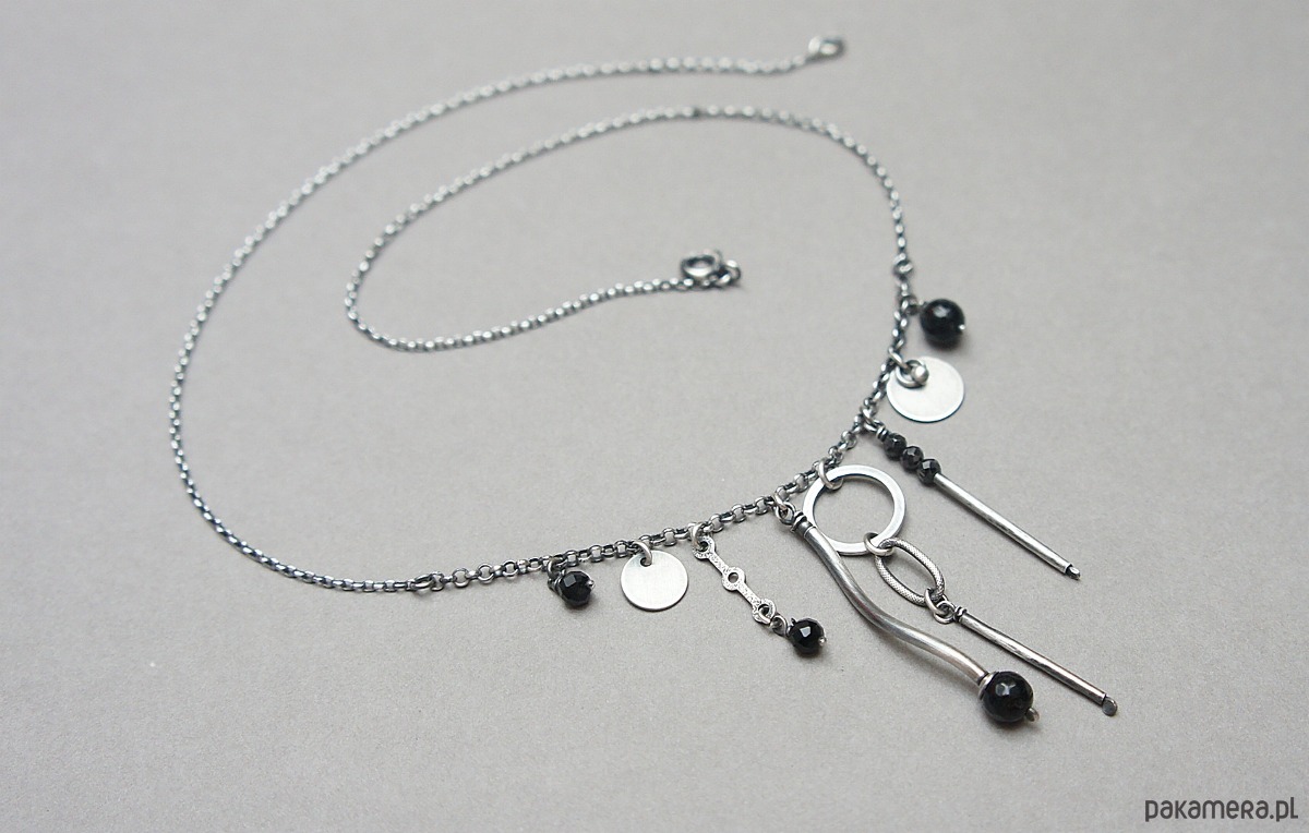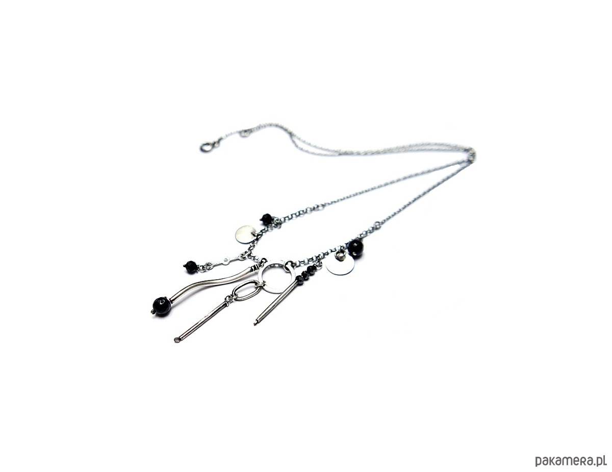 Naszyjnik wykonany ze srebra [pr. 925] w połączeniu z fasetowanymi kuleczkami onyksów [4mm i 6mm], fasetowanymi spinelami [3mm] oraz srebrnymi zawieszkami. Srebro oksydowane i przetarte. Całkowita długość naszyjnika 46cm. Biżuteria ozdobnie zapakowana.