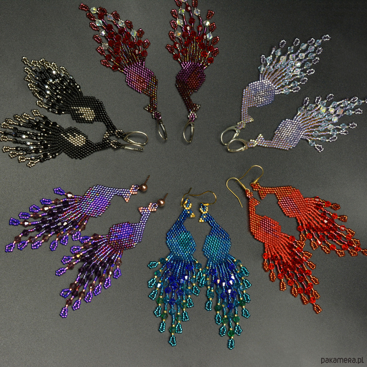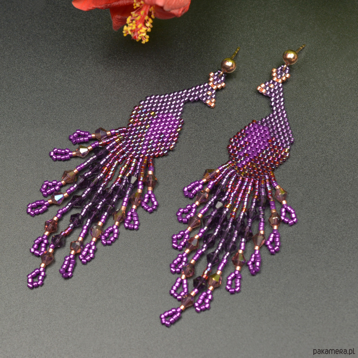Kolczyki w kształcie pawi wykonane czasochłonną techniką beadingu.