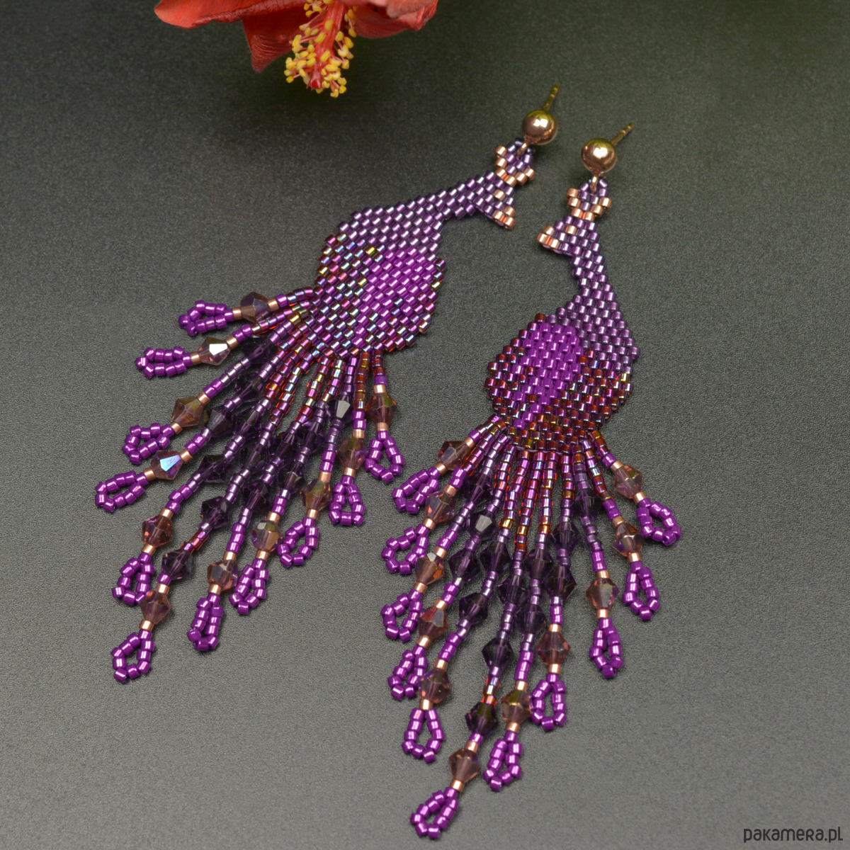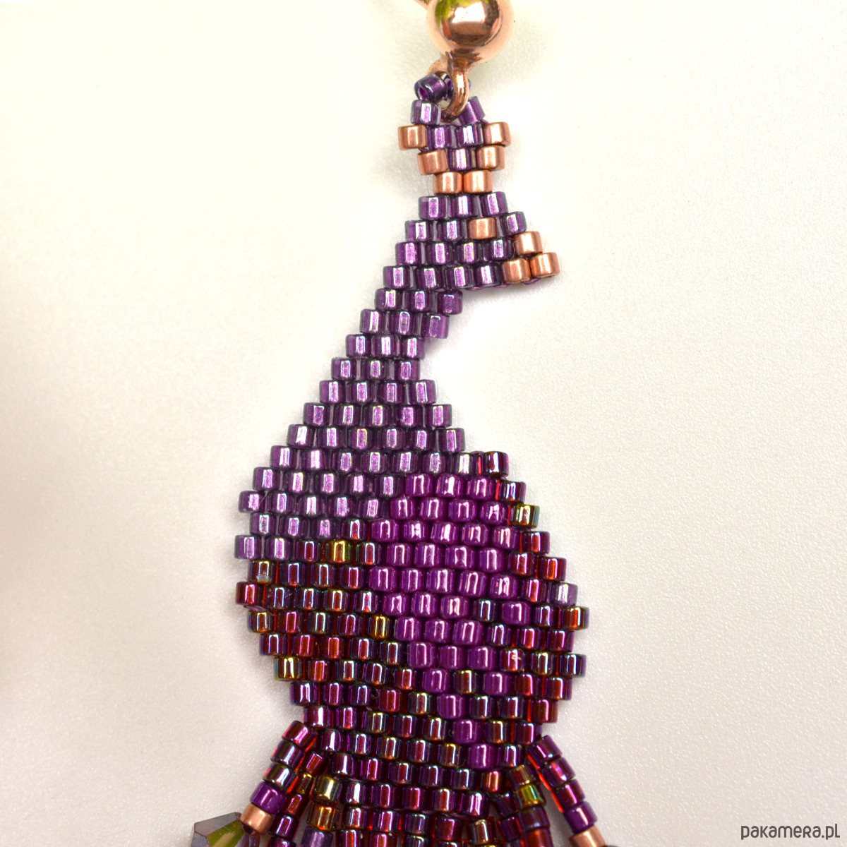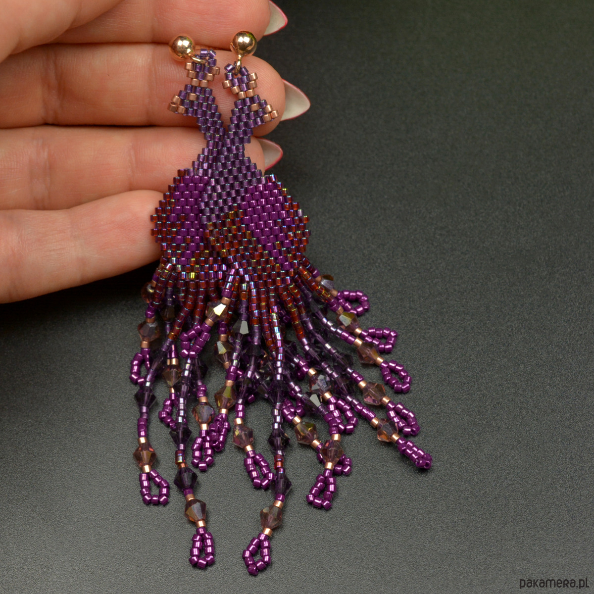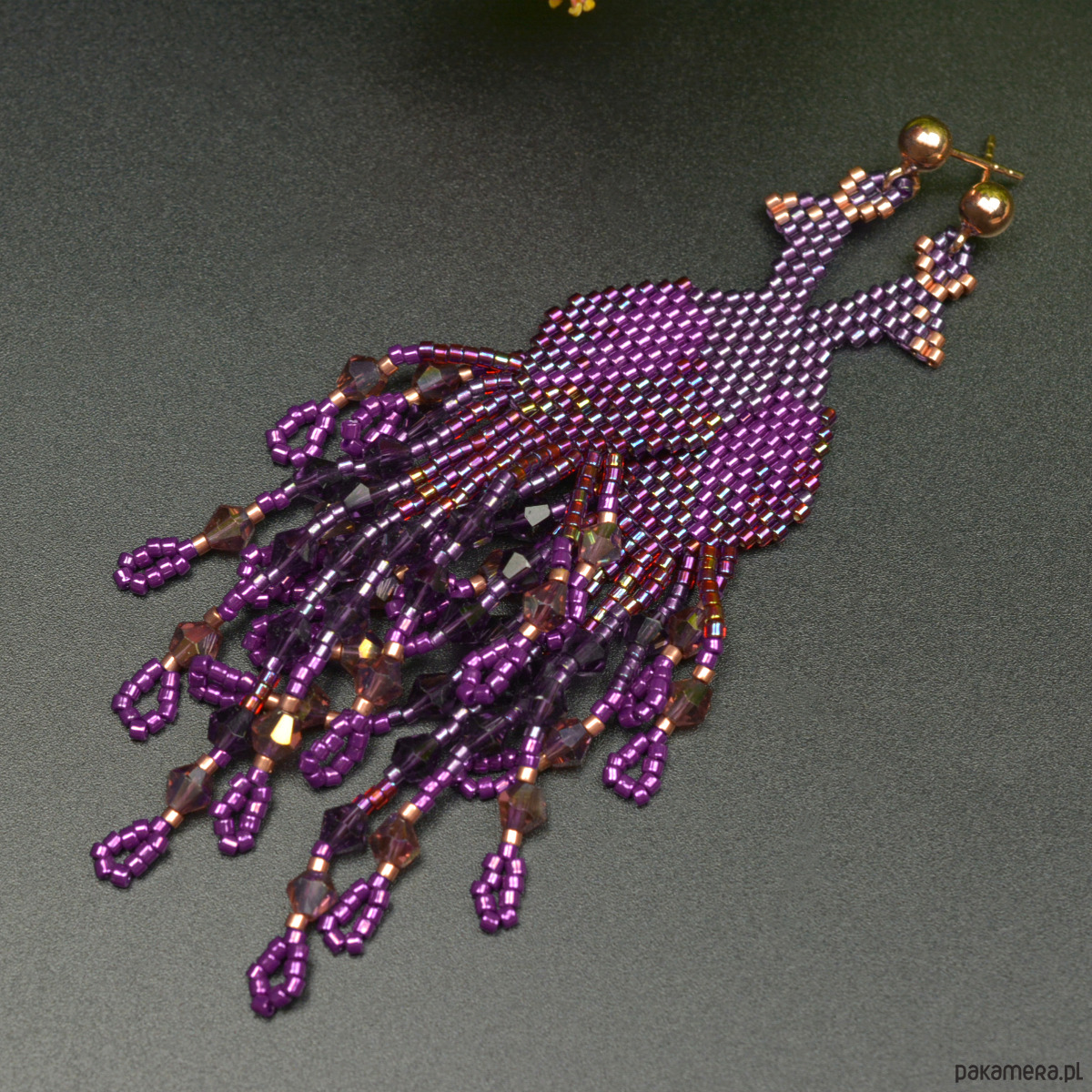 Wyplotłam je z najwyższej jakości japońskich koralików Toho i Miyuki w odcieniach fioletu złamanego różowym złotem, dodatkowo we frędzle wplotłam fasetowane kryształki.