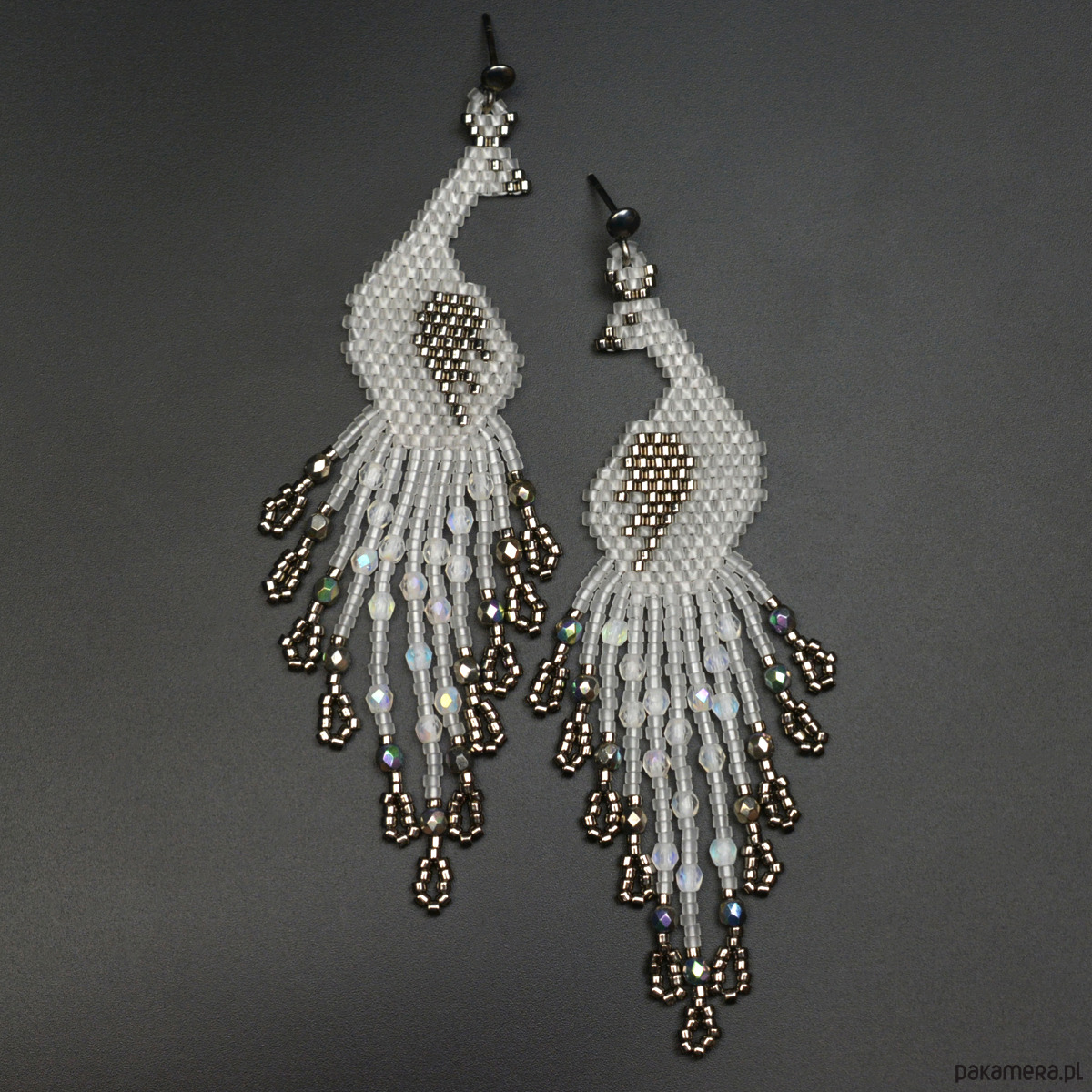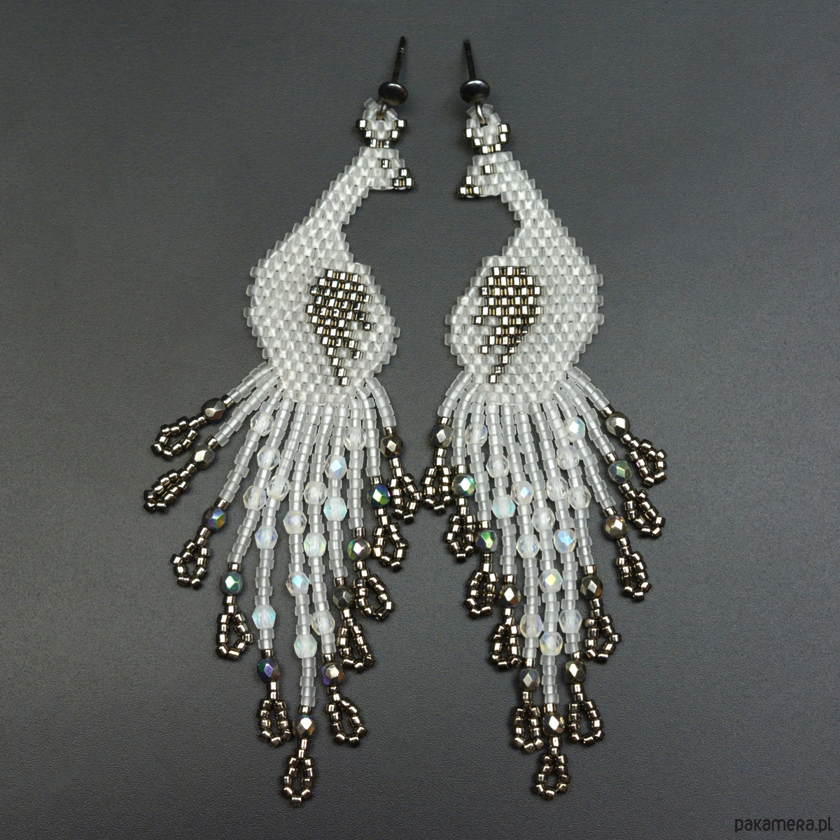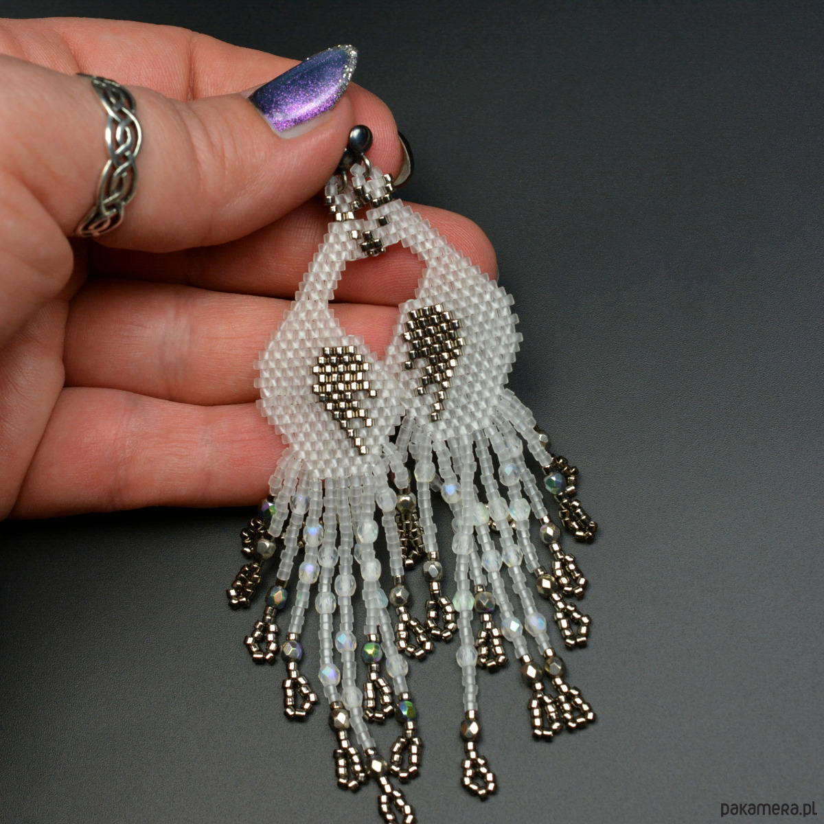 Wyplotłam je z najwyższej jakości japońskich koralików Toho w kolorze przezroczystym z matowym wykończeniem złamanym metalicznym starym srebrem. We frędzle wplotłam fasetowane czeskie kryształki fire polish z opalizującymi powłokami.