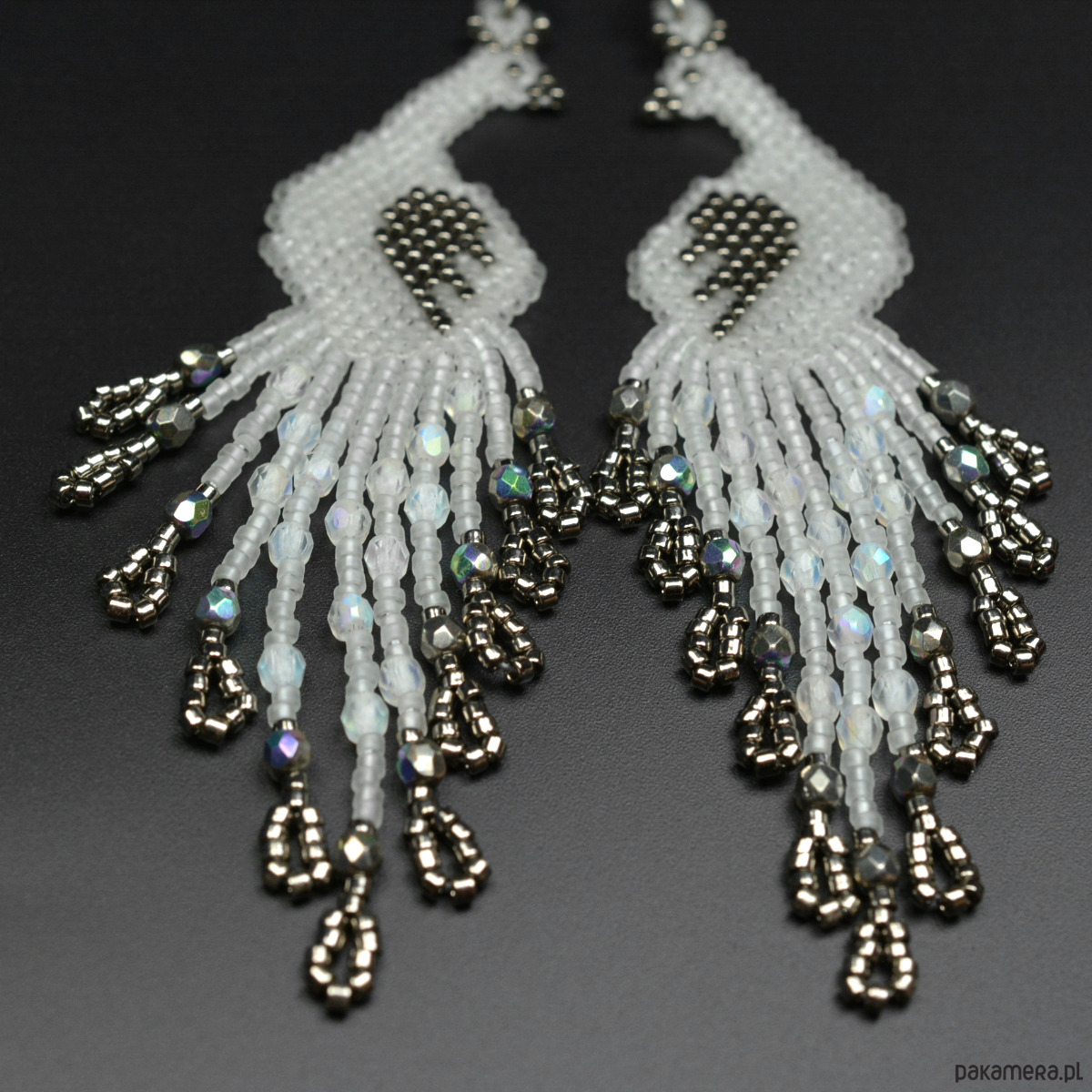 Pawie przezroczyste, kolczyki z frędzlami, beading
