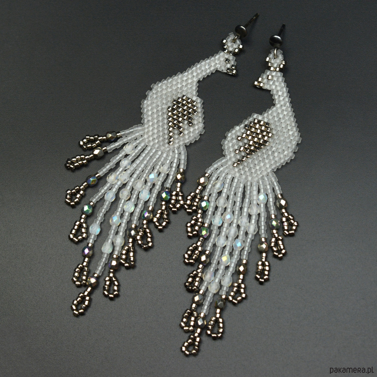 Kolczyki w kształcie pawi wykonane czasochłonną techniką beadingu.