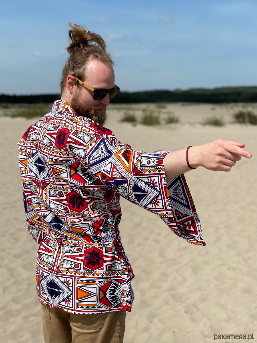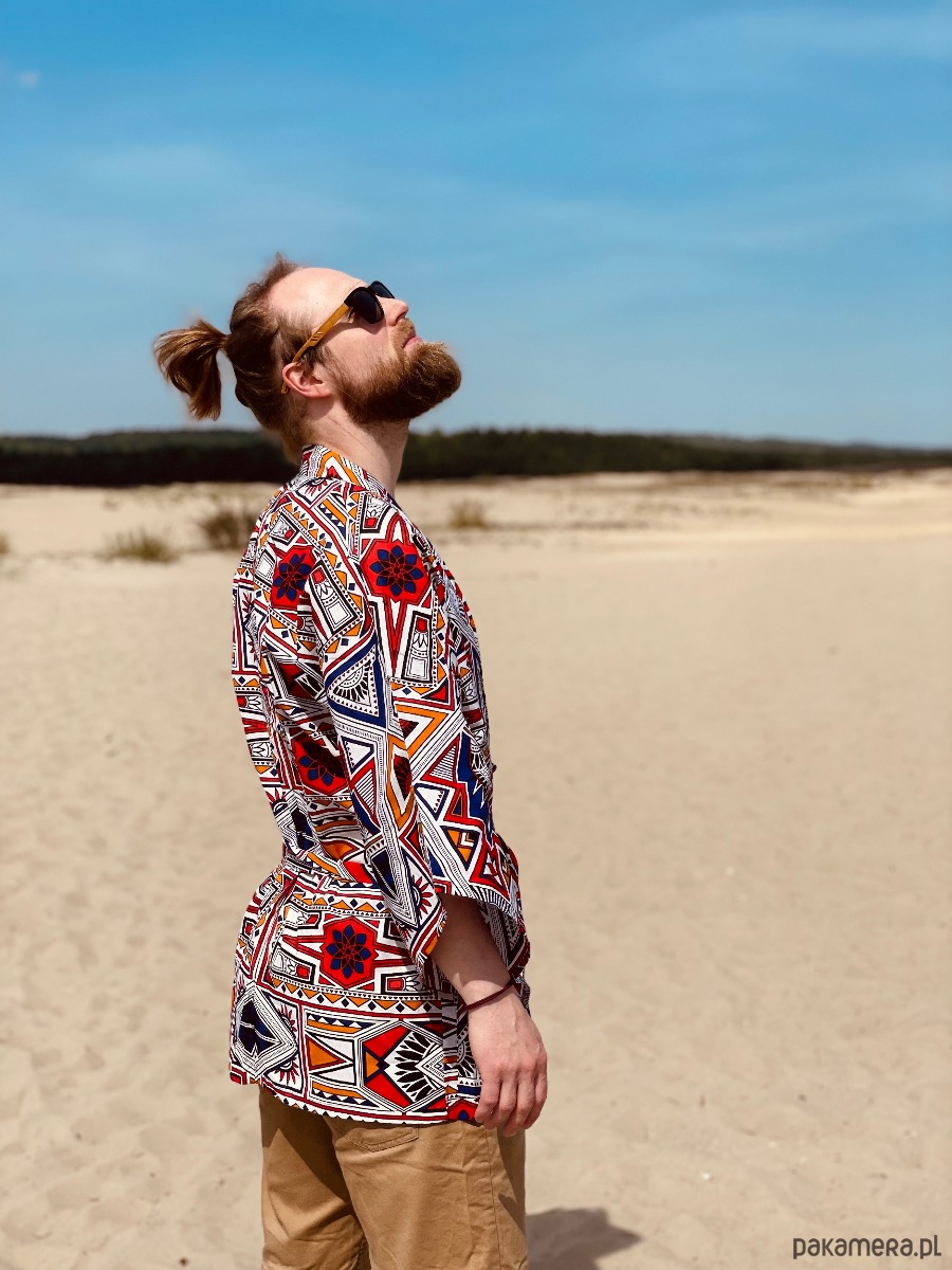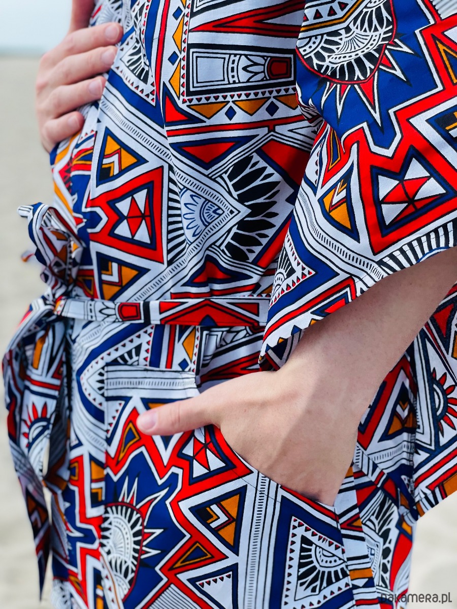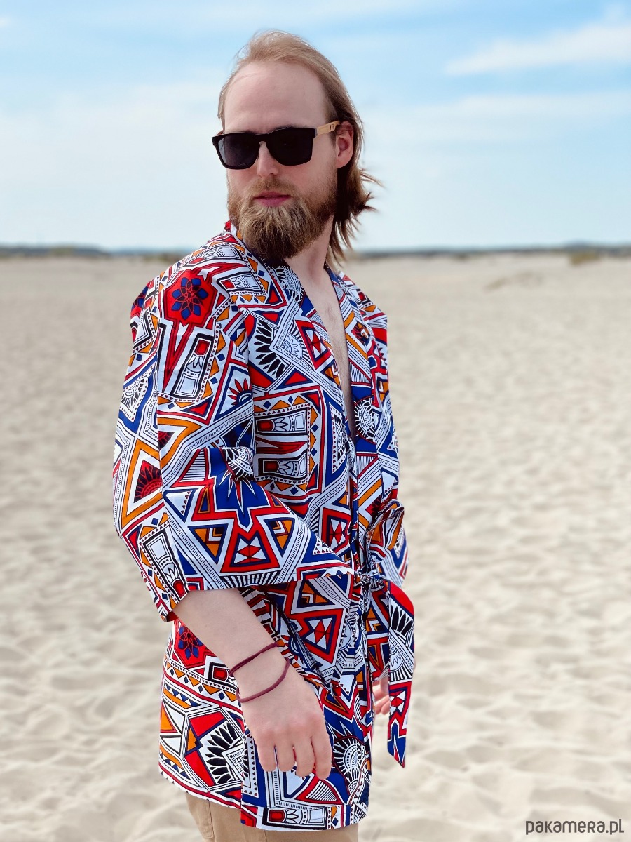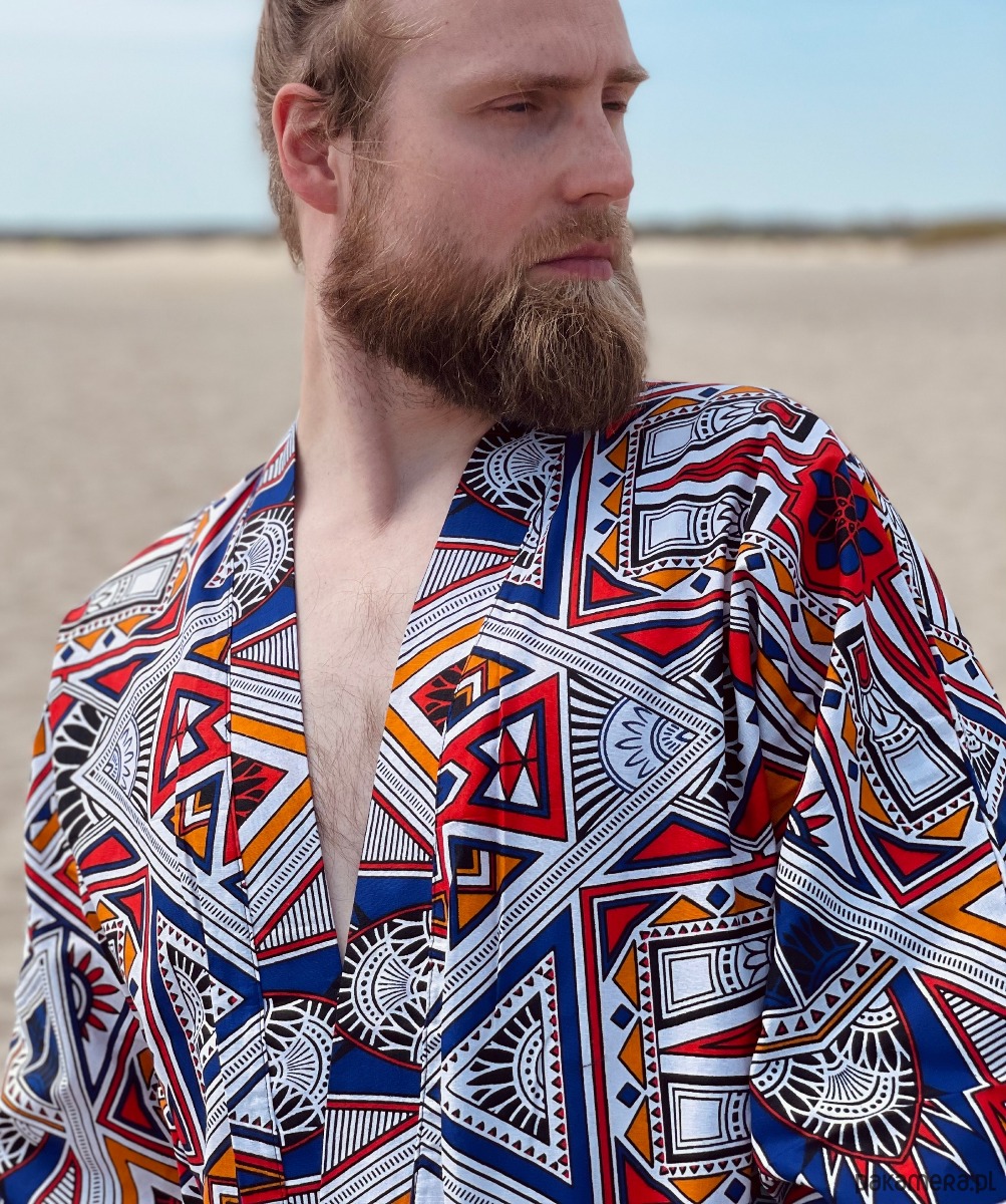 Wyjątkowej urody kimono Peace warrior zachwyca soczystością koloru, dwustronnym wzorem, wygodą i oryginalnością. Wykonane jest z dbałością o każdy szczegół z trwałej, bawełnianej tkaniny African Wax. Wzór na tkaninie powstał za pomocą tradycyjnej metody farbowania, inspirowanej batikiem.