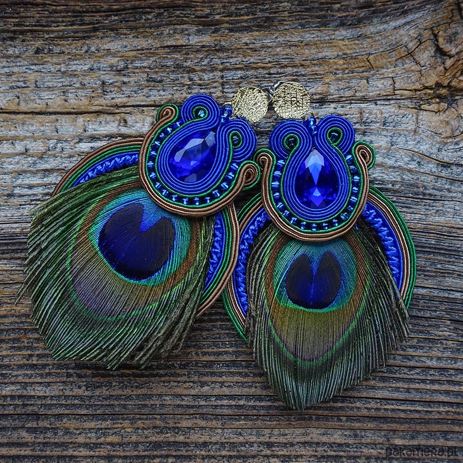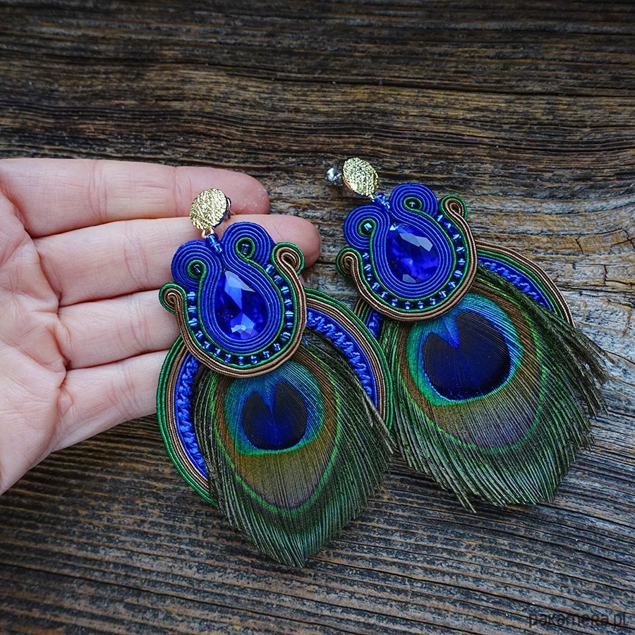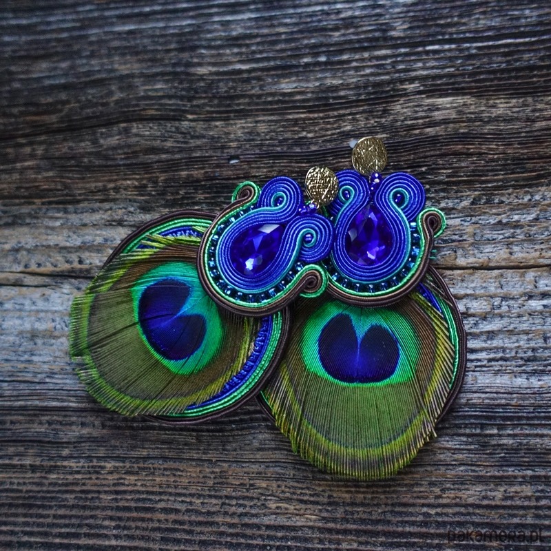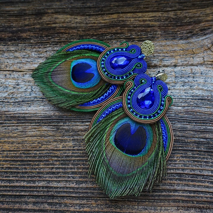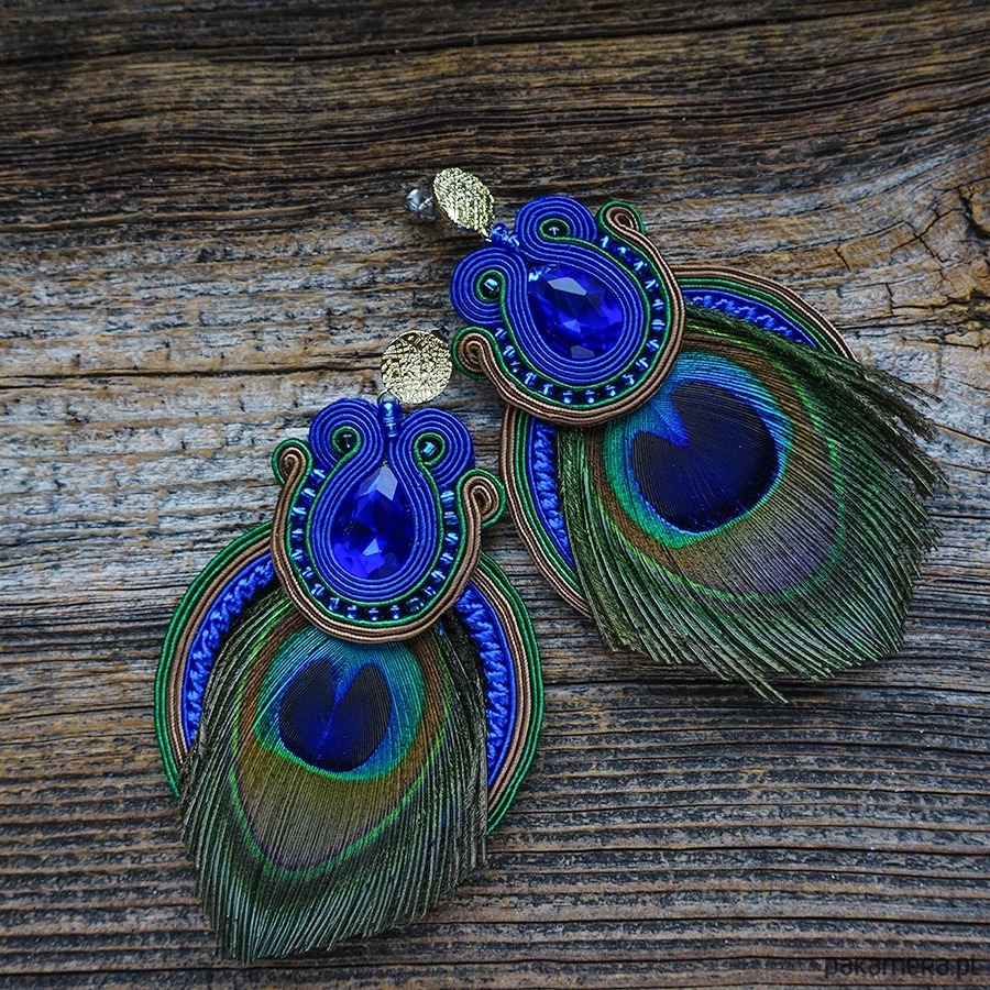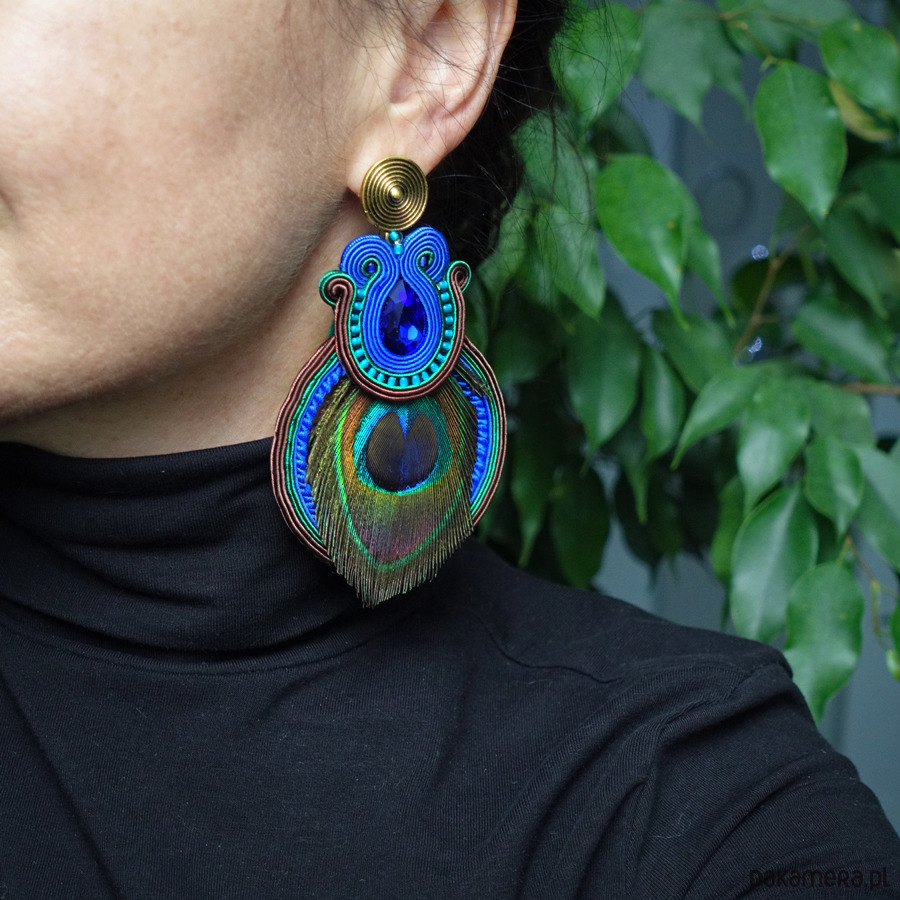 Kolczyki wykonane metodą haftu soutache, w efektownym rozmiarze large, przy zachowaniu niezwykłej lekkości i komfortu noszenia. Kompozycję tworzą starannie ułożone sznurki sutasz, szklane fasetowane kryształki oraz delikatne pawie pióra, które nadają całości wyrazistego, artystycznego charakteru. Strukturę wzoru dopełniają koraliki Toho oraz ozdobne metalowe sztyfty, podkreślając eleganckie wykończenie biżuterii.
