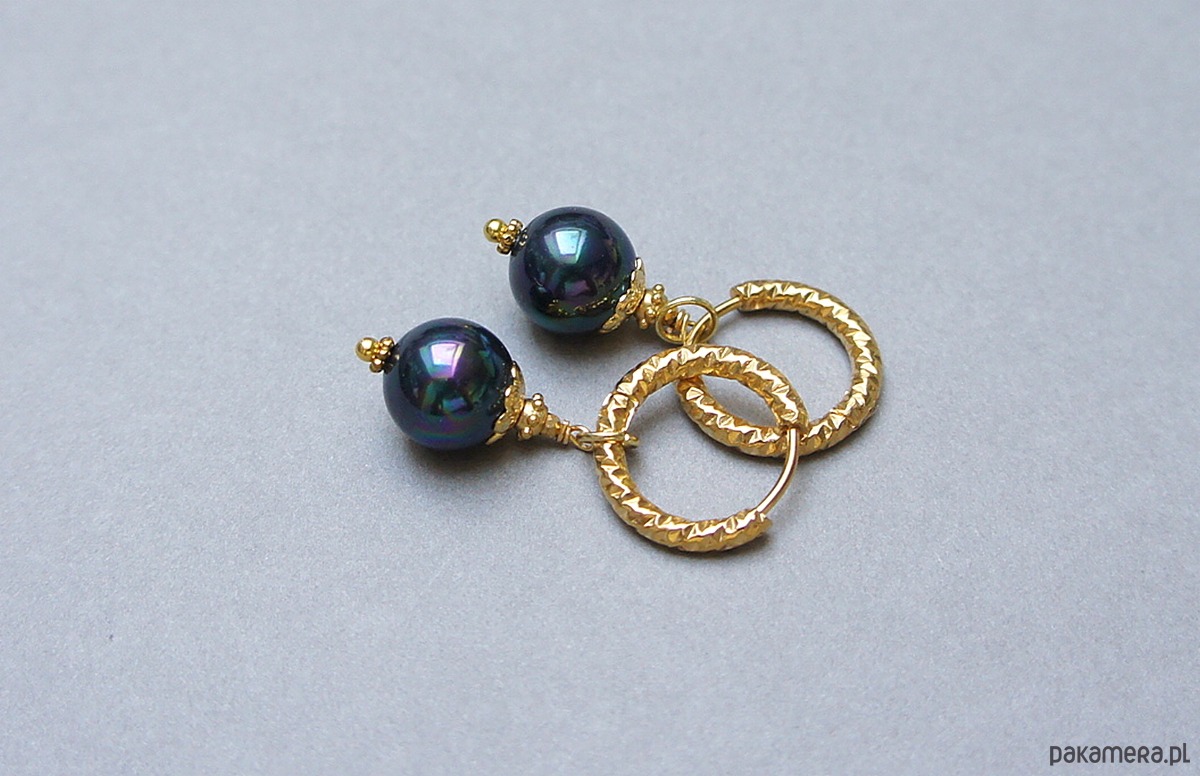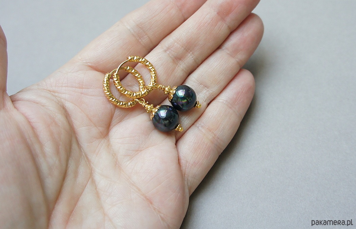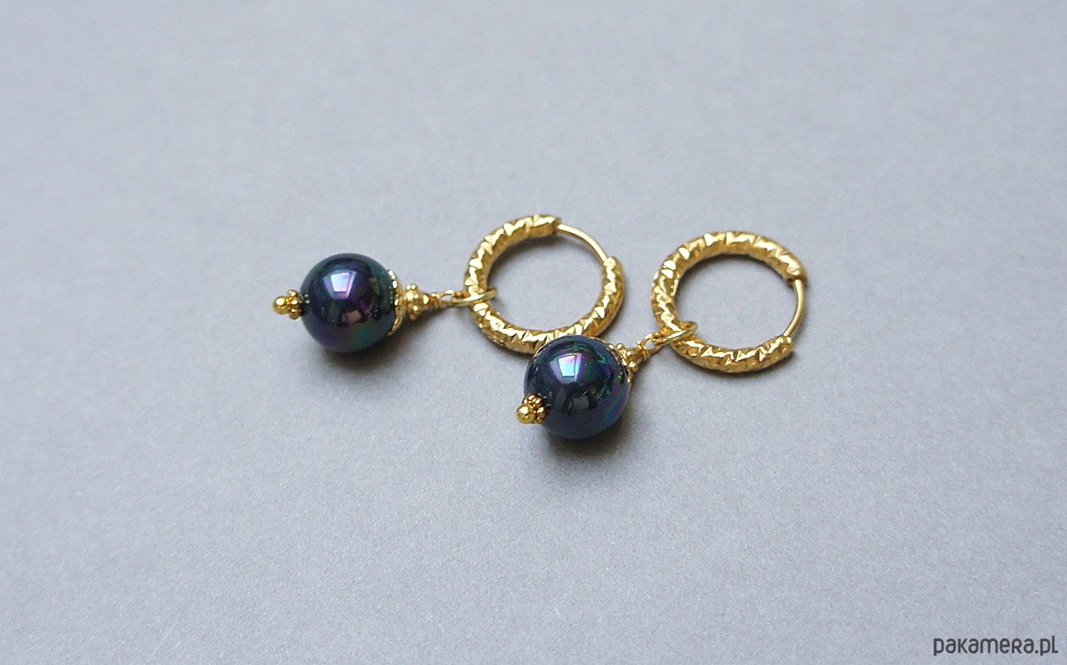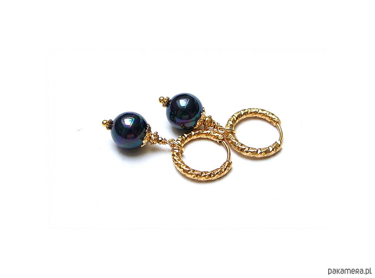 Eleganckie kolczyki wykonane z pereł seashell w kolorze granatowym [10mm] oraz z pozłacanej stali szlachetnej. Długość kolczyków: ok. 4cm. Biżuteria ozdobnie zapakowana.