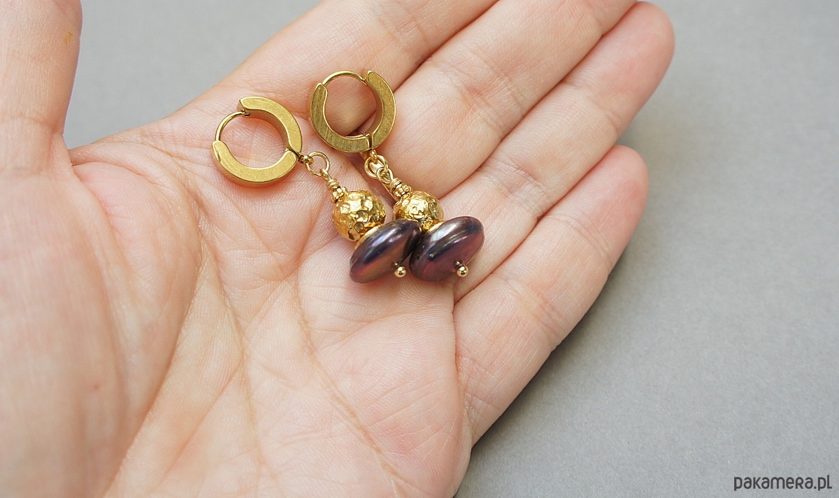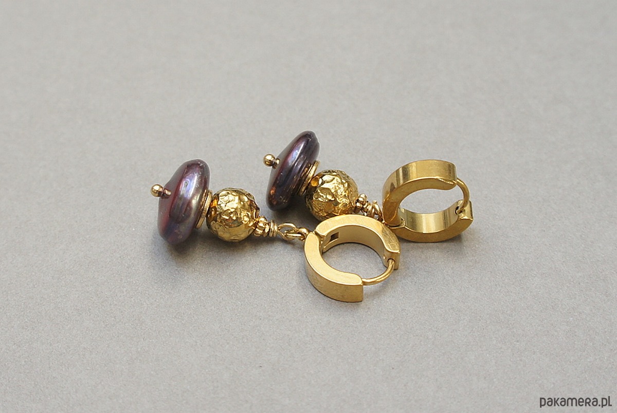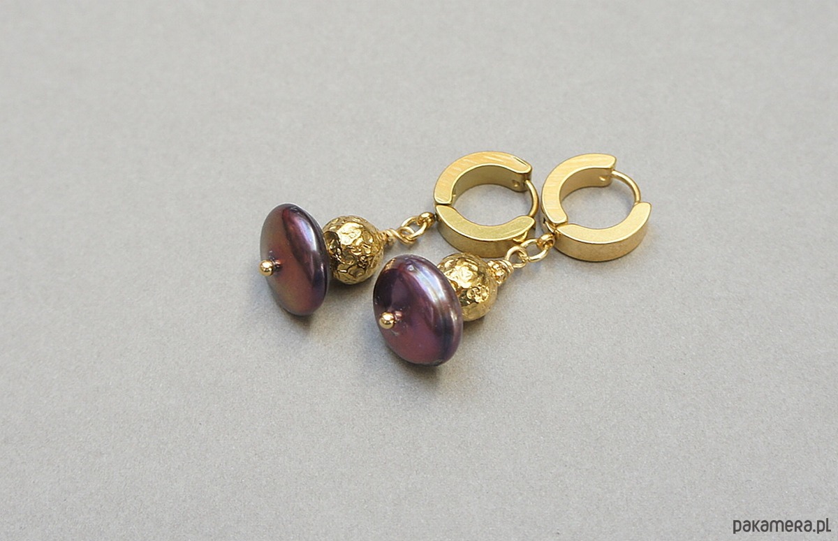 Eleganckie kolczyki wykonane z płaskich, fioletowych pereł naturalnych [12mm] oraz z pozłacanej stali szlachetnej. Długość kolczyków: ok. 3,8cm. Bigle kajdanki. Biżuteria ozdobnie zapakowana.