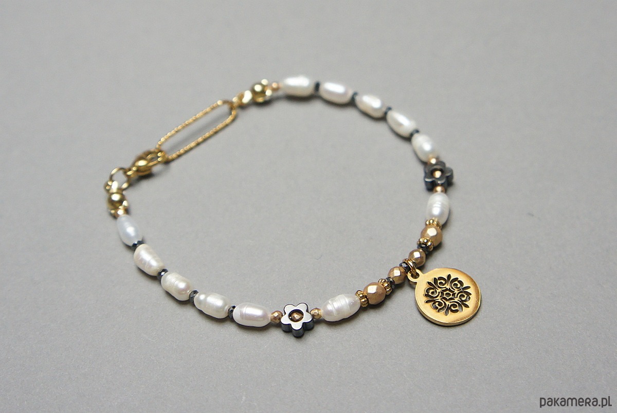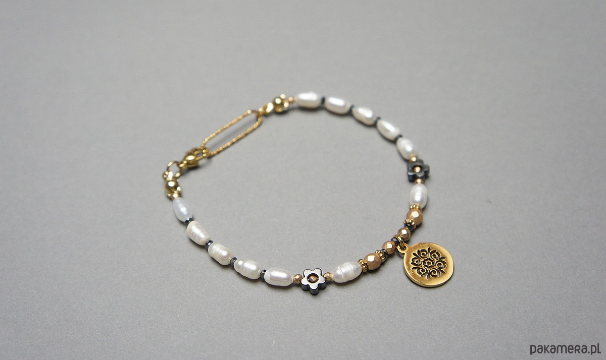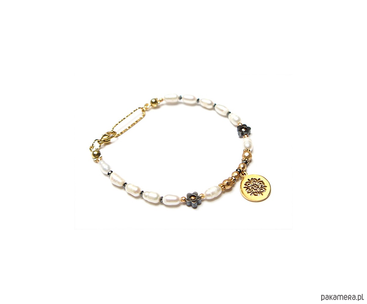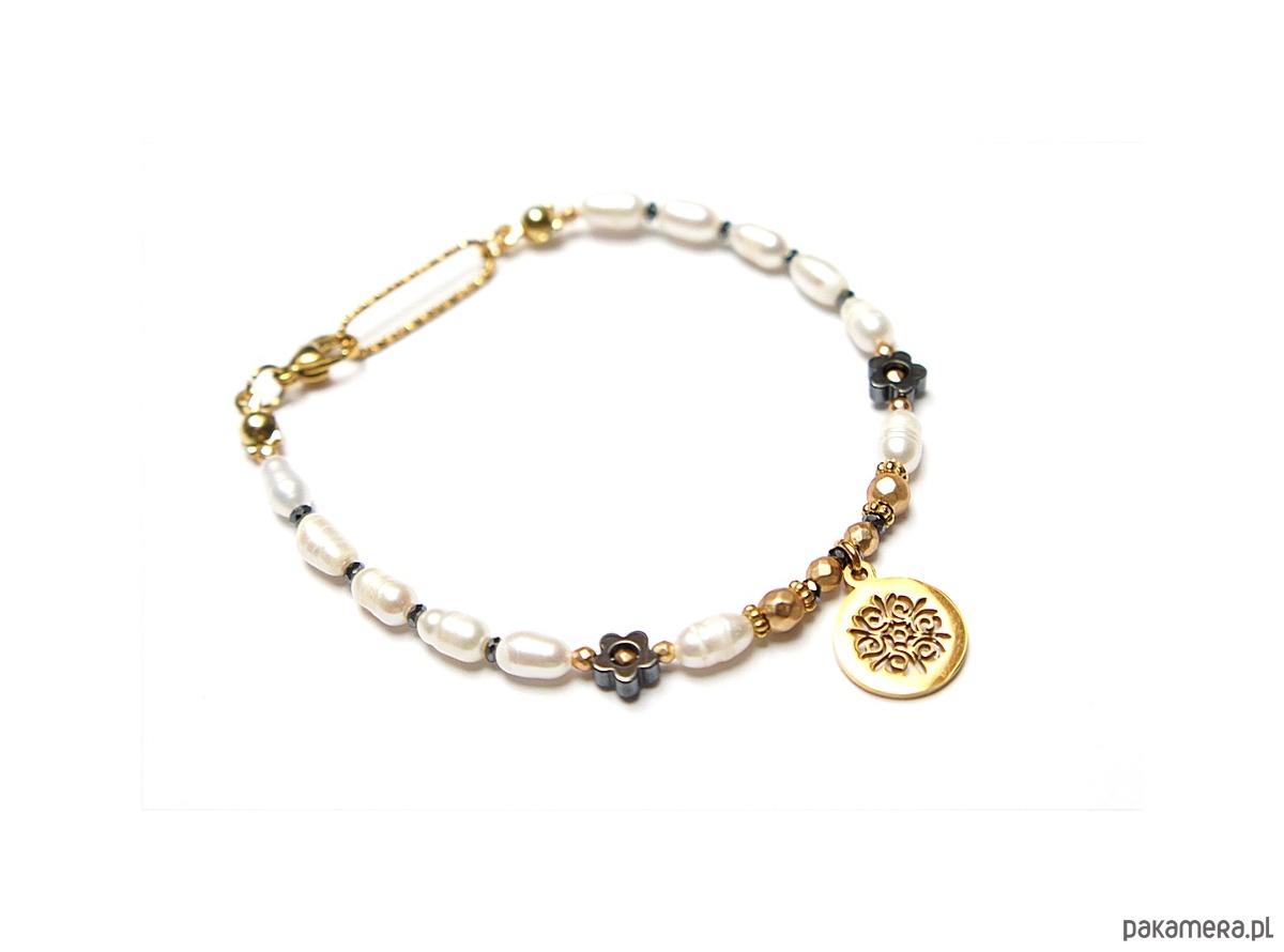 Delikatna bransoletka wykonana w całości naturalnych, słodkowodnych pereł [ok. 7mm], fasetowanych, platerowanych hematytów [2, 3 i 4mm], przekładek z hematytu [1mm oraz kwiatki 6mm] oraz z pozłacanej stali szlachetnej. Całkowita długość bransoletki 18,7cm.